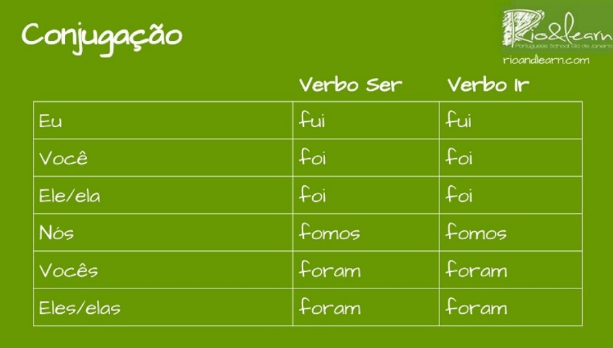 Qual é a diferença entre os Verbo Ser e Verbo Ir no Pretérito Perfeito? Para começar nossa conversa vamos aprender a diferença entre esses dois verbos. O verbo ser é usado para falar de como fomos no passado, como personalidade, características físicas etc. O verbo ir é usado para falar de lugares que já fomos. No geral é usado para falar mais de lugares e movimentações físicas. Agora, vamos aprender as conjugações do verbo ser e do verbo ir no pretérito perfeito: O verbo ser e o verbo ir no pretérito perfeito têm a mesma conjugação. Nós podemos ver a diferença entre eles pelo contexto. Sempre que usarmos o verbo ir, o contexto vai se referir a um lugar. Vamos ver algumas estruturas que mostram as diferenças entre o verbo ser e o verbo ir nesse passado pelo contexto: Exemplos com verbo Ser no Pretérito Perfeito O livro foi interessante. O argumento do professor foi muito bom. Eu nunca fui assaltado. Nós fomos bons amigos na escola. Exemplos com verbo Ir no Pretérito Perfeito Eles foram para a Europa no ano passado. Ele foi para a Dinamarca de férias. Ela já foram a São Paulo três vezes. Eu fui para a Argentina há um ano atrás.