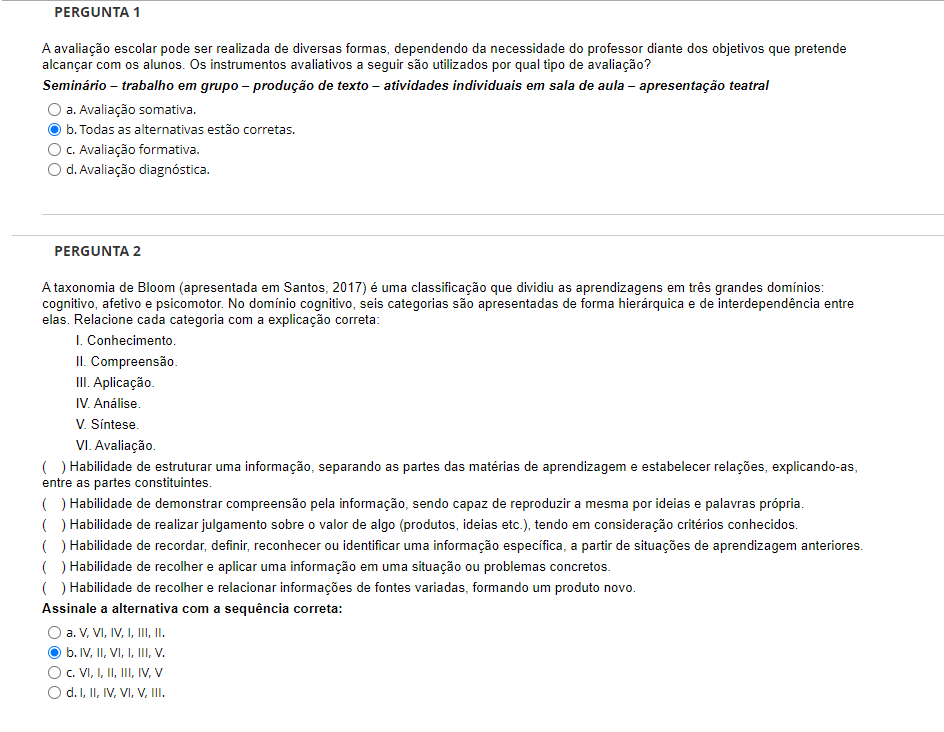 A taxonomia de Bloom (apresentada em Santos, 2017) é uma classificação que dividiu as aprendizagens em três grandes domínios: cognitivo, afetivo e psicomotor. No domínio cognitivo, seis categorias são apresentadas de forma hierárquica e de interdependência entre elas. Relacione cada categoria com a explicação correta: I. Conhecimento. II. Compreensão. III. Aplicação. IV. Análise. V. Síntese. VI. Avaliação. ( ) Habilidade de estruturar uma informação, separando as partes das matérias de aprendizagem e estabelecer relações, explicando-as, entre as partes constituintes. ( ) Habilidade de demonstrar compreensão pela informação, sendo capaz de reproduzir a mesma por ideias e palavras própria. ( ) Habilidade de realizar julgamento sobre o valor de algo (produtos, ideias etc.), tendo em consideração critérios conhecidos. ( ) Habilidade de recordar, definir, reconhecer ou identificar uma informação específica, a partir de situações de aprendizagem anteriores. ( ) Habilidade de recolher e aplicar uma informação em uma situação ou problemas concretos. ( ) Habilidade de recolher e relacionar informações de fontes variadas, formando um produto novo. a. V, VI, IV, I, III, II. b. IV, II, VI, I, III, V. c. VI, I, II, III, IV, V. d. II, IV, VI, V, III.