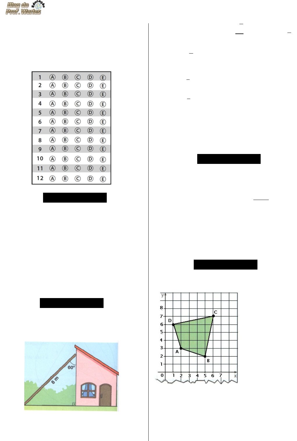 SIMULADO 6 – Matemática 3ª Série – Ensino Médio ––––––––––––––––––––––––––––––––––––––––––––––––––––––––––––––––––––––––––––––––––––––––––––––––––––– Colégio: ___________________- 3ª Série E.M Professor: _____________________ Nome: ____________________________ D4 ––––––––– QUESTÃO 01 –––––––––– Ao passar sua mão direita por todos os vértices e arestas de um octaedro, somente uma vez, um deficiente visual percebe que passou por 6 vértices e 12 arestas. Pela relação de Euler, F + V = A + 2, o número de faces desse poliedro é, então, igual a: (A) 20. (B) 12. (C) 8. (D) 6. (E) 4. D5 ––––––––– QUESTÃO 02 –––––––––––– Para consertar um telhado, o pedreiro Pedro colocou uma escada de 8 metros de comprimento numa parede, formando com ela um ângulo de 60º. Sabendo que: (, ). A altura da parede que o pedreiro apoiou a escada é: (A) 5 m. (B) m (C) 8 m. (D) m (E) 4 m D33 ––––––––– QUESTÃO 03 ––––––––––– Uma urna contém 10 bolas identificadas pelas letras, A, B, ..., J. Uma bola é extraída ao acaso da urna, e sua letra é observada. A probabilidade de a letra ser uma vogal é: (A) 10% (B) 5% (C) 30 % (D) 50% (E) 40% D6 ––––––––– QUESTÃO 04 –––––––––––– Quatro cidades de grande expressão no setor industrial estão situadas nos pontos do quadrilátero abaixo. As coordenadas que representam as cidades A, B, C e D, respectivamente, são: (A) (1, 6), (6, 7), (5, 2), (4, 3) (B) (6, 1), (7, 6), (2, 5), (3, 4) (C) (6, 7), (1, 6), (2, 5), (3, 4) (D) (4, 3), (5, 2), (6, 7), (1, 6), (E) (–6, 1), (–7, 6), (–2, –5), (3, 4) D14 ––––––––– QUESTÃO 05 ––––––––––– Um professor de matemática representou geometricamente os números reais 0, x, y e 1 numa reta numérica. A posição do número x·y é: (A) à esquerda de 0. (B) entre 0 e x. (C) entre x e y. (D) entre y e 1. (E) à direita de 1. D15 ––––––––– QUESTÃO 06 ––––––––––– Marcio contratou 5 operários para construir sua casa. Esses operários, trabalhando 8 horas por dia, levarão 150 dias para terminar a construção. Mantendo o mesmo ritmo de trabalho, 8 operários, trabalhando 10 horas por dia, terminam a mesma obra em: (A) 75 dias. (B) 300 dias. (C) 192 dias. (D) 100 dias. (E) 125 dias. D21 ––––––––– QUESTÃO 07 ––––––––––– Um boato tem um público alvo e alastra-se com determinada rapidez. Em geral, essa rapidez é diretamente proporcional ao número de pessoas desse público que conhecem o boato e diretamente proporcional também ao número de pessoas que não o conhecem. Em outras palavras, sendo R a rapidez de propagação, P o público alvo e x o número de pessoas que conhecem o boato, tem-se: , em que k é uma constante positiva característica do boato. O gráfico cartesiano que melhor representa a função R(x), para x real, é: D22 ––––––––– QUESTÃO 08 ––––––––––– Num programa de condicionamento físico, um atleta corre sempre 200m a mais do que correu no dia anterior. O termo que ocupa a posição n em uma progressão aritmética (PA) de razão r é dado pela fórmula . Sabe-se que no 1º dia ele correu 500 metros. Em 10 dias correrá: (A) 10.180 metros. (B) 4.700 metros. (C) 2.700 metros. (D) 5.000 metros. (E) 2.300 metros. D23 ––––––––– QUESTÃO 09 ––––––––––– Marcos Aurélio pegou um táxi comum, que cobra R$ 3,20 pela bandeira e R$ 1,20 por quilometro rodado, para ir à casa de sua namorada, que fica a 18 km de distância. A função que representa esta situação é , onde V é o valor pago e D a distância percorrida. O melhor gráfico que representa está situação é: D24 ––––––––– QUESTÃO 10 ––––––––––– Os mecânicos de um carro de fórmula 1 durante um abastecimento perceberam que o tanque tinha 8 litros de gasolina. A bomba injetava 3 litros por segundo. O gráfico abaixo representa esta situação. A expressão algébrica que representa a função esboçada é: (A) (B) (C) (D) (E) D25 ––––––––– QUESTÃO 11 ––––––––––– Uma bola colocada no chão é chutada para o alto, percorre uma trajetória descrita por , onde y é a altura e x é o alcance, em metros, está representada no gráfico abaixo. Nessas condições, a altura máxima atingida pela bala é (A) 48 metros. (B) 144 metros. (C) 18 metros. (D) 72 metros. (E) 36 metros. D34 ––––––––– QUESTÃO 12 ––––––––––– No gráfico abaixo, mostra-se como variou o valor do dólar, em relação ao real, entre o final de 2001 e o inicio de 2005. Por exemplo, em janeiro de 2002, um dólar valia cerca de R$ 2,40. Banco central Durante esse período, a época em que o real esteve mais desvalorizado em relação ao dólar foi no: (A) final de 2001; (B) final de 2002; (C) início de 2003; (D) final de 2004; (E) início de 2005. 2 3 ) º 60 ( = sen ) ( ) ( x P x k x R - × = r n a a n × - + = ) 1 ( 1 D x V 20 , 1 20 , 3 ) ( + = 8 3 ) ( + × = t t V 3 8 ) ( + × = t t V 26 6 ) ( + × = t t V 26 8 ) ( + × = t t V 6 2 ) ( + × = t t V x x y 12 2 2 + - = 3 ) º 60 ( = tg 2 1 ) º 60 cos( = 3 4 3 8