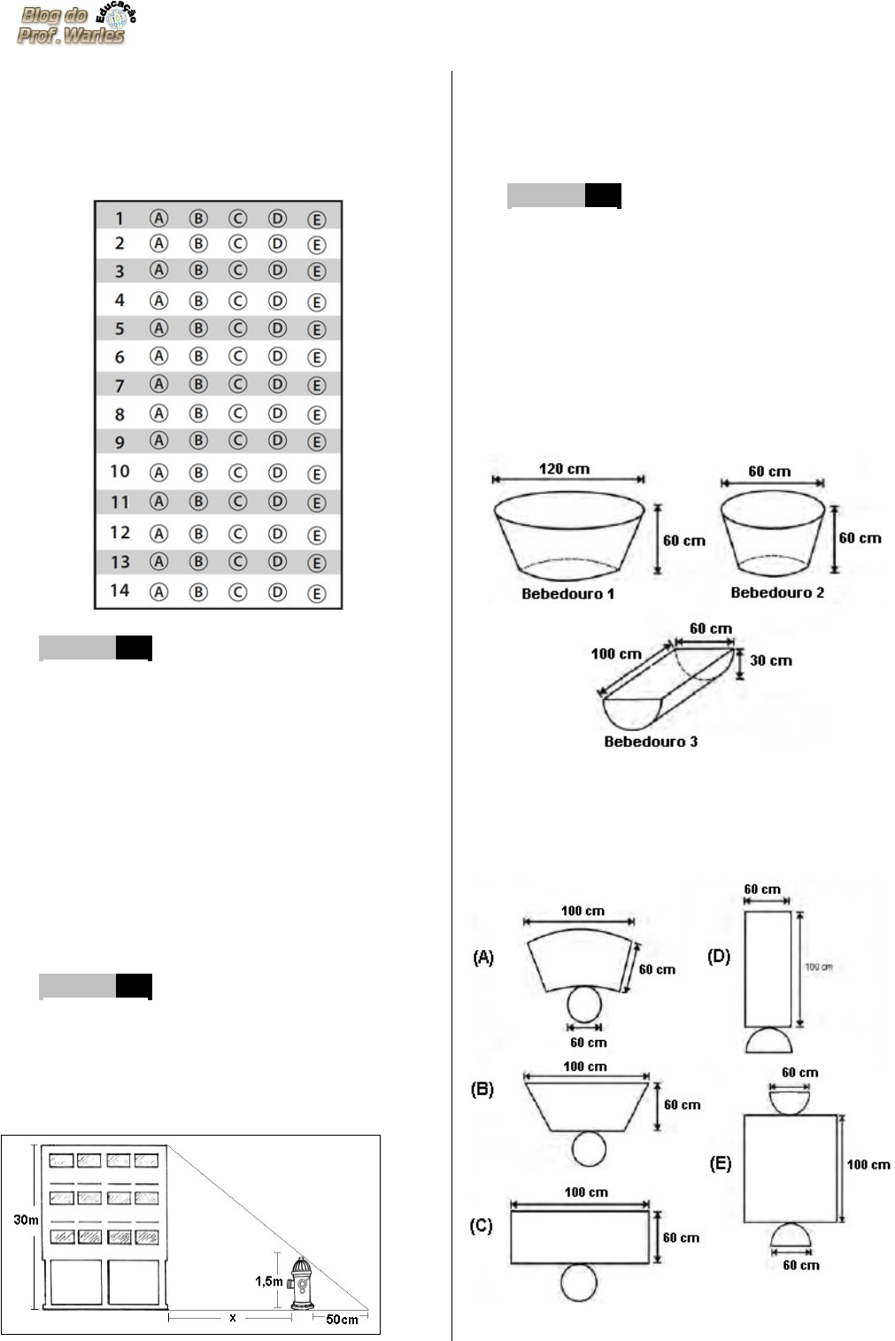 SIMULADO 4º Bimestre – Matemática 3ª Série – Ensino Médio – Colégio Estadual Brasil - GO ––––––––––––––––––––––––––––––––––––––––––––––––––––––––––––––––––––––––––––––––––––––––––––––––––––– Escola: ____________________________ Prof.: ______________________________ Nome: _____________________________ D1 Questão 1 ––––––––––––––––––––––––––––––| Uma empresa gasta 1,5 kg de açúcar por semana, para cada 7 empregados que tomam cafezinho e suco durante a jornada de trabalho. Nesse caso, se essa empresa gasta, por semana, 9 kg de açúcar para adoçar cafezinho e suco para seus empregados, então a quantidade de empregados da empresa que tomam cafezinho e suco é igual a (A) 11. (B) 42. (C) 53. (D) 63. (E) 17 D2 Questão 2 ––––––––––––––––––––––––––––––| Pela figura abaixo, é possível perceber que as alturas do edifício e do hidrante são, respectivamente, de 30 metros e 1,5 metro. Se a sombra do hidrante mede 50 centímetros, quanto mede a distância do prédio ao hidrante em metros? A) 5,5 B) 7,0 C) 8,5 D) 9,0 E) 9,5 D3 Questão 3 ––––––––––––––––––––––––––––––| Alguns testes de preferência por bebedouros de água foram realizados com bovinos, envolvendo três tipos de bebedouros, de formatos e tamanhos diferentes. Os bebedouros 1 e 2 têm a forma de um tronco de cone circular reto, de altura igual a 60 cm, e diâmetro da base superior igual a 120 cm e 60 cm, respectivamente. O bebedouro 3 é um semicilindro, com 30 cm de altura, 100 cm de comprimento e 60 cm de largura. Os três recipientes estão ilustrados na figura. A escolho do bebedouro. In: Biotemas. V. 22, nº. 4, 2009 (adaptado). (ENEM 2010) Considerando que nenhum dos recipientes tenha tampa, qual das figuras a seguir representa uma planificação para o bebedouro 3? D8 Questão 4 ––––––––––––––––––––––––––––––| Marcos é arquiteto e projetou um novo bairro sobre um plano cartesiano. Ele posicionou numa mesma rua, a Escola no ponto A (2, 3) e o Posto de Saúde no ponto B (3, 5). Qual é a equação da reta que representa essa rua? A) y = 2x - 1 B) y = 2x + 1 C) y = x + 1 D) y = x + 2 E) y = x – 2 D6 Questão 5 ––––––––––––––––––––––––––––––| Veja o plano cartesiano abaixo. Os pontos correspondentes aos pares ordenados (2, –2) e (–1, 1) são, nessa ordem, A) P e R B) T e R C) P e U D) T e U E) R e P. D11 Questão 6 ––––––––––––––––––––––––––––––| A piscina de um hotel recebeu uma grade de proteção na faixa indicada na figura abaixo. O comprimento total dessa grade é A) 84 m B) 68 m C) 38 m D) 30 m E) 12 m D14 Questão 7 ––––––––––––––––––––––––––––––| A figura abaixo representa uma parte de uma reta numérica. Observe. Nessa figura, qual é o número correspondente ao ponto A? A) -25 B) -20 C) -4 D) 20 E) 25 D16 Questão 8 ––––––––––––––––––––––––––––––| (www.concursosolução.com.br). Em um concurso público cuja prova seja composta de 60 questões, o candidato que acertar 42 destas questões obterá qual porcentual de acertos? (A) 30% (B) 55% (C) 42% (D) 70% (E) 60% D18 Questão 9 ––––––––––––––––––––––––––––––| Uma loja que aluga ferramentas costuma cobrar o aluguel de suas mercadorias de acordo com a tabela abaixo: Entre as equações abaixo, a que melhor representa a situação da tabela acima é: (A) (B) (C) (D) (E) D22 Questão 10 ––––––––––––––––––––––––––––| O número mensal de passagens de uma determinada empresa aérea aumentou no ano passado nas seguintes condições: em janeiro foram vendidas 33.000 passagens; em fevereiro, 34.500; em março, 36.000. Esse padrão de crescimento se mantém para os meses subsequentes. Quantas passagens foram vendidas por essa empresa em julho do ano passado? (Se necessário use: ). (A) 38.000 (B) 40.500 (C) 41.000 (D) 42.000 (E) 48.000 D33 Questão 11 ––––––––––––––––––––––––––––| Observe o resultado de uma pesquisa na classe de Júlia. Escolhendo um aluno dessa classe, ao acaso, qual a probabilidade de que ele tenha computador? (A) (B) (C) (D) (E) D34 Questão 12 ––––––––––––––––––––––––––––| Severina foi ao mercado com R$ 3,00 para comprar 2 kg de feijão. Lá chegando, viu o cartaz: Como os preços estavam mais baixo, Severina recebeu troco. Com esse troco ela poderia comprar: (A) 0,5 kg de arroz. (B) 0,5 kg de batata (C) 1,0 kg de batata (D) 1,0 kg de tomate (E) 1,5 kg de mandioca D34 Questão 13 ––––––––––––––––––––––––––––| O gráfico mostra os gols marcados e os gols sofridos pela equipe P nas 10 partidas do campeonato interno de futebol de um presídio. Analisando-se esse gráfico, é correto afirmar que, nesse campeonato, a equipe P (A) teve somente dois empates. (B) não sofreu gols somente em 3 partidas. (C) teve mais derrotas do que empates. (D) marcou 2 gols a mais que o adversário somente na 6.ª partida. (E) marcou, em média, 1,7 gol por partida. D18 Questão 14 ––––––––––––––––––––––––––––| Os mecânicos de um carro de fórmula 1 durante um abastecimento perceberam que o tanque tinha 8 litros de gasolina. A bomba injetava 3 litros por segund
