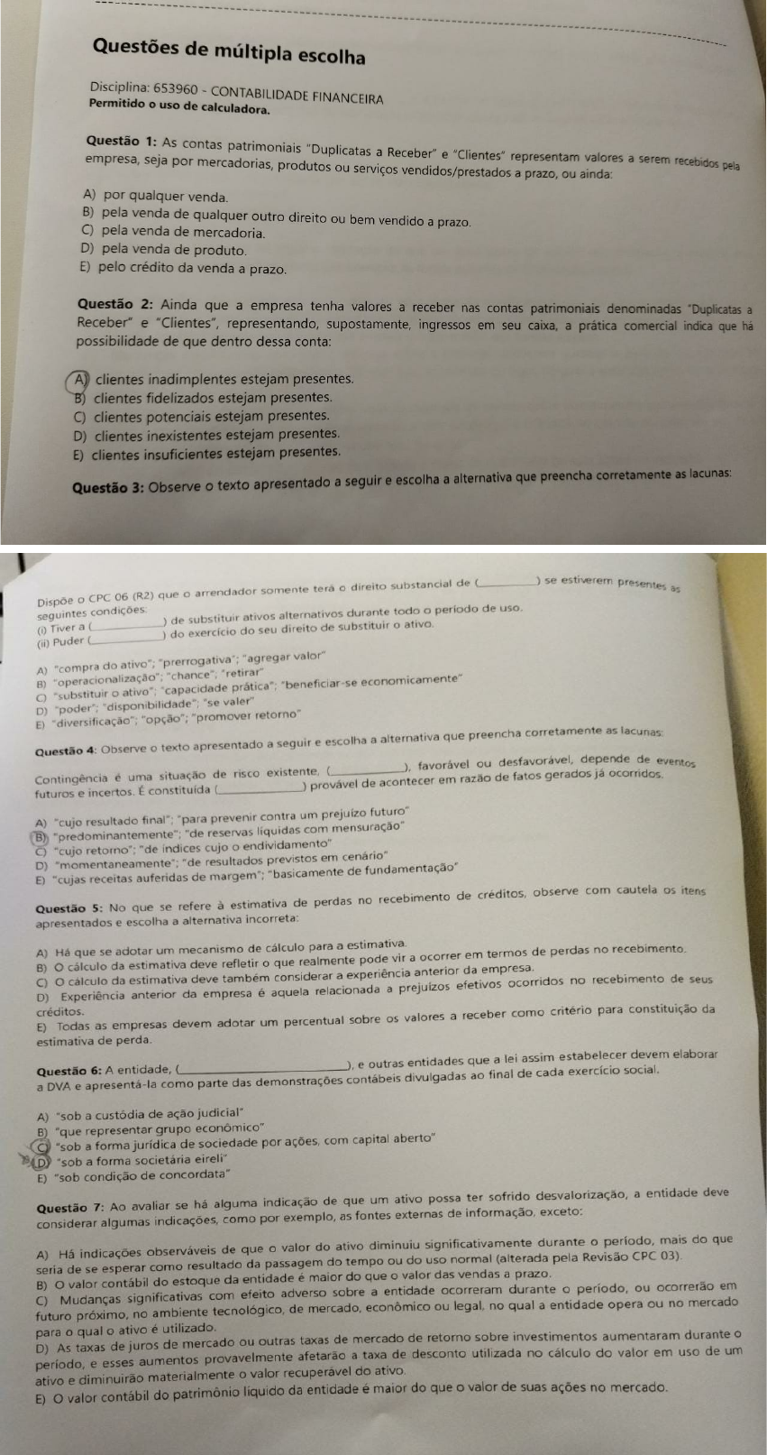MODELO 03 1 – As Contas patrimoniais “Duplicatas a receber” e “Clientes” representam valores a serem recebidos pela empresa, seja por mercadorias, produtos ou serviços vendidos/prestados a prazo, ou ainda: B) Pela venda de qualquer outro direito ou bem vendido a prazo 2 – Ainda que a empresa tenha valores a receber nas contas patrimoniais denominadas “Duplicatas a Receber” e “Clientes”, representando, supostamente, ingressos em seu caixa, a prática comercial indica que há possibilidade de que dentro dessa conta: A) Clientes inadimplentes estejam presentes. 3 – Observe o texto apresentado a seguir e escolha a alternativa que preencha corretamente as lacunas: Dispõe o CPC 06 (R2) que o arrendados somente terá o direito substancial de (______) se estiverem presentes as seguintes condições: (I) Tiver a (______)de substituir ativos alternativos durante todo o período de uso. (ii) Puder(______)de exercício do seu direito de substituir o ativo. C) “Substituir o ativo”, “capacidade pratica”, “beneficiar-se economicamente” 4 – Observe o texto apresentado a seguir e escolha a alternativa que preencha corretamente as lacunas: Contingência é uma situação de risco existente (_______), favorável ou desfavorável, depende de eventos futuros e incertos. É constituída (_______) provável de acontecer em razão de fatos gerados já ocorridos. A) “Cujo resultado final”, “para prevenir conta um prejuízo futuro” 5 – No que se refere à estimativa de perdas no recebimento de créditos, observe com cautela os itens apresentados e escolha a alternativa incorreta: A) Há que se adotar um mecanismo de cálculo para a estimativa 6 – A entidade, (_______), e outras entidades que a lei assim estabelecer devem elaborar a DVA e apresentá-la como parte das demonstrações contábeis divulgadas ao final de cada exercício social. C) ”sob a forma jurídica de sociedade por ações, com capital aberto” 7 – Ao avaliar se há alguma indicação de que um ativo possa ter sofrido desvalorização, a entidade deve considerar algumas indicações, como por exemplo, as fontes externas de informações, exceto: B) O valor contábil do estoque da entidade é maior do que o valor das vendas a prazo 8 – A base elementar da contabilização dos estoques é o custo. Nocaso de produtos adquiridos para revenda de matérias-primas ou de tipos de materiais utilizados no processo de produção, tal custo é o de aquisição dos itens acrescidos dos gastos relacionados à: B) Aquisição e excluídos os tributos recuperáveis