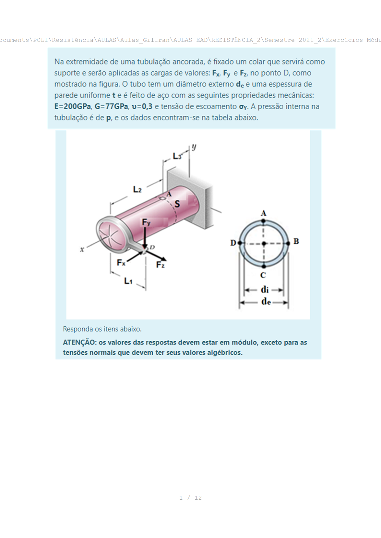 Prova N2 (A5) - RESISTENCIA DOS MATERIAIS - GR2996 A+ Questão 03 1 PONTO i É importante para engenheiros e projetistas conhecer as tensões atuando ...