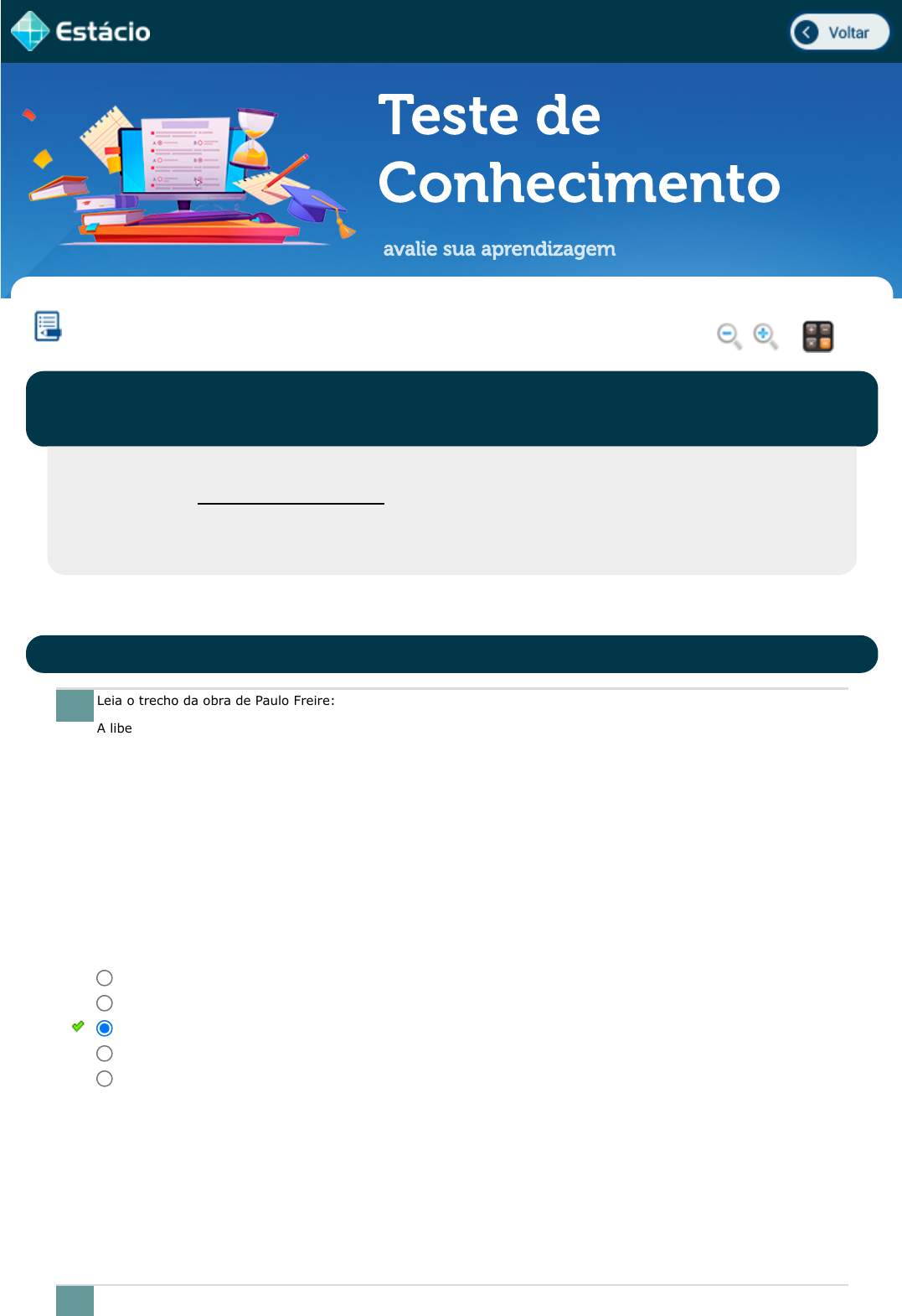 Teste de Conhecimento avalie sua aprendizagem Leia o trecho da obra de Paulo Freire: A libertação, por isto, é um parto. E um parto doloroso. O homem que nasce deste parto é um homem novo que só é viável na e pela superação da contradição opressores-oprimidos, que é a libertação de todos. A superação da contradição é o parto que traz ao mundo este homem novo não mais opressor; não mais oprimido, mas homem libertando-se. FREIRE, Paulo - Pedagogia do Oprimido. São Paulo: Paz e Terra. Avalie as asserções a seguir e suas relações partindo da leitura do texto. I. Na percepção da diversidade, esse novo sujeito consegue se libertar. Porque II. Precisa superar a estrutura de opressão que limita o reconhecimento das subjetividades dos alunos da EJA. A respeitos dessas asserções, marque a resposta correta. Ao dizer que estamos reafirmando as identidades dos alunos na EJA, oportunizamos: FUND. DA EDUC. DE JOVENS E ADULTOS E EDUC. POPULAR Lupa Calc. DGT0292_202204268469_TEMAS Aluno: SILVIO LUIZ FERNANDES JÚNIOR Matr.: 202204268469 Disc.: FUND. DA EDUC. DE 2022.2 FLEX (G) / EX Prezado (a) Aluno(a), Você fará agora seu TESTE DE CONHECIMENTO! Lembre-se que este exercício é opcional, mas não valerá ponto para sua avaliação. O mesmo será composto de questões de múltipla escolha. Após responde cada questão, você terá acesso ao gabarito comentado e/ou à explicação da mesma. Aproveite para se familiarizar com este modelo de questões que será usado na sua AV e AVS. 02976EDUCAÇÃO DE JOVENS E ADULTOS E A DIVERSIDADE 1. A número II é uma proposição falsa, I e II são proposições verdadeiras e a II é uma justificativa correta. As asserções I e II são proposições verdadeiras, a número I não possui relação com a número II. As asserções I e II não são proposições verdadeiras, a número II é uma justificativa correta da I. Não existem relações entre as asserções I e II. As asserções I e II são proposições verdadeiras, a número II não é uma justificativa correta da I. Data Resp.: 11/06/2022 18:06:20 Explicação: Falar de libertação é de extrema importância para o público-alvo da EJA. Nas duas asserções falamos da relação desse movimento com o reconhecimento das subjetividades. O papel da diversidade é possibilitar um olhar ampliado do educador, para que ele seja um parceiro desse movimento coletivo de libertar-se. 2. javascript:voltar(); javascript:voltar(); javascript:diminui(); javascript:aumenta(); javascript:calculadora_on(); Antes da Constituição de 1988, alunos com dificuldade eram separados para outras formas de ensino e alunos com problemas de indisciplina ou eram punidos ou eram enviados para centros. Podemos indicar como exemplo de um desses centros A Educação de Jovens e Adultos abarca processos formativos diversos, cuja efetivação se dá a partir da interação de uma variedade de atores. Por um lado, envolve o Estado, as organizações da sociedade civil e o setor privado, entre outros, e, por outro, uma gama diversificada e extensa de sujeitos, representantes das camadas mais empobrecidas da população. São trabalhadores e não trabalhadores, indivíduos das populações das regiões metropolitanas e rurais, internos penitenciários, contingentes esses que, em sua maioria, são formados por jovens, afrodescendentes, como também portadores de necessidades especiais. Nesse contexto, é correto afirmar que a EJA: Uma visão etnocêntrica. Uma separação necessária na educação formal. Uma inclusão efetiva dos alunos na educação formal. A procura de um padrão identitário. O reforço do corpo típico do aluno da EJA. Data Resp.: 11/06/2022 18:06:32 Explicação: A EJA é uma educação reparadora e como tal deve pensar que esse movimento é necessário para manter os alunos nos bancos escolares do ensino formal. A educação regular, o modelo seriado ou por anos de escolaridades produziu modelos e tipos ideais de alunos da EJA e precisamos ser agentes constantes de uma inclusão efetiva dos alunos em suas diversidades. UMA VISÃO RETROSPECTIVA SOBRE A EJA NO BRASIL 3. PROJOVEM FUNABEM MOBRAL EJA FUNDAÇÃO CASA Data Resp.: 11/06/2022 18:06:39 Explicação: A resposta correta é: FUNABEM 4. É um todo homogêneo de pessoas que atrasaram seus estudos e que pretendem retornar ao ensino regular e concluí-lo em direção a uma universidade. Conta com uma diversidade de sujeitos cujo elemento de homogeneidade é o pertencimento às classes economicamente subalternas de nossa sociedade. Atualmente é formada, principalmente, por adultos analfabetos que não tiveram acesso à educação escolar quando crianças e/ou adolescentes. Começa como um estudo voltado a camponeses, mas depois se torna uma referência urbana. Atualmente é formada por trabalhadores que esperam melhorar sua condição de emprego e renda com um aumento da escolarização. Data Resp.: 11/06/2022 18:06:44 Explicação: A resposta correta é: Conta com uma diversidade de sujeitos cujo elemento de homogeneidade é o pertencimento às classes economicamente subalternas de nossa sociedade. AS CONTRIBUIÇÕES DE PAULO FREIRE (SEDUC - AM / 2018) "Você, eu, um sem-número de educadores sabemos todos que a educação não é a chave das transformações do mundo, mas sabemos também que as mudanças do mundo são um quefazer educativo em si mesmas. Sabemos que a educação não pode tudo, mas pode alguma coisa. Sua força reside exatamente na sua fraqueza. Cabe a nós pôr sua força a serviço de nossos sonhos" (FREIRE, Paulo. A educação na cidade. São Paulo: Cortez, 1991). Assinale a alternativa a seguir que contenha um exemplo que demonstre o compromisso do professor em formar alunos conscientes do seu papel social. ( IFRS / 2016 - Adaptada) Diversos pedagogos, ao discutir a postura do educador ante as demandas de mudança social em uma sociedade em conflito, destacam os fazeres que competiriam ao que chamaram de novo educador. 
