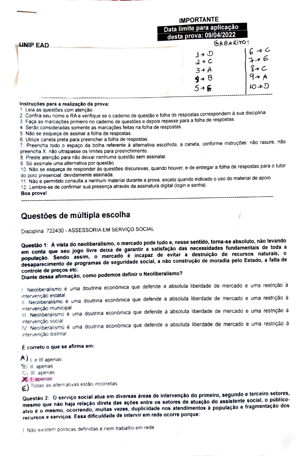 IMPORTANTE Data limite para aplicação desta prova: 09/04/2022 ABARITO UNIP EAD 6 2C 3 A A 56 ---==----=- Instruções para a realização da prova: 1. Leia as questões com atenção. 2Confira seu nome e RAe verifique se o caderno de questão e folha de respostas correspondem à sua disciplina. 3. Faça as marcações primeiro no caderno de questões e depois repasse para a folha de respostas. 4 Serão consideradas somente as marcações feitas na folha de respostas. 5. Não se esqueça de assinar a folha de respostas. 6. Utilize caneta preta para preencher a folha de respostas. 7. Preencha todo o espaço da bolha referente à alternativa escolhida, a caneta, conforme instruções: não rasure, na0 preencha X, não ultrapasse os limites para preenchimento. 8. Preste atenção para não deixar nenhuma questão sem assinalar 9 Só assinale uma alternativa por questão. 10. Não se esqueça de responder às questões discursivas, quando houver, e de entregar a folha de respostas para o tutor do polo presencial, devidamente assinada. 11. Não permitido consulta a nenhum material durante a prova, exceto quando indicado o uso do material de apoio. 12. Lembre-se de confirmar sua presença através da assinatura digital (login e senha). Boa prova! Questoes de múltipla escolha Disciplina 722430-ASSESSORIA EM SERVIÇo SOCIAL Questão 1: A vista do neoliberalismo, o mercado pode tudo e, nesse sentido, torna-se absoluto, não levando em conta que seu jogo livre deixa de garantir a satisfação das necessidades fundamentais de toda a população. Sendo assim, o mercado é incapaz de evitar a destruiç�o de recursos naturais, o desaparecimento de programas de seguridade social, a não construç�o de moradia pelo Estado, a falta de controle de preços etc. Diante dessa afirmação, como podemos definir o Neoliberalismo? Neoliberalismo é uma doutrina econômica que defende a absoluta liberdade de mercado e uma restrição à intervenção estatal Neoliberalismo é uma doutrina econômica que defende a absoluta liberdade de mercado e uma restrição à intervenção municipal III Neoliberalismo é uma doutrina económica que defende a absoluta liberdade de mercado e uma restrição à intervençã0 social V Neoliberalismo é uma doutrina econômica que defende a absoluta liberdade de mercado e uma restrição à intervenção distrital. E correto o que se afirma em: A)1e l apenas BI apenas C) l apenas apenas E)TOdas as alternativas estão incorretas Questão 2: O serviço social atua em diversas áreas de intervenção do primeiro, segundo e terceiro setores, mesmo que não haja relação direta das ações entre os setores de atuação do assistente social, o püblico alvo é o mesmo, ocorrendo, muitas vezes, duplicidade nos atendimentos à população e fragmentação dos recursos e serviços. Essa dificuldade de intervir em rede ocorre porque: INão existem politicas definidas e nem trabalho em rede II. O atendimento ao usuário é escasso. I1. As politicas sociais caminham separadamente e falta trabalho em rede VO trabalho em rede é solidificado a partir do neoliberalismno. Estão corretas apenas as alternativas: A) 1ell B) II lell E) I, Il e IV Questão 3: A qualificação profissional, nem sempre era condição suficiente para o exercício da profissão, pois se havia alguns setores especiais de atividades apropriadas às assistentes sociais femininas, outros se constituíram apropriados masculinos, o que evidencia como as relações de gênero foram constituintes desse campo profissional e esboroa (derruba), em parte, a "imagem feminina" de que foi revestido. Diante desta realidade, em que mês e ano fundou-se a primeira unidade de ensino masculina. I. Em março de 1940 II. Em março de 1945 II. Em abril de 1940 IV Em maio de 1940 E corretoo que se afirma em: 1, apenas B)II, apenas C) llI, apenas. D) V, apenas E) Nenhuma das alternativas Questão 4: Os espaços públicos, hoje descentralizados da política social, e que também servem para a implementação do controle social na gestão da política, admitem a introdução de novos sujeitos sociais, como os conselheiros; é outro espaço para desenvolver, nestes espaços a atuação do assistente social, está ligado aos movimentos sociais, a assessoria surge como uma nova demanda a ser enfrentada por esses profissionais na luta pela defesa e pela efetivação dos direitos de cidadania e de democracia, em conformidade com os princípios do código de ética profissional .Diante desta realidade, qual a importância da inserção do assistente social nestes espaços. A) Se dá pelo fato de a profissão se constituir na dinâmica Sócio-histórica das relações entre Estado e as classes sOciais no enfrentamento da pobreza; Se dá pelo fato de a profissão se constituir na dinámica sócio-histórica das relações entre Estado e as classes sOCiais no enfrentamento da questão social; C) Se dá pelo fato de a profissão se constituir na dinâmica Sócio-histórica das relações entre Estado e as classes sociais no enfrentamento da desigualdade social. D) Dá-se pelo fato de a profissão se constituir na dinámica sócio histórica das relações entre Estado e as classes sociais no enfrentamento do capitalismo. E) Dá-se pelo fato de a profissão se constituir na dinámica sócia histórica das relações entre Estado e as classes sociais no enfrentamento da violação de direitos sociais. Questão 5: Muitas empresas têm sido objeto de estudos e pesquisas sobre o tema responsabilidade social, do serviço socal. Novas expressöes da questão Social são vivenciadas no contexto empres arial, sob o olt o que demonstra que os espaços de atuação para profissionais compromissados, éticos e capacitados, vislumbrem soluções adequadas, desde que se trate de profissionais que vão além do imediatismo e do pragmatismo da organização, que estejam atentos, saibam intervir e adotem estratégias qualificadas, embasados em pressupostos éticos qu