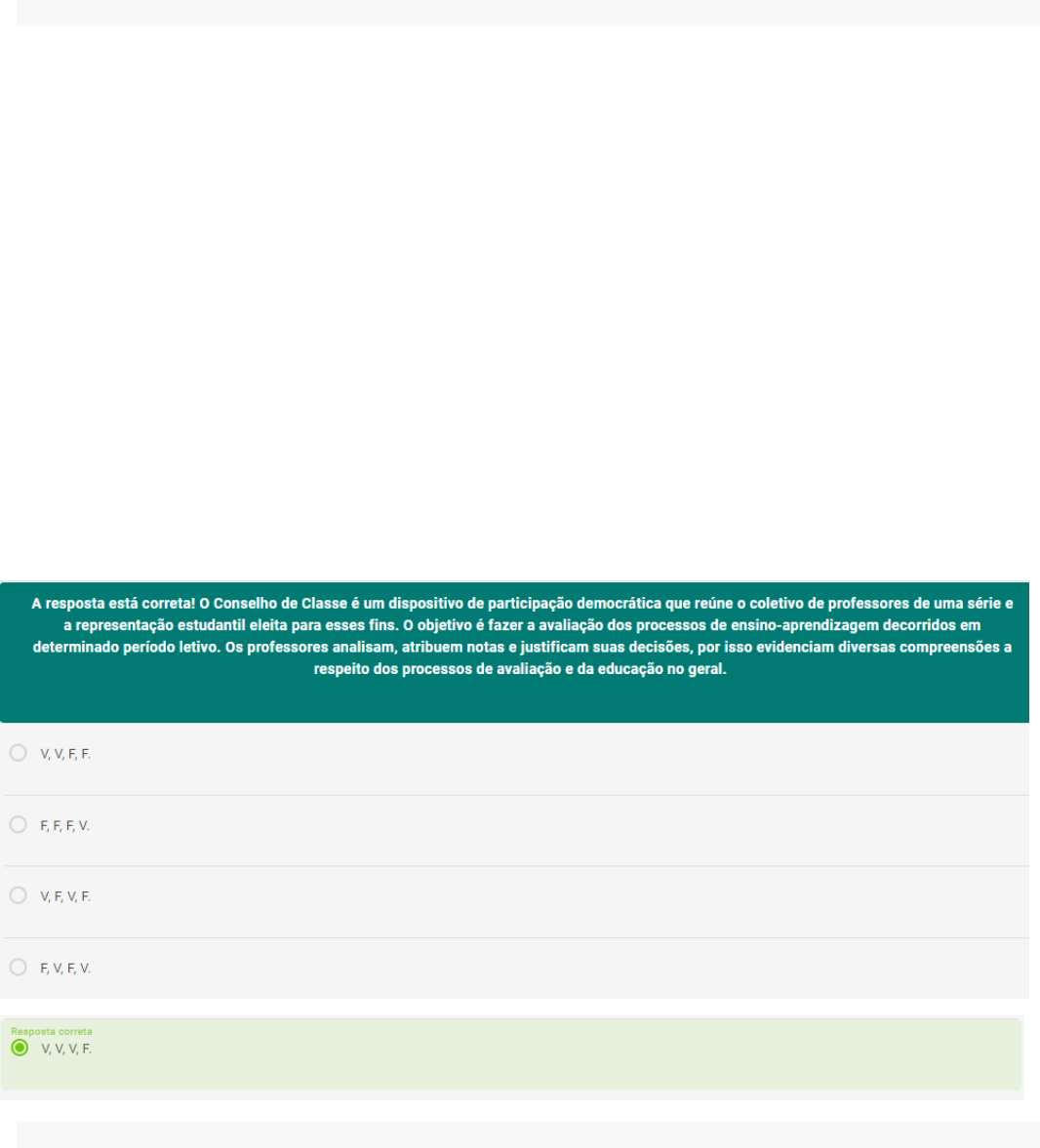 Curso ASPECTOS SOCIAIS, POLÍTICOS E LEGAIS DA EDUCAÇÃO • Pergunta 1 1 em 1 pontos De acordo com a compreensão de Dalben, “o Conselho de Classe, como uma instância coletiva de avaliação do processo de ensino e aprendizagem, reflete as diferentes concepções de avaliação e de ensino incorporadas pelos docentes em suas práticas, assim como as limitações e contradições próprias a elas e presentes no posicionamento político pedagógico desses profissionais [...]”. DALBEN, A.I.L.F. Verbete. Conselho de classe. In: OLIVEIRA, D.; DUARTE, A.; VIEIRA, L. Dicionário: trabalho, profissão e condição docente. Belo Horizonte: UFMG/Faculdade de Educação, 2010. Disponível em: <http://www.gestrado.net.br/pdf/103.pdf>. Acesso em: 25/01/2020. Com base no texto acima e nos estudos realizados na unidade, assinale com V as afirmações verdadeiras e F as falsas. ( ) Há um caráter multidisciplinar no Conselho de Classe, pois reúne professores de várias disciplinas do currículo escolar, qualificando assim uma avaliação mais sistêmica do estudante. ( ) A instância do Conselho de Classe diz muito mais a respeito das concepções político-pedagógicas dos professores do que propriamente dos estudantes. ( ) O Conselho de Classe pode se constituir em um excelente momento de discussão coletiva sobre os processos de avaliação. ( ) Pelo fato de contribuir muito pouco para qualificar os processos de ensino-aprendizagem, o Conselho de Classe deveria ser extinto. Assinale a alternativa que apresenta a sequência correta de respostas. • Pergunta 2 1 em 1 pontos Leia com atenção o trecho a seguir. “A escola e o Conselho são espaços sociais privilegiados para o processo de construção da democracia e da cidadania participativa. Na perspectiva da emancipação, a escola é um lugar decisivo para a inserção crítica das pessoas na cultura. A contribuição da escola, embora limitada, é indispensável na construção da cidadania. [...] Ela é fruto de muitos fatores, mas tem na escola sua institucionalização indispensável e insubstituível”. BRASIL. Conselho Escolar como espaço de formação humana: círculo de cultura e qualidade da educação. Brasília: MEC/SEB, 2006, p. 25. Disponível em: <http://portal.mec.gov.br/seb/arquivos/pdf/Consescol/cad%206.pdf>. Acesso em: 25/01/2020. De acordo com o texto, podemos dizer que o Ministério da Educação, por meio da Secretaria de Educação Básica, atribui aos Conselhos Escolares um papel fundamental na construção da cidadania. Diante dessa compreensão, assinale a alternativa correta. • Pergunta 3 1 em 1 pontos Os estados devem fazer a distribuição dos recursos financeiros para as escolas das redes públicas municipais e estaduais. Esses recursos são administrados por cada um dos entes federados e descentralizados aos estabelecimentos de ensino pertencentes à rede pública de educação. Essa distribuição obedece a critérios como forma de garantir a isonomia de recursos entre as escolas. Considerando esses apontamentos e os estudos realizados, analise as proposições a seguir e a relação entre elas. I. Uma escola que tenha 2 mil estudantes matriculados recebe mais recursos do que outra que possua 500 alunos com matrícula ativa. PORQUE II. A distribuição dos recursos é feita com base no FUNDEB e obedece ao número de matrículas ativas por escola. Assinale a alternativa correta. • Pergunta 4 1 em 1 pontos A gestão participativa na escola é um dos temas desafiadores para quem se debruça para analisar a educação. A esse respeito, Lück chama a atenção para o envolvimento dos pais. Sobre isso, leia o trecho a seguir. “A participação dos pais na vida da escola tem sido observada em pesquisas, como um dos indicadores mais significativos na determinação da qualidade do ensino, isto é, aprendem mais os alunos cujos pais participam mais da vida da escola”. LUCK, H. A Gestão participativa da Escola. Petrópolis: Vozes, 2010, p. 86. Considerando-se o texto apresentado, assinale a alternativa correta. • Pergunta 5 1 em 1 pontos Leia com atenção o trecho a seguir. “Os anseios de gestão democrática se manifestaram entre nós desde o início da abertura democrática, concretizando-se a partir dos anos oitenta e noventa através de iniciativas diversas, inclusive a eleição de diretores escolares em diversos sistemas estaduais e municipais. Mais do que simples espectadores, os educadores têm anseios de maior participação na formulação e gestão da(s) política(s) [...]”. VIEIRA, S. L. Estrutura e funcionamento da educação básica. Fortaleza: EdUECE, 2015, p. 31. A partir do fragmento acima, assinale com V as afirmações verdadeiras, e com F as falsas. ( ) A abertura política no Brasil teve início com a promulgação da Constituição de 1988. ( ) Em obediência à Constituição, a Lei de Diretrizes e Bases da Educação Nacional prescreveu a autonomia de gestão para as instituições de ensino brasileiras. ( ) Ao longo da história, os educadores sempre tiveram os direitos democráticos assegurados. ( ) Os diretores de escola devem ser indicados pelas Secretarias de Educação. ( ) A eleição para escolha de diretores de escolas foi assegurada durante a década de 1970. Assinale a alternativa que apresenta a sequência correta de respostas. • Pergunta 6 1 em 1 pontos Sobre o financiamento da educação no Brasil, a Constituição de 1988, em seu art. 212, estabelece percentuais mínimos de recursos a serem investidos por municípios, estados e Distrito Federal na Educação Básica dos respectivos sistemas de ensino - no caso, 18% para a União, e 25% para os estados. BRASIL. Lei n. 9.394, de 20 de dezembro de 1996. Diário Oficial da União, Poder Legislativo, Brasília, DF, 23/12/1996. Disponível em: <http://www.planalto.gov.br/ccivil_03/leis/L9394.htm>. Acesso em: 25/01/2020. Com base nas informações acima, analise as seguintes proposições e a relação entre elas. 