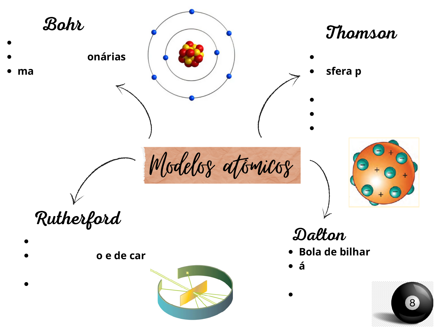 Modelos atômicos Bola de bilhar átomo indivisível e indestrutível esfera maciça Thomson Pudim de passas esfera positivas e cargas negativas átomo divisível átomo neutro descoberta de elétrons Rutherford Átomo vazio núcleo denso e de carga positiva bombardeido de partículas alfa (+) Dalton Bohr níveis de energia órbitas estacionárias maior distância do núcleo = maior o nível de energia