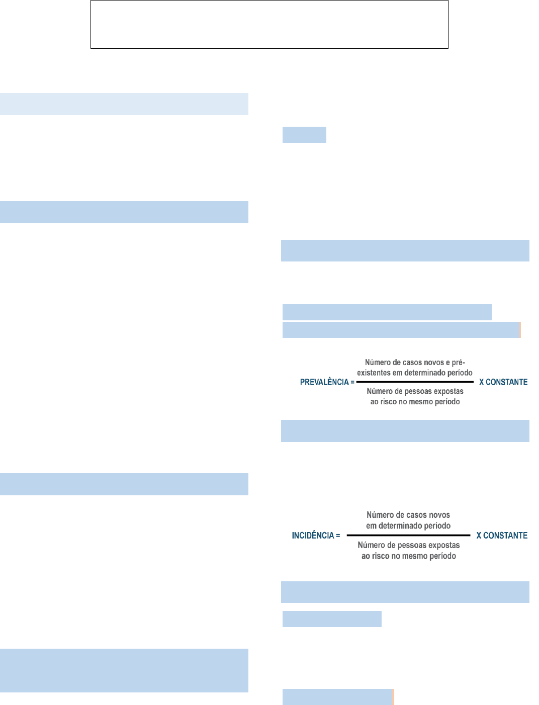 introdução • A epidemiologia é um dos eixos da saúde pública que estuda o processo saúde-doença e a distribuição das doenças na sociedade ou em grupos populacionais de humanos específicos.. OBJETIVOS DA EPIDEMIOLOGIA • Descrever a distribuição e a magnitude de problemas relacionados à saúde em diferentes populações humanas. • Levantar evidências que subsidiem o planejamento, a implementação e a avaliação de ações de controle e de tratamento para as doenças, bem como determinar as prioridades. • Identificar as causas dos agravos e das doenças. • Fornecer dados sobre formas de transmissão de doenças, fatores associados ao seu aparecimento e padrões de sua distribuição geográfica para formulação de medidas de enfrentamento às doenças. ENFOQUE EPIDEMIOLÓGICO -medir a frequência ou ocorrência de tais fatos na população é uma tarefa fundamenta. •3 CONCEITOS IMPORTANTES: PROBABILIDADE RISCO TAXA RAZÃO INDICADORES – QUANTIFICAÇÃO DE SAÚDE E DOENÇA NA POPULAÇÃO • Para poder responder às necessidades das populações de forma adequada, os serviços de saúde devem efetuar sistematicamente medidas com o objetivo de determinar a frequência das condições de saúde relevantes na comunidade. EXEMPLO: Consideramos, como exemplo, uma área geográfica determinada em um país da América Latina. Na população, foram observados 60 casos de tuberculose no ano 1995. Uma nova contagem no ano 2000 demonstrou a existência de 80 casos na população. PREVALÊNCIA É a medida do número total de casos existentes, chamados casos prevalentes, de uma doença em um ponto ou período de tempo e em uma população determinada, sem distinguir se são casos novos ou não.. INCIDÊNCIA A medida de ocorrência de casos novos de doença em uma população sob risco em um tempo determinado. ESTUDOS OBSERVACIONAIS ANALÍTICOS ESTUDOS ECOLÓGICOS: Comparam a exposição a fatores de interesse e à ocorrência de doenças em diferentes grupos populacionais, ou seja, os dados referem-se a grupos e não a indivíduos. ESTUDOS TRANSVERSAIS: representam uma fotografia da situação em determinado recorte de tempo e avaliam exposição e condição de saúde simultaneamente. EPIDEMIOLOGIA ESTUDOS DE CASO-CONTROLE: Os participantes são divididos entre os que já possuem a doença (casos) e os que não têm a doença ou condição (controles). Nos dois grupos são verificadas as exposições aos fatores de risco da doença em questão e, se a proporção do fator de risco for maior no grupo de casos, há então indicativo de que aquele fator realmente pode levar ao surgimento da doença. ESTUDOS DE COORTE: São estudos longitudinais que seguem, no tempo, uma população. Os participantes são divididos em dois grupos: os que foram expostos e os que não foram expostos ao fator de interesse do estudo. ESTUDOS EXPERIMENTAIS: Ao contrário dos estudos observacionais, os experimentais têm interferência direta sobre os participantes, o que pode significar a eliminação de um fator de risco ou a inserção de algum tratamento para um grupo de pacientes. ENSAIOS CLÍNICOS RANDOMIZADOS: São utilizados para testar os efeitos de intervenções específicas. Para garantir a equivalência entre os grupos, os indivíduos dos grupos intervenção e controle são alocados por meio de randomização ou aleatorização (sorteio). Mascaramento: cego, duplo-cego, triplo-cego. ENSAIOS DE CAMPO: Envolvem pessoas que não estão doentes, mas que têm risco de desenvolver a doença. ENSAIOS COMUNITÁRIOS: São estudos que se aplicam principalmente a doenças relacionadas às condições sociais e que podem ser influenciadas por intervenções voltadas ao comportamento do grupo e do indivíduo. ERROS ALEATÓRIOS Variação biológica individual Erro de amostragem Erros de medida CAUSALIDADE Causa pode ser definida como qualquer condição, característica ou evento que tenha função essencial na ocorrência de determinada doença. • Relação causa-efeito: quando de fato existe a relação terminal de efeito. • Acaso: quando ocorrem coincidências. • Viés: fenômenos que fazem com que duas variáveis caminhem juntas, mesmo que não exista relação de causa-efeito. COEFICIENTES DE NATALIDADE E DE FECUNDIDADE COEFICIENTE DE NATALIDADE: COEFICIENTE DE FECUNDIDADE: Para calcular essa taxa, basta dividir o número de nascimentos em um grupo etário pelo número de mulheres nesse grupo (15 a 49 anos). COEFICIENTE DE MORTALIDADE GERAL: COEFICIENTE DE MORTALIDADE INFANTIL:
