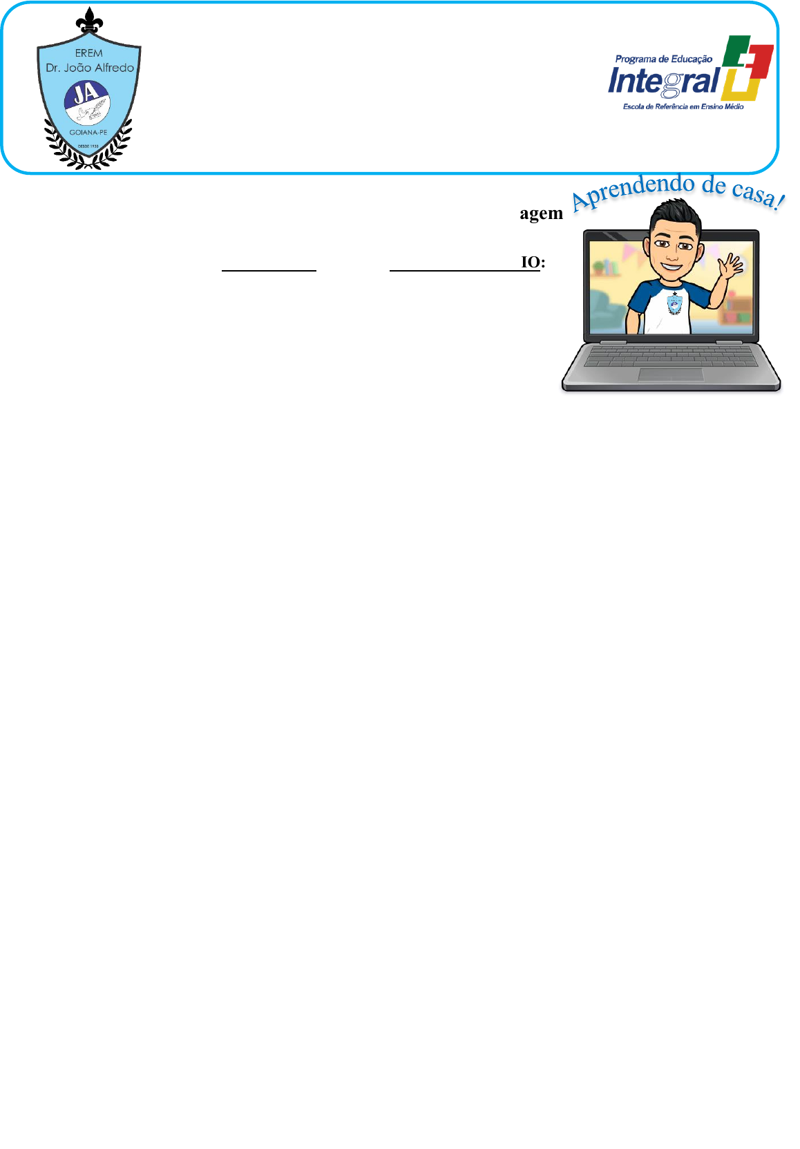 b) Selfie mortal: busca pela foto perfeita já matou 259 pessoas no mundo “A busca por selfies perigosas já matou 259 pessoas entre 2011 e 2017, revelou um novo estudo, mas os autores da pesquisa acreditam que esse número pode ser ainda maior. O estudo compilou notícias sobre mortes de pessoas enquanto tentavam tirar fotos de si mesmas em situações arriscadas. São casos como o do jovem Gavin Zimmerman, de 19 anos, que, em julho deste ano, caiu de um penhasco na Austrália enquanto fazia uma foto.” (BBC News 04/08/2018) c) A Rosa e o Mar “Linda doçura de gosto refinado embelezas minha estrada, o meu caminho com teus leves "insites" amalgamados de amor, de ternura e de carinho. Tuas palavras acariciam o meu ego, teus versos me revelam o lado lindo, tua sutileza me envolve e me desprego das amarras da vida e do destino”. EREM DR. JOÃO ALFREDO Ensino Médio Goiana, ________de fevereiro de 2022. Aluno: _________________________________________________ Professor: Lairton Neto Série: 1º Ano A, B, C (Novo Ensino Médio – NEMSI) Componente Curricular: Língua Portuguesa Exercício de Verificação de Aprendizagem 1. Indique quando o texto é LITERÁRIO quando e NÃO É LITERÁRIO: a) Trem de Ferro Café com pão Café com pão Café com pão Virge Maria que foi isso maquinista? Agora sim Café com pão Agora sim Voa, fumaça Corre, cerca Ai seu foguista Bota fogo Na fornalha Que eu presciso Muita força Muita força Muita força Oô... Menina bonita Do vestido verde Me dá tua boca Pra matá minha sede Oô... Vou mimbora Vou mimbora Não gosto daqui Nasci no sertão Sou de Ouricuri Oô... Vou depressa Vou correndo Vou na toda Que só levo Pouca gente Pouca gente Pouca gente... (Manuel Bandeira BANDEIRA, M. Estrela da Manhã, 1936.) d) Brigadeiro de Leite Moça INGREDIENTES 1 lata de Leite MOÇA; 3 colheres (sopa) de Chocolate em Pó; 1 colher (sopa) de manteiga; 1 xícara (chá) de chocolate granulado; manteiga para untar. MODO DE PREPARO Em uma panela, coloque o Leite MOÇA® com o Chocolate em Pó e a manteiga. Misture bem e leve ao fogo baixo, mexendo sempre até desprender do fundo da panela (que corresponde a cerca de 10 minutos). Retire do fogo, passe para um prato untado e deixe esfriar. Com as mãos untadas, enrole em bolinhas e passe-as no granulado. Sirva em forminhas de papel. Rendimento: 40 docinhos. 2. Leia o fragmento de texto abaixo e responda as perguntas: PADRE: (aparecendo na igreja) Que gritaria é essa? CHICÒ: Mandaram avisar que uma pessoa vai trazer um cachorro para o senhor benzê. PADRE: para eu benzer? CHICÒ: Sim. PADRE: (com desprezo) Que maluquice! Que besteira! JOÃO GRILO: Mas padre, no dia em que chegou o motor novo do major Antônio Morais o senhor não benzeu? PADRE: Motor é diferente, é uma coisa que todo mundo benze, mas benzer cachorro? JOÃO GRILO: É Chicó, o padre tem razão, benzer o cachorro do Major Antônio Morais não pode. PADRE: Como? E o dono do cachorro é Antônio Morais? JOÃO GRILO: É. Eu não queria vir, com medo de que o senhor se zangasse. PADRE: (sorrindo) Zangar nada, João! JOÃO GRILO: (cortante) Quer dizer que benze, não é? PADRE: Não vejo mal nenhum em se abençoar as criaturas de Deus. Diga ao Major que venha. Eu estou esperando. (entra na igreja) (AUTO DA COMPADECIDA PRIMEIRO ATO) a) O texto acima é considerado literário ou não literário? b) Quais características esse texto possui para ser considerado o que você disse na questão “a”? c) A qual gênero pertence esse tipo de texto (Lírico épico ou dramático)? d) Quais características esse texto possui para ser considerado o que você disse na questão “c”? e) Por que o padre resolveu benzer o cachorro no fragmento de texto acima? 3. Leia os dois textos ao lado e responda as questões com suas palavras: TEXTO 1: Descuidar do lixo é sujeira Diariamente, duas horas antes da chegada do caminhão da prefeitura, a gerência de uma das filiais do McDonald’s deposita na calçada dezenas de sacos plásticos recheados de papelão, isopor, restos de sanduíches. Isso acaba propiciando um lamentável banquete de mendigos. Dezenas deles vão ali revirar o material e acabam deixando os restos espalhados pelo calçadão. (Veja São Paulo, 23-29/12/92) TEXTO 2: O bicho Vi ontem um bicho Na imundície do pátio Catando comida entre os detritos. Quando achava alguma coisa, Não examinava nem cheirava: Engolia com voracidade. O bicho não era um cão, Não era um gato, Não era um rato. O bicho, meu Deus, era um homem. (Manuel Bandeira. Em Seleta em prosa e verso. Rio de Janeiro: J. Olympio/MEC, 1971, p.145) a) Qual o assunto em comum tratado nos dois textos? b) Qual deles é considerado um texto literário? c) Qual deles é considerado um texto não literário? d) No texto 2, há uma palavra usada no sentido conotativo. Que palavra é esta? e) Por que o texto 2 é considerado um poema?