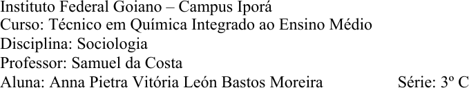 Instituto Federal Goiano – Campus Iporá Curso: Técnico em Química Integrado ao Ensino Médio Disciplina: Sociologia Professor: Samuel da Costa Aluna: Anna Pietra Vitória León Bastos Moreira Série: 3º C Atividades Sociologia Capítulo 12 (Globalização e integração regional) 1) Os processos de globalização podem promover diversas oportunidades para os países e suas populações, porém essas oportunidades não são oferecidas de maneira uniforme, visto que pode-se observar uma grande disparidade socioeconômica entre as nações do globo. Povos que residem em países em desenvolvimento, raramente possuem as mesmas condições do que a população de países desenvolvidos. A globalização evidentemente contribuiu para a melhoria de diversos aspectos, principalmente no que se refere ao âmbito comercial e informacional das nações, porém deve-se observar esse caráter desigual do processo. 2) a) Com a terceira Divisão Internacional do Trabalho (DIT), podemos observar a dispersão de várias multinacionais pelo globo. A sede dessas empresas geralmente situa- se nos países desenvolvidos, como os Estados Unidos e os países da Europa ocidental, onde o lucro é empregado. Os outros países em desenvolvimento, onde as multinacionais apresentam filiais onde se produzem as mercadorias, não são substancialmente beneficiados pelo lucro obtido. b) A Divisão Internacional do Trabalho (DIT), pode ser entendida como o modelo de distribuição da produção industrial internacional, entre países desenvolvidos e subdesenvolvidos. 3) O principal pacto de integração da América do Sul é o Mercosul, composto por Argentina, Brasil, Paraguai, Uruguai e Venezuela (suspensa), além de outros sete países associados. Esse bloco apresenta como desafio principal para a expansão comercial mundial, o consenso entre os membros, visto que seus interesses geralmente são divergentes, o que ocasiona em impasses nas negociações. 4) a) O termo “globalização” pode ser definido como um fenômeno de integração econômica, comercial, política, cultural, social e informacional entre os países do globo. Teoricamente, essa integração permitiria uma mobilidade maior ao indivíduo, que estaria inserido em uma cidadania global e homogênea, que apresentaria um caráter mais igualitário e conjunto. Essa visão otimista é refutada por argumentos de que a globalização seria utilizada como um instrumento de disseminação da cultura ocidental, dispersando as concepções europeias e o modelo econômico capitalista e, consequentemente, proporcionando situações de pobreza e desigualdade. b) Os processos de integração regional, apesar de proporcionarem certos benefícios, podem produzir a fragmentação entre os países, visto que essa integração pode englobar economias muito distintas, onde as mais vulneráveis geralmente são prejudicadas. Os fluxos migratórios internacionais podem ser vistos como um fator importante para se observar o desenvolvimento dos países, visto que os imigrantes geralmente são originários de países que apresentam aspectos socioeconômicos precários, que se deslocam para países mais desenvolvidos, buscando melhores condições de vida. 5) Sim, concordo com a afirmação, pois a globalização realmente foi um evento contemporâneo, embora não tenha sido totalmente recente. Ela foi grandemente impulsionada pelo avanço das tecnologias e dos meios de comunicação, permitindo a integração dos países do globo.