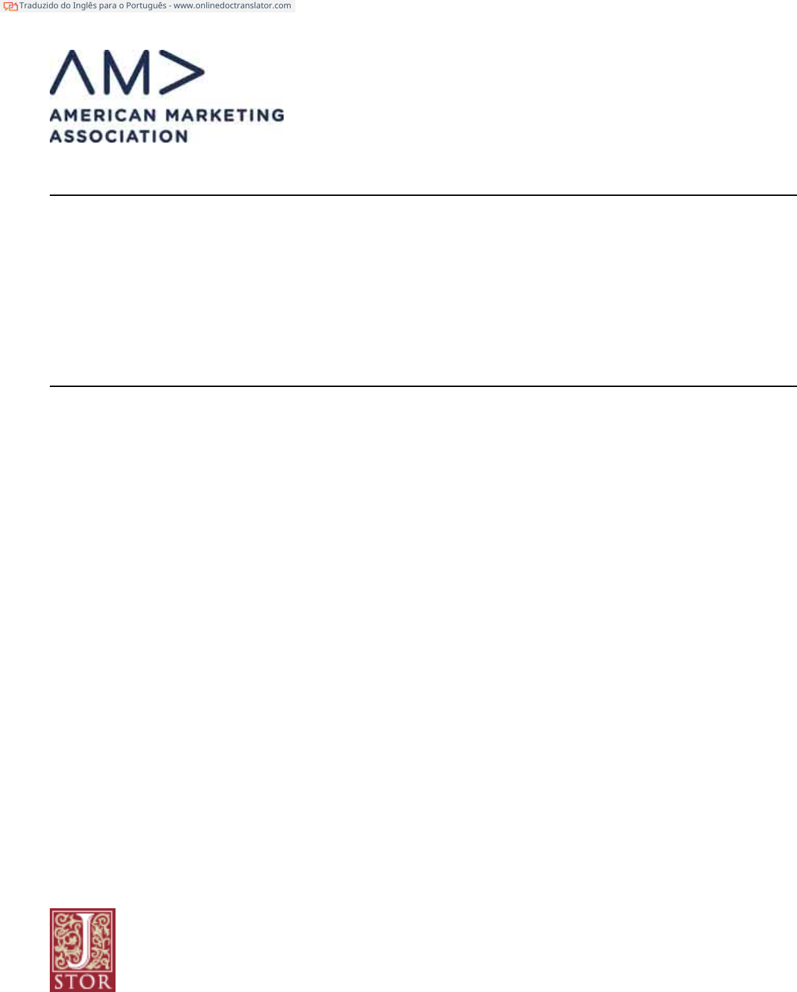 Evoluindo para uma nova lógica dominante para marketing Autor(es): Stephen L. Vargo e Robert F. Lusch Fonte:Revista de Marketing,Vol. 68, No. 1 (Jan., 2004), pp. 1-17 Publicado por: American Marketing Association URL estável: http://www.jstor.org/stable/30161971 Acessado: 12-05-2017 18:48 UTC O JSTOR é um serviço sem fins lucrativos que ajuda acadêmicos, pesquisadores e estudantes a descobrir, usar e desenvolver uma ampla variedade de conteúdo em um arquivo digital confiável. Usamos tecnologia da informação e ferramentas para aumentar a produtividade e facilitar novas formas de bolsa de estudos. Para obter mais informações sobre JSTOR, entre em contato com support@jstor.org. Seu uso do arquivo JSTOR indica sua aceitação dos Termos e Condições de Uso, disponíveis em http://about.jstor.org/terms Associação Americana de Marketingestá colaborando com a JSTOR para digitalizar, preservar e estender o acesso a Jornal de Marketing Este conteúdo foi baixado de 143.107.205.185 em sex, 12 de maio de 2017 18:48:24 UTC Traduzido do Inglês para o Português - www.onlinedoctranslator.com https://www.onlinedoctranslator.com/pt/?utm_source=onlinedoctranslator&utm_medium=pdf&utm_campaign=attribution Este conteúdo foi baixado de 143.107.205.185 em sex, 12 de maio de 2017 18:48:24 UTC Este conteúdo foi baixado de 143.107.205.185 em sex, 12 de maio de 2017 18:48:24 UTC Este conteúdo foi baixado de 143.107.205.185 em sex, 12 de maio de 2017 18:48:24 UTC Este conteúdo foi baixado de 143.107.205.185 em sex, 12 de maio de 2017 18:48:24 UTC Este conteúdo foi baixado de 143.107.205.185 em sex, 12 de maio de 2017 18:48:24 UTC Este conteúdo foi baixado de 143.107.205.185 em sex, 12 de maio de 2017 18:48:24 UTC Este conteúdo foi baixado de 143.107.205.185 em sex, 12 de maio de 2017 18:48:24 UTC Este conteúdo foi baixado de 143.107.205.185 em sex, 12 de maio de 2017 18:48:24 UTC Este conteúdo foi baixado de 143.107.205.185 em sex, 12 de maio de 2017 18:48:24 UTC Este conteúdo foi baixado de 143.107.205.185 em sex, 12 de maio de 2017 18:48:24 UTC Este conteúdo foi baixado de 143.107.205.185 em sex, 12 de maio de 2017 18:48:24 UTC Este conteúdo foi baixado de 143.107.205.185 em sex, 12 de maio de 2017 18:48:24 UTC Este conteúdo foi baixado de 143.107.205.185 em sex, 12 de maio de 2017 18:48:24 UTC Este conteúdo foi baixado de 143.107.205.185 em sex, 12 de maio de 2017 18:48:24 UTC Este conteúdo foi baixado de 143.107.205.185 em sex, 12 de maio de 2017 18:48:24 UTC Este conteúdo foi baixado de 143.107.205.185 em sex, 12 de maio de 2017 18:48:24 UTC Este conteúdo foi baixado de 143.107.205.185 em sex, 12 de maio de 2017 18:48:24 UTC Contents 1 2 3 4 5 6 7 8 9 10 11 12 13 14 15 16 17 Issue Table of Contents Journal of Marketing, Vol. 68, No. 1 (Jan., 2004), pp. 1-171 Front Matter Evolving to a New Dominant Logic for Marketing [pp. 1-17] Invited Commentaries on "Evolving to a New Dominant Logic for Marketing" [pp. 18-27] Product Complements and Substitutes in the Real World: The Relevance of "Other Products" [pp. 28-40] First in, First out? The Effects of Network Externalities on Pioneer Survival [pp. 41-58] Beyond Adoption: Development and Application of a Use-Diffusion Model [pp. 59-72] Relationship Governance in a Supply Chain Network [pp. 73-89] Antecedents of Export Venture Performance: A Theoretical Model and Empirical Assessment [pp. 90-108] Return on Marketing: Using Customer Equity to Focus Marketing Strategy [pp. 109-127] Internal Benefits of Service-Worker Customer Orientation: Job Satisfaction, Commitment, and Organizational Citizenship Behaviors [pp. 128-146] An Empirical Analysis of the Determinants of Retail Margins: The Role of Store-Brand Share [pp. 147-165] Book Reviews Review: untitled [pp. 166-167] Review: Understanding and Justifying Our Existence [pp. 167-171] Back Matter