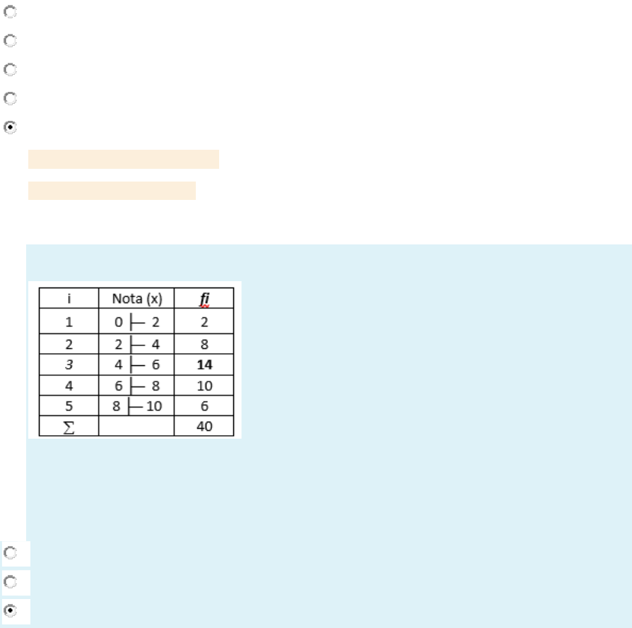 Considere as asserções a seguir. Em distribuições assimétricas à direita, a mediana é sempre maior do que a média. PORQUE Em distribuições com assimetria positiva, a média é afetada por valores extremos. Analisando-se as asserções, conclui-se que (A) as duas asserções são verdadeiras, e a segunda é uma justificativa correta da primeira. (B) as duas asserções são verdadeiras, e a segunda não é uma justificativa correta da primeira. (C) a primeira asserção é verdadeira, e a segunda é falsa. (D) a primeira asserção é falsa, e a segunda é verdadeira. (E) a primeira e a segunda asserções são falsas. Escolha uma opção: a. C b. E c. A d. B e. D Sua resposta está correta. A resposta correta é: D Considere distribuição de frequência abaixo referente as notas em uma prova de Biologia. A partir da tabela assinale a alternativa correta: Escolha uma opção: a. A moda é maior que a média é menor que a mediana b. A distribuição é assimétrica negativa com média menor do que a mediana c. A média aritmética é maior do que a mediana e a moda e vale 5,2 d. A frequência acumulada relativa da classe da mediana é 35% e. A distribuição é assimétrica positiva com média menor do que 5,0 Feedback Sua resposta está correta. Uso das fórmulas para cálculo das três medidas de posição A resposta correta é: A média aritmética é maior do que a mediana e a moda e vale 5,2 Em sua viagem a Morro Branco, Alice fez somente 8 ligações de seu smartphone cujas durações, em minutos foram: 3; 8; 11; 8; 5; 2; 7; 4. Qual o valor aproximado do coeficiente de variação desse conjunto de dados? Escolha uma opção: a. 74% b. 133% c. 47% d. 32% e. 52% Feedback Sua resposta está correta. CV = DP/Média A resposta correta é: 47% O resultado de uma pesquisa feita pela Confederação Nacional de Agricultura (CNA) sobre a produtividade de mil e quinhentas famílias em assentamentos é apresentado no gráfico abaixo. Quantas, dentre as famílias pesquisadas, produzem, pelo menos, o suficiente para o seu consumo? Escolha uma opção: a. 870 b. 420 c. 520 d. 950 e. 930 Feedback Sua resposta está incorreta. 62% de 1500 = 930 A resposta correta é: 930 Em relação aos conceitos de amostragem e estimação assinale a alternativa correta: Escolha uma opção: a. Um plano de amostragem corretamente elaborado garante a fidedignidade dos dados da população. b. O erro de estimação em um processo de amostragem é inversamente proporcional ao tamanho da amostra selecionada. c. A opção pela amostragem, em relação ao censo, garante a redução de tempo, mas conduz sempre ao incremento de custo e a perda de precisão. d. Uma amostra aleatória extraída de uma população deve superar, no tamanho a 5% do número de elementos populacionais. e. Quanto menor a fração amostral menor o erro de estimação. Feedback Sua resposta está incorreta. Conceito de erro de estimação – quanto maior a amostra menor o erro. A resposta correta é: O erro de estimação em um processo de amostragem é inversamente proporcional ao tamanho da amostra selecionada. Em uma pesquisa de preços de determinado produto, foram obtidos os valores, em reais, de uma amostra aleatória colhida em 6 estabelecimentos que o comercializam. Qual o valor da variância amostral? Escolha uma opção: a. 2,50 b. 1,66 c. 2,0 d. 1,5 e. 2,25 Feedback Sua resposta está incorreta. Fórmula da variância com o fator de correção de Bessel para amostras A resposta correta é: 2,0 O desenvolvimento da Estatística, enquanto ciência e sistema de análise e observação de dados e fenômenos da realidade e do tecido social, é relativamente recente (séc. XVII). No entanto, egípcios, fenícios e romanos já coletavam e analisavam dados. Assim, no desenvolvimento da análise estatística, ela divide-se nos conceitos de Estatística Descritiva e Indutiva. A partir do trecho enunciado e dos seus conhecimentos adquiridos a respeito da classificação da Estatística, assinale a opção correta. Escolha uma opção: a. A apresentação tabular não é uma ferramenta da Estatística Descritiva. b. A Estatística Indutiva opera com dados e observações bem determinadas, visando estabelecer relações e aplicações de técnicas de pesquisa sobre estes dados. c. Uma amostra corresponde a uma parcela de uma população, obtida por meio de técnicas de amostragem apropriadas. d. A Estatística Indutiva permite a observação da realidade de um fenômeno partindo-se do geral ao particular, ou seja, da população para a amostra e estritamente neste sentido. e. A Estatística Descritiva trabalha com dados relativos a uma amostra. Feedback Sua resposta está incorreta. Conceito de amostra A resposta correta é: Uma amostra corresponde a uma parcela de uma população, obtida por meio de técnicas de amostragem apropriadas. As estatísticas dos rendimentos de dois tipos de fundos de investimento oferecidos por um Banco são apresentadas a seguir. Com relação à distribuição dos fundos de investimento a análise da tabela conduz à afirmação de que: (A) ambas as distribuições são simétricas. (B) ambas as distribuições são assimétricas à esquerda. (C) ambas as distribuições são assimétricas à direita. (D) a distribuição do fundo A é assimétrica à esquerda e a do fundo B assimétrica à direita. (E) a distribuição do fundo A é assimétrica à direita e a do fundo B assimétrica à esquerda. Escolha uma opção: a. D b. B c. C d. E e. A Feedback Sua resposta está incorreta. Conceito e tipos de assimetrias Fundo-A – média > mediana Fundo-B média < mediana A resposta correta é: E Em relação a Organização de Dados Estatísticos assinale a alternativa correta. Escolha uma opção: a. Em uma tabela de frequência a frequência acumulada abaixo de é decrescente b. Em um histograma a soma das áreas dos retângulos é igual a área do polígono de frequência correspondente. c. A frequência relati