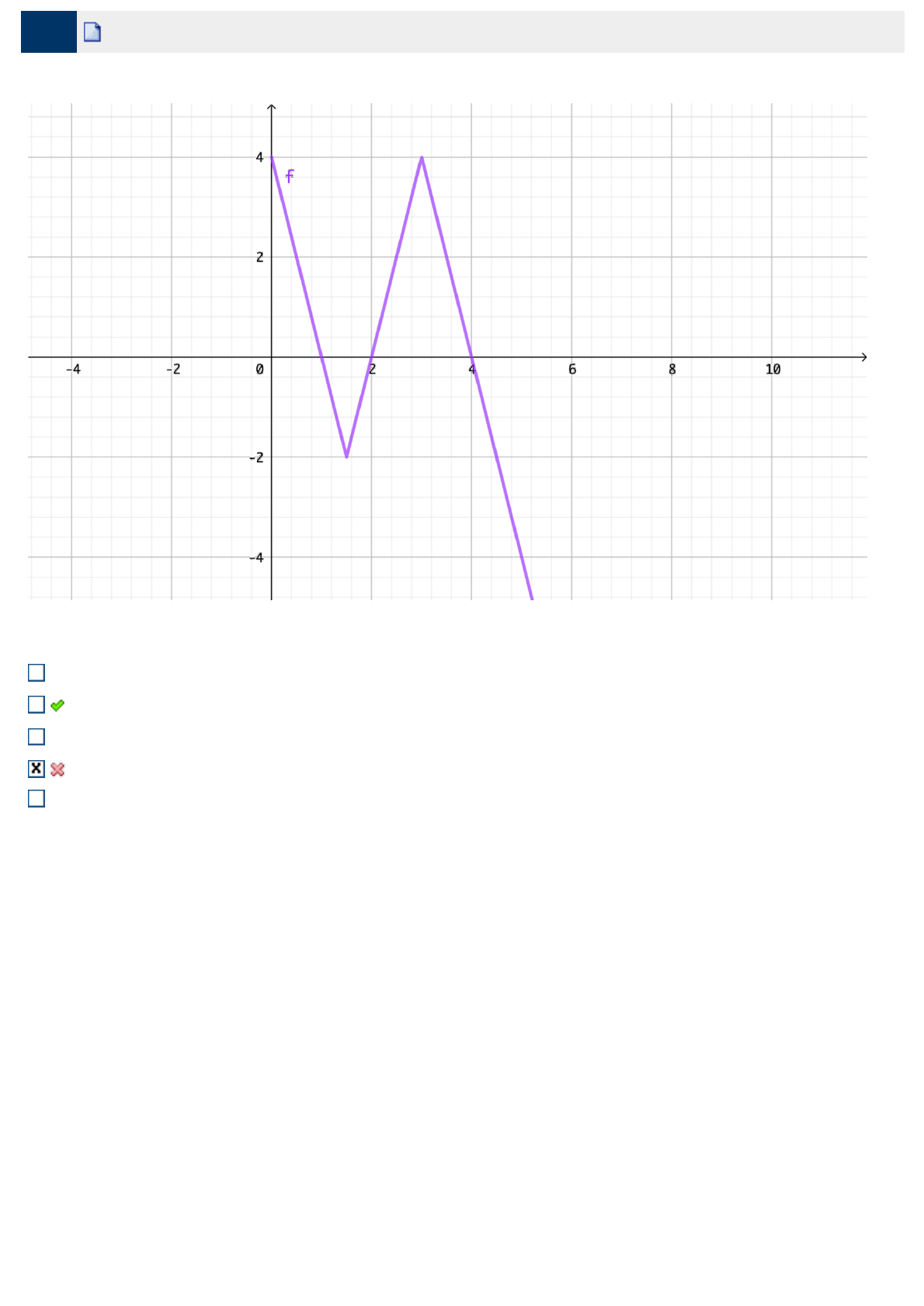 9. Ref.: 4961030 Pontos: 0,00 / 1,00 Seja , dada pelo gráfico a seguir: É correto afirmar que: é bijetora. O conjunto imagem de é . é periódica de período 1. é crescente para todo x > 0. é sobrejetora e não injetora. f : R → R f f (−∞, 4] f f f javascript:alert('C%C3%B3digo da quest%C3%A3o: 4961030.');