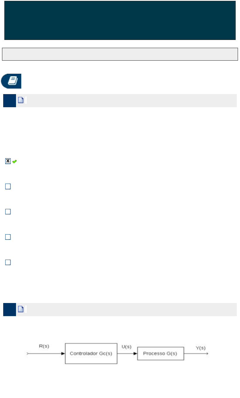 Disciplina: MODELAGEM E ANÁLISE DE SISTEMAS DINÂMICOS AV Aluno: WILLIAN LISBOA DOS SANTOS 202004126083 Professor: DAVID FERNANDES CRUZ MOURA Turma: 9001 CCE1260_AV_202004126083 (AG) 09/06/2022 13:59:30 (F) Avaliação: 8,0 Nota Partic.: Av. Parcial.: 1,5 Nota SIA: 9,5 pts MODELAGEM E ANÁLISE DE SISTEMAS DINÂMICOS 1. Ref.: 2977589 Pontos: 1,00 / 1,00 Encontre a solução da equação diferencial x¨(t)+x(t)=0;x(0)=α,x˙=βẍ(t)+x(t)=0;x(0)=α,ẋ=β: [αcost+βsent]1(t)[αcost+βsent]1(t) [αcos2t+βsent]1(t)[αcos2t+βsent]1(t) [βsent]1(t)[βsent]1(t) [αcost]1(t)[αcost]1(t) [αsent+βcost]1(t)[αsent+βcost]1(t) 2. Ref.: 3039937 Pontos: 1,00 / 1,00 Vamos supor que um processo seja representado pela função de transferência G(s) = 15s²15s²e o controlador GC(s) = s+14s−7s+14s−7, visto na figura a seguir: (a) Calcule a função do ramo direto. (b) Calcule a FT Y(s)/R(s), caso houvesse uma realimentação simples. Assinale a alternativa correta abaixo que corresponda ao pedido: a)15s2.(s+14)(s−7)+s+14;b)(s+14)5s2(s−7)+s+14a)15s2.(s+14)(s−7)+s+14;b)(s+14)5s2(s−7)+s+14 a)15s2.(s+14)(s−7);b)(s+14)5s2(s−7)+sa)15s2.(s+14)(s−7);b)(s+14)5s2(s−7)+s a)15s2.(s−7)(s+14);b)(s+14)5s2(s−7)+s+14a)15s2.(s−7)(s+14);b)(s+14)5s2(s−7)+s+14 a)15s2.(s+14)(s−7);b)(s+14)5s2(s−7)+s+14a)15s2.(s+14)(s−7);b)(s+14)5s2(s−7)+s+14 a)15s2.(s+14)(s−7);b)(s+14)5s(s−7)+s+14a)15s2.(s+14)(s−7);b)(s+14)5s(s−7)+s+14 3. Ref.: 3039962 Pontos: 1,00 / 1,00 Com o sistema G(s)=Y(s)U(s)=1(s2+3s+2)G(s)=Y(s)U(s)=1(s2+3s+2), encontre a formulação G(s)=C(sI−A)−1BG(s)=C(sI−A)−1B para a conversão do espaço de estado para Função de Transferência: 4. Ref.: 2979148 Pontos: 1,00 / 1,00 Considere o circuito indicado na figura a seguir Supondo que ei e e0 são a entrada e a saída do sistema, como a função de transferência desse circuito será, se Z1(s)=Ls+R;Z2(s)=1/CsZ1(s)=Ls+R;Z2(s)=1/Cs ? RLCs2+RCs+1RLCs2+RCs+1 1LCs2+RCs+11LCs2+RCs+1 CLCs2+RCs+1CLCs2+RCs+1 LLCs2+RCs+1LLCs2+RCs+1 sLCs2+RCs+1sLCs2+RCs+1 5. Ref.: 3565707 Pontos: 0,00 / 1,00 (Engenharia-de-Controle-Moderno-Katsuhiko-Ogata-5-Edicao-adaptada) Encontre o coeficiente de atrito viscoso equivalente da figura a seguir. Considere b1 = b2 =b3 = b 2b/3 b 3b b/3 2b 6. Ref.: 3039952 Pontos: 1,00 / 1,00 Encontre a representação no espaço de estados do sistema mostrado na figura a seguir: 7. Ref.: 3552757 Pontos: 1,00 / 1,00 Na modelagem de sistemas dinâmicos de primeira ordem, considere um entrada de degrau unitário. A definição do tempo de primeira ordem é dada pela alternativa: Tempo que o processo demora, uma vez iniciada a variação, para chegar, aproximadamente, aos 30% da variação total final. Tempo que o processo demora, uma vez iniciada a variação, para chegar, aproximadamente, aos 5% da variação total final. Tempo que o processo demora, uma vez iniciada a variação, para chegar, aproximadamente, aos 50% da variação total final. Tempo que o processo demora, uma vez iniciada a variação, para chegar, aproximadamente, aos 63% da variação total final. Tempo que o processo demora, uma vez iniciada a variação, para chegar, aproximadamente, aos 45% da variação total final. 8. Ref.: 2977564 Pontos: 1,00 / 1,00 Considere o sistema de segunda ordem cuja função de transferência é dada por Y(s)U(s)=1s2+0,8s+1Y(s)U(s)=1s2+0,8s+1. Pode-se afirmar que, quanto a resposta do sistema a uma entrada de referência em degrau unitário, seu comportamento dinâmico é: Indeterminado Instável Subamortecido Superamortecido Criticamente amortecido 9. Ref.: 2979166 Pontos: 1,00 / 1,00 Considere um sistema dado pela equação diferencial y¨+3y˙+2y=0;y(0)=0,1;y˙=0,05ÿ+3ẏ+2y=0;y(0)=0,1;ẏ=0,05 . Obtenha a resposta y(t), por função de transferência, de acordo com a condição inicial dada. y(t) = 0,25.e-t - 0,15.et y(t) = 0,25.e-t - 0,15.e-2t y(t) = 0,2.e-2t - 0,1.e-t y(t) = 0,2.e-t - 0,1.e-2t y(t) = 0,25.e-t - 0,15.e-t 10. Ref.: 3565717 Pontos: 0,00 / 1,00 (ENADE - 2014) Na modelagem um sistema linear invariante no tempo estável, foi levantada a sua resposta em frequência, obtendo-se os seguintes diagramas de Bode: A função de transferência que melhor representa o sistema é: G(s) = (s - 0,1)/(s + 10)(s + 100) G(s) = (s + 1)/(s + 0,1)(s + 100) G(s) = (s - 1)/(s + 0,1)(s + 100) G(s) = (s + 1)/(s - 0,1)(s + 100) G(s) = (s + 0,1)/(s + 10)(s + 100)