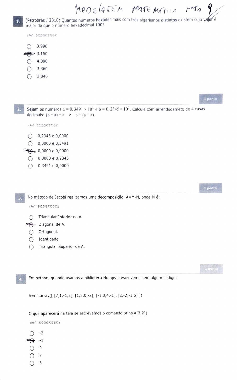 Mene l4sE MaTE mtien a (Petrobrás / 2010) Quantos números hexadecimais com três algarismos distintos existem cujo vapr é maior do que o número hexadecimal 100? (Ref.: 202009727064) O 3.996 3.150 O 4.096 O 3.360 O 3.840 1 ponto Sejam os números a = 0,3491 x 10' eb = 0,2345 x 10". Calcule com arrendodameto de 4 casas decimais: (b+ a) - a e b+ (a - a). (Ref.: 202009727 166) O0,2345 e 0,0000 O0,0000 e 0,3491 0,0000 e 0,0000 O0,0000 e 0,2345 O0,3491 e 0,0000 1 1 ponto 3 No método de Jacobi realizamos uma decomposição, A=M-N, onde M é: (Ref.: 202009735562) OTriangular Inferior de A. Diagonal de A. Ortogonal. O Identidade. Triangular Superior de A. 1 ponto Em python, quando usamos a biblioteca Numpy e escrevemos em algum código:4 A=np.arrayt [7,1,-1,2]1, [1,8,0,-2], [-1,0,4,-1], [2,-2,-1,6] 1) O que aparecerá na tela se escrevemos o comando print(A[3,2]) (Ref.: 202009735193) O-2 -1 O O 7 O 6 1 ponto Assinale a UNICA alternativa que apresenta o valor da integral de sen(x) no intervalo de 0 a 1. Divida o 5. intervalo de integração em 10 partes. Utilize o método de Simpson (Ref.: 202009735307) O -0,760 O -0,660 -0,460 O -0,560 O -0,360 1 ponto Assinale a UNICA alternativa que apresenta o valor da integral de sen(x) no intervalo de 1 a 2. Utilize o método de Romberg, com aproximação até n = 2: (Ref.: 202009738656) O0,95645 O0,97645 0,93645 O 0,91645 O 0,99645 1 ponto Assinale a UNICA alternativa que apresenta o valor de y(1) em face da resolução da EDO de 1à ordem y' = 2y, sendo y(0) = 3. Considere h = 0,2. Utilize o método de Euler: (Ref.: 202009735720) O 16,334 O 16,734 16,134 O 16,934 O 16,534 1 ponto Assinale a UNICA alternativa que apresenta o valor de y(0,4) em face da resolução da EDO de 1a ordem 8 y' = y+3, sendo y(0) = 3. Considere h = 0,1. Utilize o método de Euler: (Ref.: 202009735969) 21,787 O 22,087 O 21,987 O 21,887 O 22,187 ponte Assinale a UNTCA aiteinativa que apresenta e vaior de v(0 4) em face da resolução da Ebo de 1 orferm vecos(y), sendo v{0)-3 Consikdere h 0, I Uttize o método de Euler Re 202007 39800 O 3.019 O 2.919 2.619 O 2,819 2.719 ponto ASsinale a UNICA alternativa que apresenta o valor de y(0,4) em face da resolução da EDO de 1' ordem y3, sendo v(0) 3. Considere h = 0,1. Utilize o método de Eule Re 2020097357231 10,415 10,615 10,515 O 10,215 O 10,315