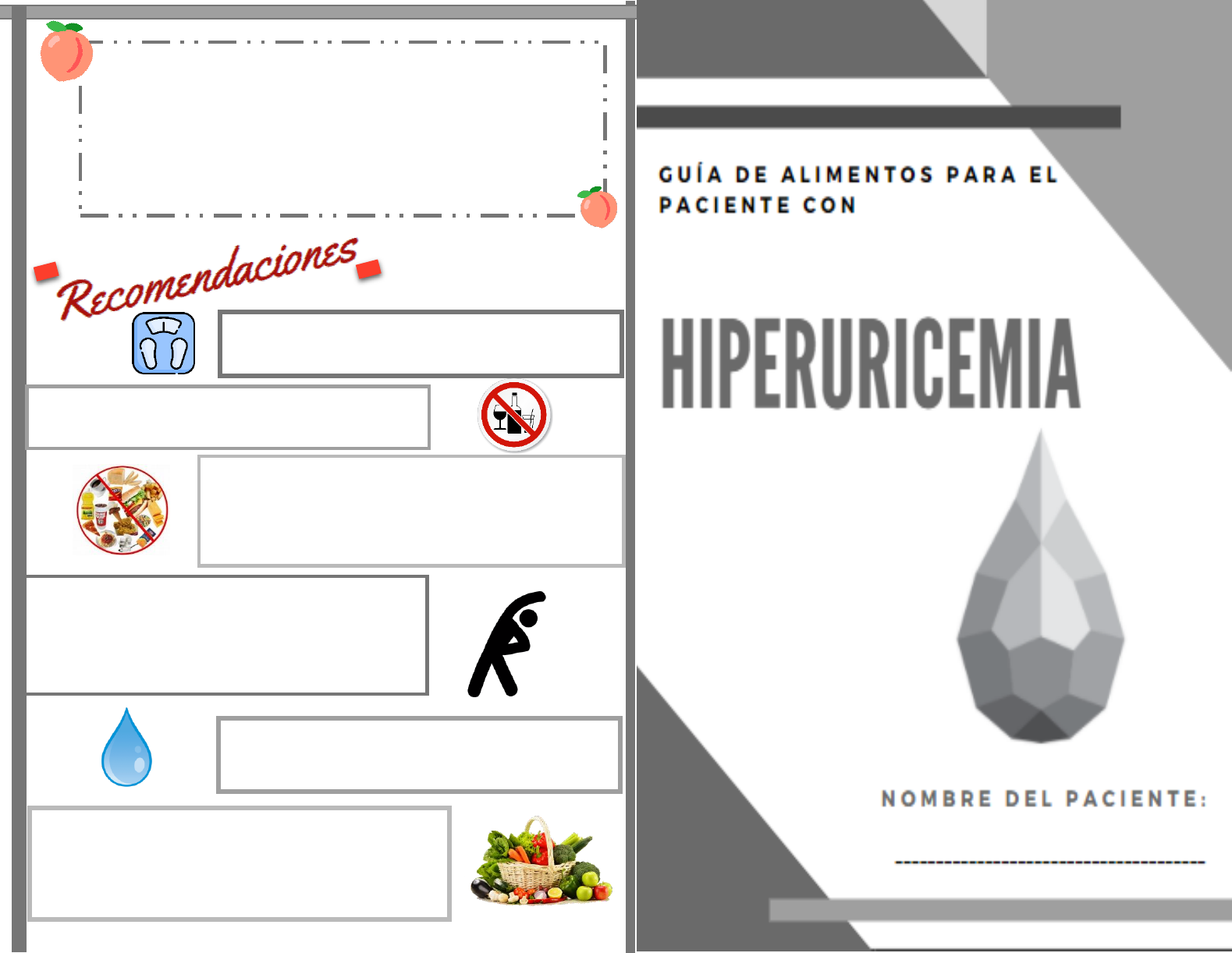 Usted debe tener cuidado con la cantidad de jarbe de maíz de alta fructosa que consume en el día (proveniente de galletas, jugos enlatados, pan de dulce empaquetado, refrescos, miel), también cuide la cantidad de carnes rojas que consume en el día (de res, de cerdo, etc así como sus caldos) y mariscos (camarones, ostiones, ostras, etc). Si usted no tiene problema se recomienda aumentar el consumo de leche descremada. Disminuir su peso, si existe sobrepeso u obesidad. Limitar y si es posible EVITAR el consumo de bebidas alcohólicas, sobre todo el de cerveza. Evitar todo tipo de refrescos, energizantes, jugos de frutas enlatados y naturales por su alto contenido en JARABE DE MAIZ DE ALTA FRUCTOSA (lea las etiquetas de los productos que va a consumir y evite que contengan jarabe de maíz de alta fructosa) En cuanto a la disminución de peso, ésta debe ser gradual a través de una alimentación equilibrada y de la realización de actividad física regular, por lo menos 3 veces por semana durante 1 hora. Es importante la ingesta de agua a lo largo del día, debiendo tomar por lo menos 2 litros Aumentar la ingesta de verduras y frutas ya que son altas en fibra, vitaminas y minerales que lo ayudarán a conseguir sus metas nutricionales más rápidamente. La hiperuricemia es la elevación del ácido úrico en su sangre, esta elevación se debe principalmente al abuso de alimentos altos en purinas (presentes principalmente en carnes rojas, mariscos, todos los jugos procesados ya que contienen fructosa, así como galletas, pastelería, etc. También se encuentran presentes en la cerveza. Para que usted tenga éxito en su tratamiento además de tomar sus medicamentos es fundamental que siga una alimentación baja en purinas. Siga esta guía para aprender que alimentos son los que puede incluir en sus preparaciones. Por ningún motivo deje de tomar sus medicamentos, llevar una alimentación adecuada no debe ser motivo para dejar sus medicamentos, espere la indicación de su médico para retirarlos. GRUPO DE ALIMENTO ALIMENTOS Y PORCIONES FRUTAS Puede comer cualquier siempre y cuando respete las porciones indicadas por su nutriólogo: 1 pza: Manzana, toronja, granada, kiwi, mango, plátano, pera 2 pzas: Durazno, naranja, mandarina, guayaba, tejocote, tuna. 3 pzas: Ciruela, plátano dominico, higo, chabacano, limón real 1 tza: Fresa, melón, sandía, papaya, uvas. 1/2 tza: Jugo de naranja, mandarina, piña, moras, zarzamora No se recomienda el consumo de jugos de frutas naturales VERDURAS 2 tzas. lechuga, germen de alfalfa. 1 tza. Ejote, berro, nopal cocido, perejil picado, berenjena, apio crudo, col, pico de gallo 2 tza. Acelgas, brócoli, calabacita cocida, jícama, verdolaga, zanahoria, huitlacoche, flor de calabaza cocida, pimiento cocido. ½ tza Betabel, jugo de zanahoria cruda, salsa verde ó roja, cebolla cocida, germen, jugo de verduras, caldillo de jitomate o tomate, chícharo, poro, betabel rallado CEREALES SIN GRASA tortilla de maíz (1 pza) sope (1 pza mediana) tlacoyo (1 pza pequeña) totopos horneados marca SANISSIMO (30g) palomitas NATURALES (2 tzas) papa cocida (1/2 pza) elote cocido (1/2 tza) camote cocido (1/4 pza) amaranto (1/4 tza) quinoa cocida (1/2 tza) pastas cocidas (1/2 tza) arroz cocido (1/2 tza) bolillo (1/3 pza) Con moderación: pan integral y tostado (1 pza), arroz y pastas integrales (1/2 tza), cereales integrales SIN AZÚCAR AÑADIDA (30g), avena (1/2 tza). LEGUMBRES Con moderación: frijoles, lentejas, garbanzos, alubias guisadas en casa y no usando el agua de remojo para su cocción. ALIMENTOS DE ORIGEN ANIMAL BAJAS EN PURINAS Con moderación: pollo (30g), molida de pavo (30g) Huevo (1 pza) Claras de huevo (2 pzas) Sus proteínas provendrán principalmente de los quesos, leche y huevo. GRASAS MONOINSTAURADAS Y POLIINSATURADAS 1 cdita: aceite de oliva, mantequilla SIN SAL. 1 cda: crema ácida. 1/3 pza: aguacate de pellejo, aguacate hass ½ pza: aguacate mediano, cocada (1/3 pza), coco (8g), coco fresco (12g), coco rallado (1 ½ cda). A Y G CON PROTEÍNA: ajonjolí tostado (5 cdas), almendra (10 pza), almendra deshidratada (10 pza), avellana tostada (8 pzas), cacahuate (14 pzas), cacahuate tostado (13 pzas), chía (7 cdas), mantequilla de cacahuate (7 cditas), nuez de castilla (7 mitades ó 3 pzas enteras), nuez de la india tostada sin sal (8pzas), nuez de macadamia deshidratada ( 4 pzas), pepitas tostadas (1 cda), piñón (1 cda), pistache (18 pzas), salsa pesto (4 cdita), semilla de girasol tostada (4 cdita) LÁCTEOS BAJOS EN GRASA Queso fresco (40g), queso panela (40g), requesón (3 cdas), leche descremada (1 tza), yogur natural sin azúcar ( 1 tza). GRUPO DE ALIMENTO FRUTAS Jugos de frutas naturales (de naranja, piña, toronja, mandarina etc.) por su contenido en fructosa libre. VERDURAS Espinacas, espárragos, hongos, pepino, coliflor (consumir con moderación) CEREALES CON GRASA Y JARABE DE MAIZ Pan blanco (para sándwich), pan de molde, pan para hamburguesa y hot dog, azúcar blanca, cereales azucarados (zucaritas, corn pops, etc), tortilla de harina, papas fritas, papas a la francesa, productos de pastelería como flanes, pasteles, pan de dulce, galletas, etc. LEGUMBRES Evitar: frijoles y garbanzos enlatados. Soya en cualquier presentación. ALIMENTOS DE ORIGEN ANIMAL MODERADO Y ALTO APORTE DE GRASA Carnes rojas en general, vísceras y despojos de todo tipo (hígado, riñón, menudillos, sesos, mollejas), cecina de res, cecina de res enchilada, carne de res seca, jamón ahumado, machaca, cecina de cerdo, cecina de cerdo enchilada, jamón de pavo y pierna, maciza de res, puntas de res, tampiqueña, arrachera de res, carne de cerdo, carne de cerdo molida, lomo de cerdo, molida de res, chuleta de cerdo. pierna de cerdo, caldos de carne, caldos de mariscos, camarones, trucha, mariscos en general. GRASAS SATURADAS Y TRANS Margarina, papas Sabritas, chips, mayonesa, aderezos, manteca de cerdo, tocino. LÁCTEOS Helados de todo tipo, queso crema, yogur de sabores