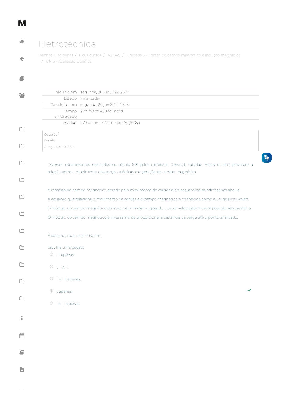 20/06/2022 23:27 UN 5 - Avaliação Objetiva: Revisão da tentativa https://avap.multivix.edu.br/mod/quiz/review.php?attempt=1541007&cmid=1032403 1/4 Minhas Disciplinas / Meus cursos / 421845 / Unidade 5 - Fontes do campo magnético e indução magnética / UN 5 - Avaliação Objetiva Eletrotécnica Iniciado em segunda, 20 jun 2022, 23:10 Estado Finalizada Concluída em segunda, 20 jun 2022, 23:13 Tempo empregado 2 minutos 42 segundos Avaliar 1,70 de um máximo de 1,70(100%) Questão 1 Correto Atingiu 0,34 de 0,34 Diversos experimentos realizados no século XIX pelos cientistas Oersted, Faraday, Henry e Lenz provaram a relação entre o movimento das cargas elétricas e a geração de campo magnético. A respeito do campo magnético gerado pelo movimento de cargas elétricas, analise as a�rmações abaixo: A equação que relaciona o movimento de cargas e o campo magnético é conhecida como a Lei de Biot-Savart. O módulo do campo magnético tem seu valor máximo quando o vetor velocidade e vetor posição são paralelos. O módulo do campo magnético é inversamente proporcional à distância da carga até o ponto analisado. É correto o que se a�rma em: Escolha uma opção: III, apenas. I, II e III. II e III, apenas. I, apenas. I e III, apenas. https://avap.multivix.edu.br/my/ https://avap.multivix.edu.br/course/view.php?id=14178 https://avap.multivix.edu.br/course/view.php?id=14178§ion=6 https://avap.multivix.edu.br/mod/quiz/view.php?id=1032403 https://avap.multivix.edu.br/my/ https://avap.multivix.edu.br/course/view.php?id=14178 https://avap.multivix.edu.br/user/index.php?id=14178 https://avap.multivix.edu.br/course/view.php?id=14178§ion=1 https://avap.multivix.edu.br/course/view.php?id=14178§ion=2 https://avap.multivix.edu.br/course/view.php?id=14178§ion=3 https://avap.multivix.edu.br/course/view.php?id=14178§ion=4 https://avap.multivix.edu.br/course/view.php?id=14178§ion=5 https://avap.multivix.edu.br/course/view.php?id=14178§ion=6 https://avap.multivix.edu.br/course/view.php?id=14178§ion=7 https://avap.multivix.edu.br/course/view.php?id=14178§ion=8 https://avap.multivix.edu.br/course/view.php?id=14178§ion=9 https://avap.multivix.edu.br/course/view.php?id=14178§ion=10 https://avap.multivix.edu.br/course/view.php?id=14178§ion=11 https://avap.multivix.edu.br/mod/page/view.php?id=1252%2F%22%20target%3D%22_blank https://avap.multivix.edu.br/calendar/view.php/ https://avap.multivix.edu.br/local/staticpage/view.php?page=biblioteca https://portalweb.multivix.edu.br/gabaritos/login.aspx https://multivix.edu.br/office-365/ https://avap.multivix.edu.br/ 20/06/2022 23:27 UN 5 - Avaliação Objetiva: Revisão da tentativa https://avap.multivix.edu.br/mod/quiz/review.php?attempt=1541007&cmid=1032403 2/4 Questão 2 Correto Atingiu 0,34 de 0,34 Questão 3 Correto Atingiu 0,34 de 0,34 A relação entre o �uxo magnético e a corrente de uma espira ou solenoide de�ne a indutância do dispositivo denominado indutor. A respeito da indutância e indutores, analise as a�rmações abaixo: O valor da indutância de um indutor é de�nido apenas pela geometria da construção dele. A energia que um indutor armazena em seu campo magnético é proporcional ao quadrado da corrente que ele transporta. A diferença de tensão em um indutor é proporcional à indutância e a variação de corrente no mesmo. É correto o que se a�rma em: Escolha uma opção: I e II, apenas. II, apenas I, II e III. II e III, apenas. I e III, apenas. O �uxo magnético é um conceito muito importante ao se analisar problemas que envolvem a indução magnética, pois permite obter o valor proporcional às linhas de campo magnético em uma região. Sobre o �uxo magnético é possível a�rmar: Escolha uma opção: O �uxo é inversamente proporcional à área analisada. O �uxo magnético é calculado por meio da integral de superfície e tem unidade chamada de tesla. O �uxo magnético é calculado por meio da integral de superfície e tem unidade chamada de Weber. O �uxo magnético não depende da intensidade do campo magnético. O �uxo magnético é máximo quando o vetor normal à superfície é perpendicular ao vetor campo magnético. https://avap.multivix.edu.br/my/ https://avap.multivix.edu.br/course/view.php?id=14178 https://avap.multivix.edu.br/user/index.php?id=14178 https://avap.multivix.edu.br/course/view.php?id=14178§ion=1 https://avap.multivix.edu.br/course/view.php?id=14178§ion=2 https://avap.multivix.edu.br/course/view.php?id=14178§ion=3 https://avap.multivix.edu.br/course/view.php?id=14178§ion=4 https://avap.multivix.edu.br/course/view.php?id=14178§ion=5 https://avap.multivix.edu.br/course/view.php?id=14178§ion=6 https://avap.multivix.edu.br/course/view.php?id=14178§ion=7 https://avap.multivix.edu.br/course/view.php?id=14178§ion=8 https://avap.multivix.edu.br/course/view.php?id=14178§ion=9 https://avap.multivix.edu.br/course/view.php?id=14178§ion=10 https://avap.multivix.edu.br/course/view.php?id=14178§ion=11 https://avap.multivix.edu.br/mod/page/view.php?id=1252%2F%22%20target%3D%22_blank https://avap.multivix.edu.br/calendar/view.php/ https://avap.multivix.edu.br/local/staticpage/view.php?page=biblioteca https://portalweb.multivix.edu.br/gabaritos/login.aspx https://multivix.edu.br/office-365/ https://avap.multivix.edu.br/ 20/06/2022 23:27 UN 5 - Avaliação Objetiva: Revisão da tentativa https://avap.multivix.edu.br/mod/quiz/review.php?attempt=1541007&cmid=1032403 3/4 Questão 4 Correto Atingiu 0,34 de 0,34 Michael Faraday fez diversos experimentos no século XIX com objetivo de relacionar o movimento de cargas e o campo magnético. Seus experimentos resultaram na Lei de Faraday. A respeito da Lei de Faraday, é possível a�rmar: Escolha uma opção: A Lei de Faraday relaciona a variação do campo elétrico com a indução de corrente elétrica em uma espira. A Lei de Faraday a�rma que qualquer con�guração de campo magnético em uma espira resulta numa corr