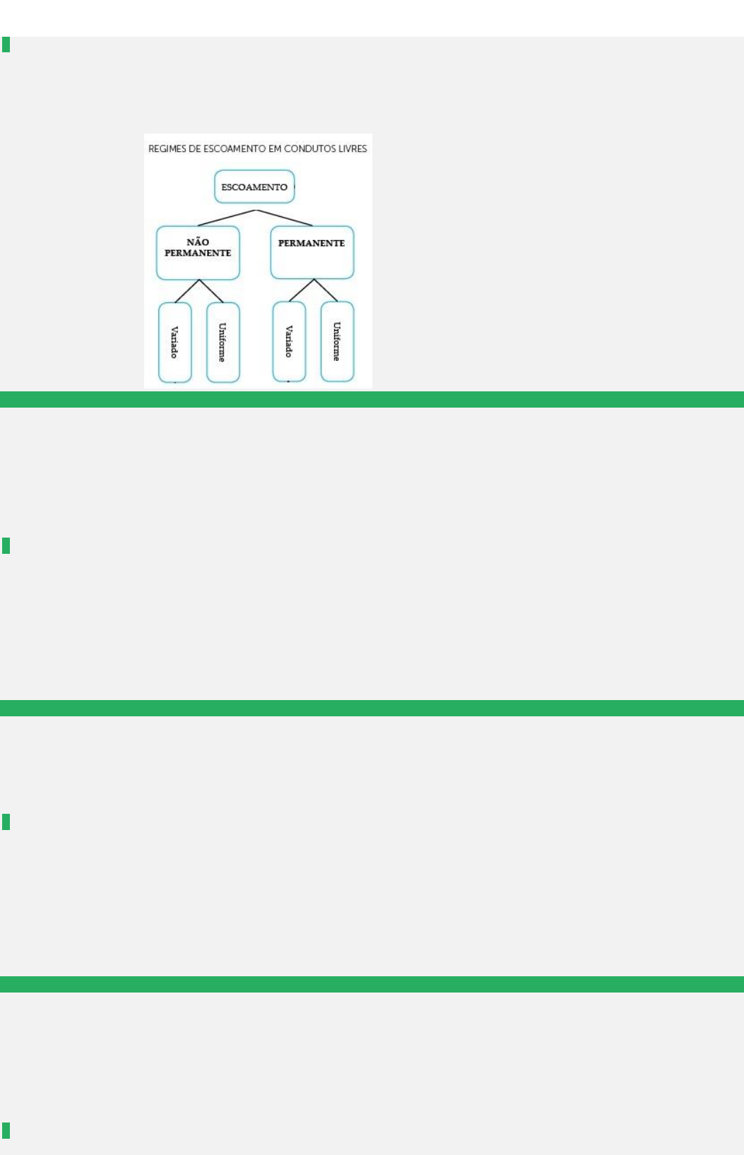 Avaliação II - Fundamentos de Hidráulica e Hidrometria 1O escoamento em condutos livres pode ser de diferentes tipos, conforme ilustrado na figura anexa. Com base nas definições de escoamento em regime permanente e regime não permanente, analise as sentenças a seguir: I- O escoamento em regime permanente é aquele em que a velocidade do fluido se altera em uma mesma linha de corrente ao longo do tempo. II- Em um escoamento permanente, as propriedades e características hidráulicas do fluido não variam com o tempo. III- Tanto o escoamento em regime permanente quanto em regime não permanente podem ser uniformes ou variados em relação à variação de velocidade da partícula em uma trajetória. Assinale a alternativa CORRETA: A As sentenças II e III estão corretas. B As sentenças I e II estão corretas. C Somente a sentença I está correta. D Somente a sentença III está correta. 2Os condutos livres ou canais abertos transportam o líquido através de um escoamento por meio da ação da gravidade, uma vez que nesses canais a pressão atmosférica atua em ao menos um ponto ao longo do escoamento. O diâmetro hidráulico e o raio hidráulico são dois elementos geométricos utilizados no cálculo de canais abertos. Com base na relação entre diâmetro hidráulico e raio hidráulico, analise as sentenças a seguir: I- O diâmetro hidráulico representa um quarto do valor do raio hidráulico. II- O raio hidráulico representa um quarto do valor do diâmetro hidráulico. III- O raio hidráulico é a razão entre a área de seção transversal do canal e o seu perímetro molhado. Assinale a alternativa CORRETA: A Somente a sentença I está correta. B As sentenças II e III estão corretas. C Somente a sentença III está correta. D As sentenças I e II estão corretas. 3O escoamento de um líquido em declive em qualquer conduto com a superfície livre do líquido exposta à atmosfera é chamado de escoamento em canal aberto ou, mais comumente, escoamento livre. Esse tipo de escoamento difere do realizado em conduto forçado ou fechado. Sobre as características e definições de um escoamento em canal aberto, classifique V para as sentenças verdadeiras e F para as falsas: ( ) Exemplos de condutos livres artificiais são as galerias e aquedutos, utilizados para transporte de água e os canais de irrigação. ( ) O escoamento de um líquido em conduto fechado pode ser considerado escoamento livre quando a pressão atuante em sua geratriz interna superior é maior do que a pressão atmosférica. ( ) Exemplos de condutos livres naturais são as calhas de rios, riachos e estuários, que são os espaços que podem ser ocupados por um curso de água. Assinale a alternativa que apresenta a sequência CORRETA: A V - F - V. B V - V - F. C F - V - F. D F - F - V. 4Os condutos livres ou canais abertos transportam o líquido através de um escoamento por meio da ação da gravidade, uma vez que nesses canais a pressão atmosférica atua em ao menos um ponto ao longo do escoamento. O diâmetro hidráulico e o raio hidráulico são dois elementos geométricos utilizados no cálculo de canais abertos. Sobre a relação entre diâmetro hidráulico (Dh) e raio hidráulico (Rh), assinale a alternativa CORRETA: A Rh = Dh / 2. B Dh = Rh / 2. C Rh = Dh / 4. D Dh = Rh / 4. 5O escoamento de um líquido em declive em qualquer conduto com a superfície livre do líquido exposta à atmosfera é chamado de escoamento em canal aberto ou, mais comumente, escoamento livre. Esse tipo de escoamento difere do realizado em conduto forçado ou fechado. Sobre as características e definições de um escoamento em canal aberto, classifique V para as sentenças verdadeiras e F para as falsas: ( ) O escoamento em canal aberto pode se dar pela condução de água em uma seção aberta, como em canais de irrigação e drenagem. ( ) O escoamento de um líquido em conduto fechado pode ser considerado escoamento livre quando a pressão atuante em sua geratriz interna superior é igual à pressão atmosférica. ( ) O escoamento de um gás será sempre considerado um escoamento livre, independentemente da pressão interna do conduto. Assinale a alternativa que apresenta a sequência CORRETA: A F - V - F. B V - V - F. C F - F - V. D V - F - V. 6A declividade do fundo do canal (s0) é definida como o desnível vertical dividido pelo comprimento horizontal do fundo, de acordo com a expressão ilustrada na imagem. A declividade também pode ser expressa como uma porcentagem, multiplicando o resultado por 100. Considere dois canais abertos de concreto com seção transversal trapezoidal: Canal 1: apresenta um rebaixo de 56cm em uma extensão de 22m. Canal 2: apresenta um rebaixo de 98cm em uma extensão de 44m. Com base no cálculo da declividade do fundo de canal dos canais 1 e 2, classifique V para as sentenças verdadeiras e F para as falsas: ( ) O canal 1 apresenta uma declividade de fundo igual a 2,54%. ( ) O canal 1 apresenta uma declividade de fundo igual a 2,54m/m. ( ) O canal 2 apresenta uma declividade de fundo igual a 2,23m/m. Assinale a alternativa que apresenta a sequência CORRETA: A V - F - V. B V - F - F. C F - V - F. D F - V - V. 7Assim como ocorre no escoamento em condutos forçados, o regime de escoamento em canais abertos pode ser classificado em laminar ou turbulento a partir do cálculo do parâmetro adimensional chamado de número de Reynolds (Re). Com base nesse parâmetro hidráulico, assinale a alternativa CORRETA: A Quando o número de Reynolds (Re) para um escoamento em canal aberto for menor que 2000, ele é classificado como escoamento em regime turbulento. B O cálculo do número de Reynolds (Re) para a hidráulica de canais abertos leva em consideração a velocidade média na seção, o raio hidráulico da seção do canal e a pressão do escoamento. C O cálculo do número de Reynolds (Re) para a hidráulica de canais abertos leva em consideração a velocidade média na seção, o raio hidrá
