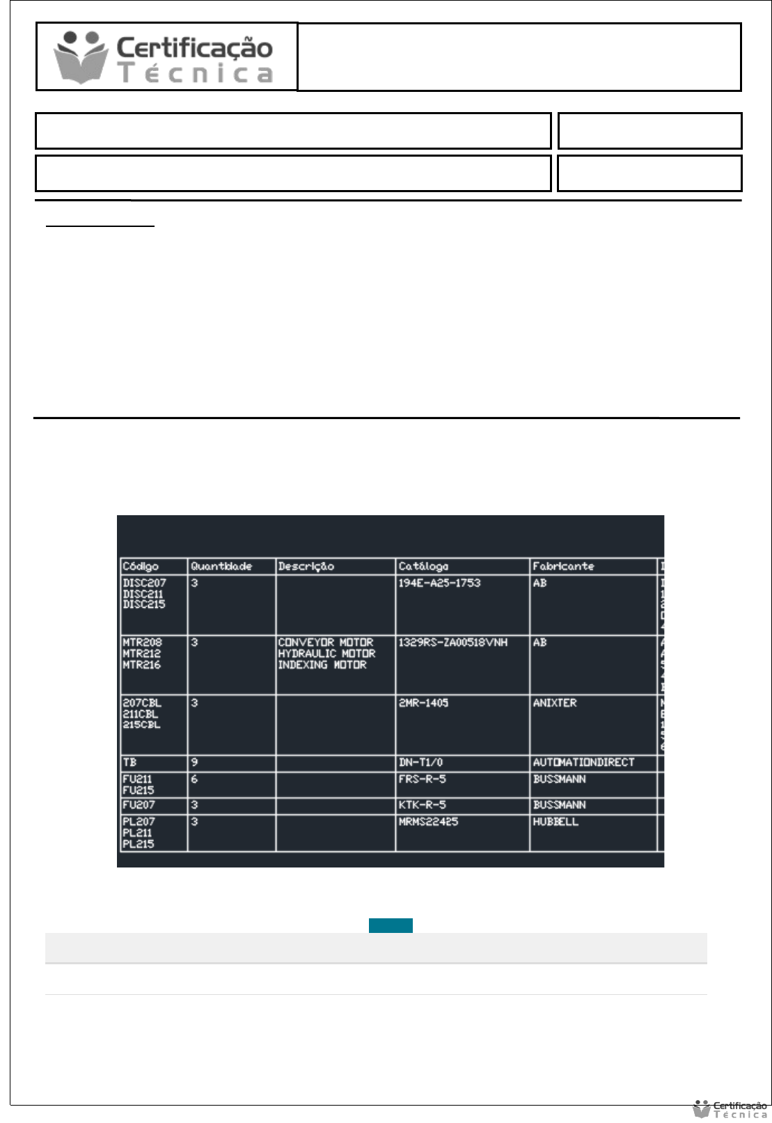 Autocad Electrical 2016 Fundamentos Data: . Aluno (a): Avaliação Pratica INSTRUÇÕES: · Esta Avaliação contém 1 (uma) questão, totalizando 10 (dez) pontos; · Baixe o arquivo disponível com a Atividade Pratica; · Você deve preencher dos dados no Cabeçalho para sua identificação: · Nome / Data de entrega. · As respostas devem ser digitadas abaixo de cada pergunta; · Ao terminar grave o arquivo com o nome Atividade Prática; · Quando solicitado · Envio o arquivo pelo sistema no local indicado; · Em caso de dúvidas consulte o seu Tutor. Crie uma nova folha, chamada relatório, e crie uma lista de peças para serem compradas e uma lista de peças com os componentes que não possuem catálogo. Faça download dos arquivos do curso usados nesta aula • A lista de peças que devem ser compradas se chama "Bill of Material". A lista de peças com os componentes que não possuem fabricantes se chama "Missing Bill of Material". Anterior Comando Atalho Descrição New Drawing acenewdrawing Inserir um novo desenho no projeto Reports aeschematicreports Gerar diversos tipos de relatórios de um projeto elétrico