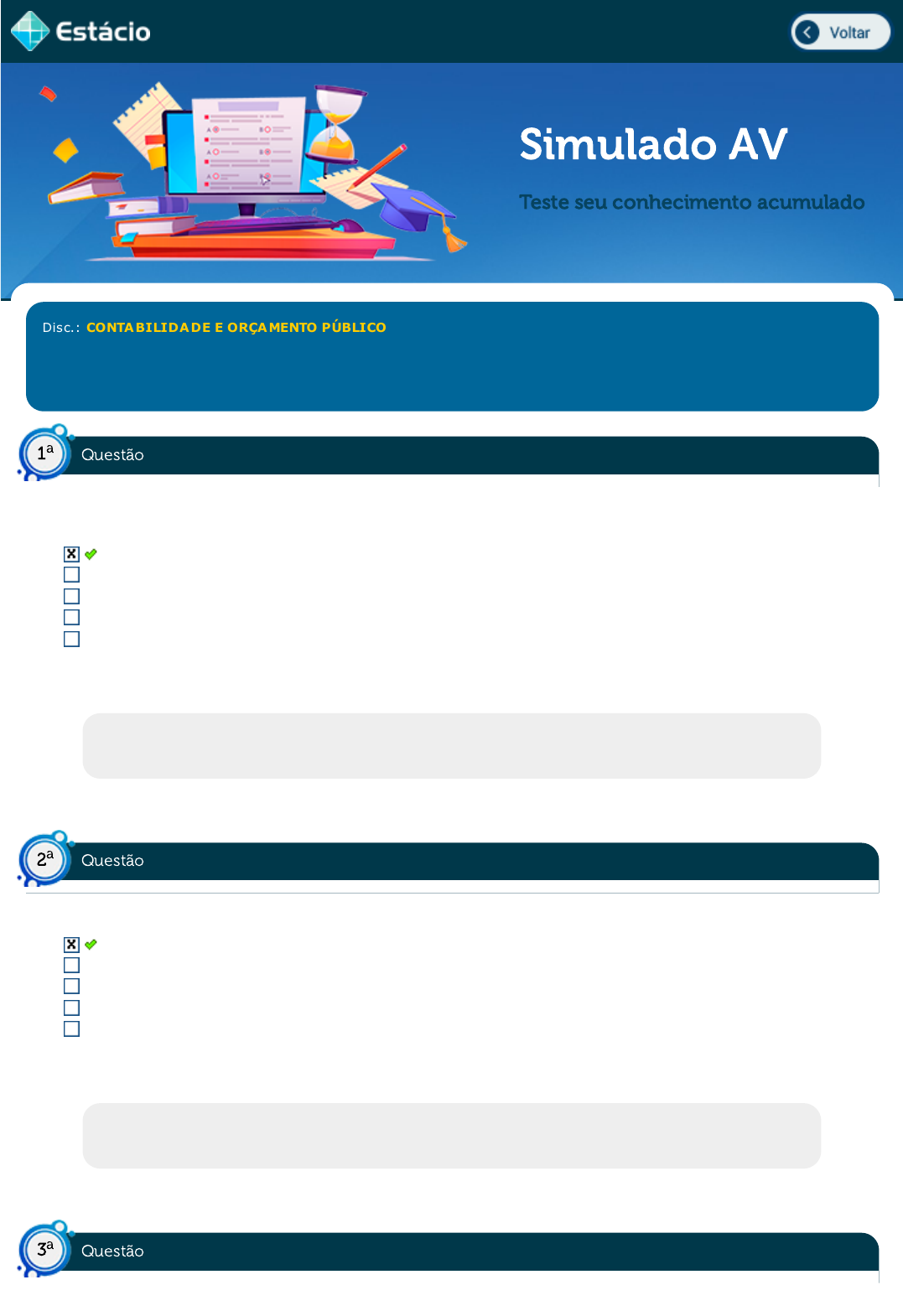Simulado AV Teste seu conhecimento acumulado Disc.: CONTABILIDADE E ORÇAMENTO PÚBLICO Aluno(a): HUGO CONSTANTINO DOS SANTOS 201807043274 Acertos: 10,0 de 10,0 08/04/2022 Acerto: 1,0 / 1,0 Quais dos seguintes demonstrativos só foi tornado obrigatório com a introdução da Resolução CFC 1133/08? Demonstração dos Fluxos de Caixa Balanço Orçamentário Demonstração das Variações Patrimoniais Balanço Patrimonial Balanço Financeiro Respondido em 08/04/2022 15:29:48 Explicação: A resposta correta é: Demonstração dos Fluxos de Caixa Acerto: 1,0 / 1,0 Não são classificadas como passivos, passivos contingentes ou provisões: Benefícios Sociais Ações judiciais que são prováveis que o Estado perca Impostos que o Estado tenha que retribuir aos contribuintes Dívidas que o Estado tenha com fornecedores Dívidas públicas onerosas Respondido em 08/04/2022 15:35:07 Explicação: A resposta correta é: Benefícios Sociais Acerto: 1,0 / 1,0 Existe a possibilidade de que o orçamento do TRF da 3ª Região não tenha computadas ou tenha Questão1 a Questão2 a Questão3 a https://simulado.estacio.br/alunos/inicio.asp javascript:voltar(); insuficientemente dotadas autorizações para determinadas despesas. Nesse caso, a Lei nº 4.320/1964 prevê como solução a abertura de créditos adicionais, que podem ser classificados em suplementares, especiais e extraordinários. É regra atinente aos créditos adicionais que: São especiais os destinados a reforço de dotação orçamentária. São extraordinários os destinados a despesas para as quais não haja dotação orçamentária específica. Os créditos suplementares, especiais e extraordinários devem ser autorizados por lei. A abertura de crédito adicional destinado à despesa urgente e imprevista em caso de calamidade pública independe de ciência ao Poder Legislativo. Consideram-se recursos disponíveis para a abertura de créditos suplementares os resultantes de anulação parcial de dotação orçamentária. Respondido em 08/04/2022 15:35:24 Explicação: A resposta correta é: Consideram-se recursos disponíveis para a abertura de créditos suplementares os resultantes de anulação parcial de dotação orçamentária. Acerto: 1,0 / 1,0 No mês de março de 2015, o Secretário da Fazenda do Estado do Cerrado do Norte solicitou ao setor de contabilidade que procedesse à reserva de recursos orçamentários, no valor de R$60.000,00, destinados à aquisição de vinte computadores para o departamento de rendas mobiliárias. O contador chefe manifestou- se, informando que, na lei orçamentária para o exercício de 2015, não consta dotação orçamentária específica para a aquisição de computadores. Assim, deve o Poder Executivo, nos termos da Lei Federal nº 4.320/1964, abrir um crédito adicional: Extraoficial Extraorçamentário Especial Suplementar Ordinário Respondido em 08/04/2022 15:39:40 Explicação: A resposta correta é: Especial Acerto: 1,0 / 1,0 Segundo o que está disposto no art. 165 da Constituição Federal de 1988 (CF/1988): A lei orçamentária anual compreenderá: Analise as afirmativas a seguir: I - O orçamento fiscal referente aos Poderes da União, seus fundos, órgãos e entidades da administração direta e indireta, inclusive fundações instituídas e mantidas pelo poder público. II - O orçamento de investimento das empresas em que a União, apenas diretamente, detenha a maioria do capital social com direito a voto. III - O orçamento da seguridade social, abrangendo todas as entidades e órgãos a ela vinculados, da administração direta ou indireta, bem como os fundos e fundações instituídos e mantidos pelo poder privado. Estão(á) CORRETA(S): II e III. I e II. Questão4 a Questão5 a I. I e III. I, II, III. Respondido em 08/04/2022 15:45:55 Explicação: A resposta correta é: I. Acerto: 1,0 / 1,0 É tipo de orçamento que funciona como um plano de trabalho, um instrumento de planejamento da ação governamental, por meio da identificação dos seus projetos e atividades, bem como pelo estabelecimento dos objetivos e metas a serem implementados dentro de determinado período, com a previsão dos custos relacionados. Trata-se do orçamento: De base zero Participativo Programa Clássico De desempenho Respondido em 08/04/2022 15:46:27 Explicação: A resposta correta é: Programa Acerto: 1,0 / 1,0 É classificada como receita de capital aquela proveniente de: venda de produtos agropecuários oriundos de propriedades rurais do ente público. locação de bens imóveis de propriedade do ente público. juros de empréstimos efetuados pelo ente público à empresa estatal dependente. alienação de bens móveis de propriedade do ente público. foros e laudêmios cobrados pelo Poder Público. Respondido em 08/04/2022 15:49:27 Explicação: A resposta correta é: alienação de bens móveis de propriedade do ente público. Acerto: 1,0 / 1,0 Um contabilista da União promoveu a seguinte classificação de despesa pública: DESPESAS DE CUSTEIO − serviços de terceiros − subvenções sociais TRANSFERÊNCIAS CORRENTES Questão6 a Questão7 a Questão8 a - inativos - salário-família DESPESAS DE CAPITAL - juros da dívida pública Conforme dita a Lei nº 4.320/64, essa classificação está INCORRETA, uma vez que: serviços de terceiros e juros da dívida pública são despesas de capital. serviços de terceiros e inativos são transferências correntes. salário-família e inativos são despesas de custeio. serviços de terceiros e inativos são despesas de custeio. subvenções sociais e juros da dívida pública são transferências correntes. Respondido em 08/04/2022 15:50:18 Explicação: A resposta correta é: subvenções sociais e juros da dívida pública são transferências correntes. Acerto: 1,0 / 1,0 Considere que determinada dotação orçamentária para cobrir despesas no exercício mostrou-se insuficiente. Portanto, a administração poderá pleitear um crédito adicional: Or