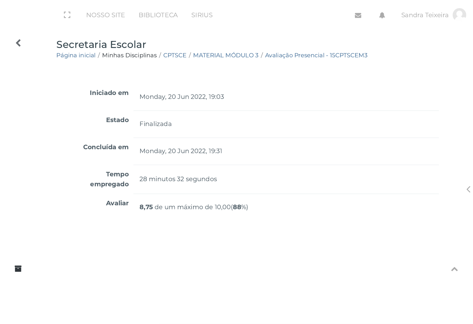 Página inicial / Minhas Disciplinas / CPTSCE / MATERIAL MÓDULO 3 / Avaliação Presencial - 15CPTSCEM3 Secretaria Escolar Iniciado em Monday, 20 Jun 2022, 19:03 Estado Finalizada Concluída em Monday, 20 Jun 2022, 19:31 Tempo empregado 28 minutos 32 segundos Avaliar 8,75 de um máximo de 10,00(88%) NOSSO SITE BIBLIOTECA SIRIUS Sandra Teixeira https://ava.politecnicabr.com.br/ https://ava.politecnicabr.com.br/course/view.php?id=1167 https://ava.politecnicabr.com.br/course/view.php?id=1167#section-8 https://ava.politecnicabr.com.br/mod/quiz/view.php?id=34706 https://ava.politecnicabr.com.br/course/view.php?id=1167 javascript:void(0) javascript:void(0) javascript:void(0) javascript:void(0) javascript:void(0) https://ava.politecnicabr.com.br/course/index.php https://ava.politecnicabr.com.br/ https://www.politecnicabr.com.br/ https://biblioteca.politecnicabr.com.br/student http://sirius.politecnicabr.com.br/ javascript:void(0) javascript:void(0) Questão 1 Completo Atingiu 0,25 de 0,25 Assinale Verdadeiro ou Falso: Construir o projeto da instituição de ensino requer planejamento e avaliação em uma construção coletiva, continuada e contextualizada. Conforme a�rma Veiga (2000, p. 11-13) mesmo que para a educação básica, contudo com fundamentação inclusive para o ensino superior: [...] É re�etir acerca da construção do projeto político pedagógico, entendido como a própria organização do trabalho pedagógico da escola como um todo [...] A escola é o lugar de concepção, realização e avaliação de seu projeto educativo, uma vez que necessita organizar seu trabalho pedagógico com base em seus alunos. [...] O projeto ao se constituir em processo democrático de decisões, preocupa-se m instaurar uma forma de organização de trabalho pedagógico que supere os con�itos, buscando eliminar as relações competitivas, corporativas e autoritárias, rompendo com a rotina e a racionalização da burocracia que permeia as relações no interior da escola, diminuindo os efeitos da divisão do trabalho que reforça as diferenças e hierarquiza os poderes de decisão. (VEIGA, 2000, p. 13) Planejar faz parte das rotinas diárias, devendo superar a obrigação, a rotina burocrática, e é um momento de troca, de construção, de visão de futuro. Construir o Projeto Pedagógico Institucional é objetivar a transformação da realidade de forma re�exiva, consciente e crítica. Mas o que é tudo isso senão o planejamento participativo, que busca uma atitude prática re�exiva, permitindo que o agir e o pensar se interliguem conscientemente para alcançar o conhecimento. Veiga (2000, p. 133) chama a atenção para o planejamento articulado com a vivência da instituição de ensino: [...] As temáticas do planejamento participativo e do projeto pedagógico da escola, referenciando-as a uma proposta concreta de planejamento que vem sendo construída ao mesmo tempo em que é vivenciada por coletivos humanos singulares, incluindo-se, entre eles, grupos e instituições que interatuem numa comunidade escolar também singular. A re�exão sobre o planejamento NOSSO SITE BIBLIOTECA SIRIUS Sandra Teixeira https://ava.politecnicabr.com.br/course/view.php?id=1167 javascript:void(0) javascript:void(0) javascript:void(0) javascript:void(0) javascript:void(0) https://ava.politecnicabr.com.br/course/index.php https://ava.politecnicabr.com.br/ https://www.politecnicabr.com.br/ https://biblioteca.politecnicabr.com.br/student http://sirius.politecnicabr.com.br/ javascript:void(0) javascript:void(0) participativo deverá percorrer os pressupostos da proposta referenciada; a construção teórico-metodológica do objeto do planejamento; fazer considerações sobre os sujeitos que o projeto integra e descrever alguns instrumentos técnicos que ajudarão a viabilizar o plano, no caso, o projeto político pedagógico da escola. O eixo da re�exão estará em torno da capacidade de um planejamento participativo e seu produto – o projeto político pedagógico da escola – possibilitar a vivência da prática re�exiva, democrática e democratizante e, com isso, atuarem no sentido da construção de identidades, da escola e dos sujeitos que ela congrega. Escolha uma opção: Verdadeiro Falso NOSSO SITE BIBLIOTECA SIRIUS Sandra Teixeira https://ava.politecnicabr.com.br/course/view.php?id=1167 javascript:void(0) javascript:void(0) javascript:void(0) javascript:void(0) javascript:void(0) https://ava.politecnicabr.com.br/course/index.php https://ava.politecnicabr.com.br/ https://www.politecnicabr.com.br/ https://biblioteca.politecnicabr.com.br/student http://sirius.politecnicabr.com.br/ javascript:void(0) javascript:void(0) Questão 2 Completo Atingiu 0,25 de 0,25 Marque Verdadeiro ou Falso, quanto as Eleições de diretores: ( ) Essa função, ao longo dos anos, pro�ssionalizou-se de tal forma que, antigamente, falava-se em administração da escola. Nos dias de hoje, é a busca pela gestão de qualidade que tem invadido espaços universitários e não universitários, empresas e instituições educacionais, sejam elas públicas ou privadas. ( ) O movimento em torno da realização de eleições para diretores de escola ocorreu no �nal dos anos 1980 e início dos anos 1990, quando o país estava ávido por eleições. ( ) O gestor atual precisa ter liderança, entender de gestão de recursos humanos e saber negociar, “Mas o grande desa�o é que ele consiga construir um projeto educacional. O diretor é um gestor de situações educativas. Na escola, gerir é educar” (NA ESCOLA, 2005). Escolha uma opção: a. F, F, V. b. V, V, V. c. V, V, F. d. V, F, F. e. V, F, V. NOSSO SITE BIBLIOTECA SIRIUS Sandra Teixeira https://ava.politecnicabr.com.br/course/view.php?id=1167 javascript:void(0) javascript:void(0) javascript:void(0) javascript:void(0) javascript:void(0) https://ava.politecnicabr.com.br/course/index.php https://ava.politecnicabr.com.br/ https://www.politecnicabr.com.br/ https://bibliote