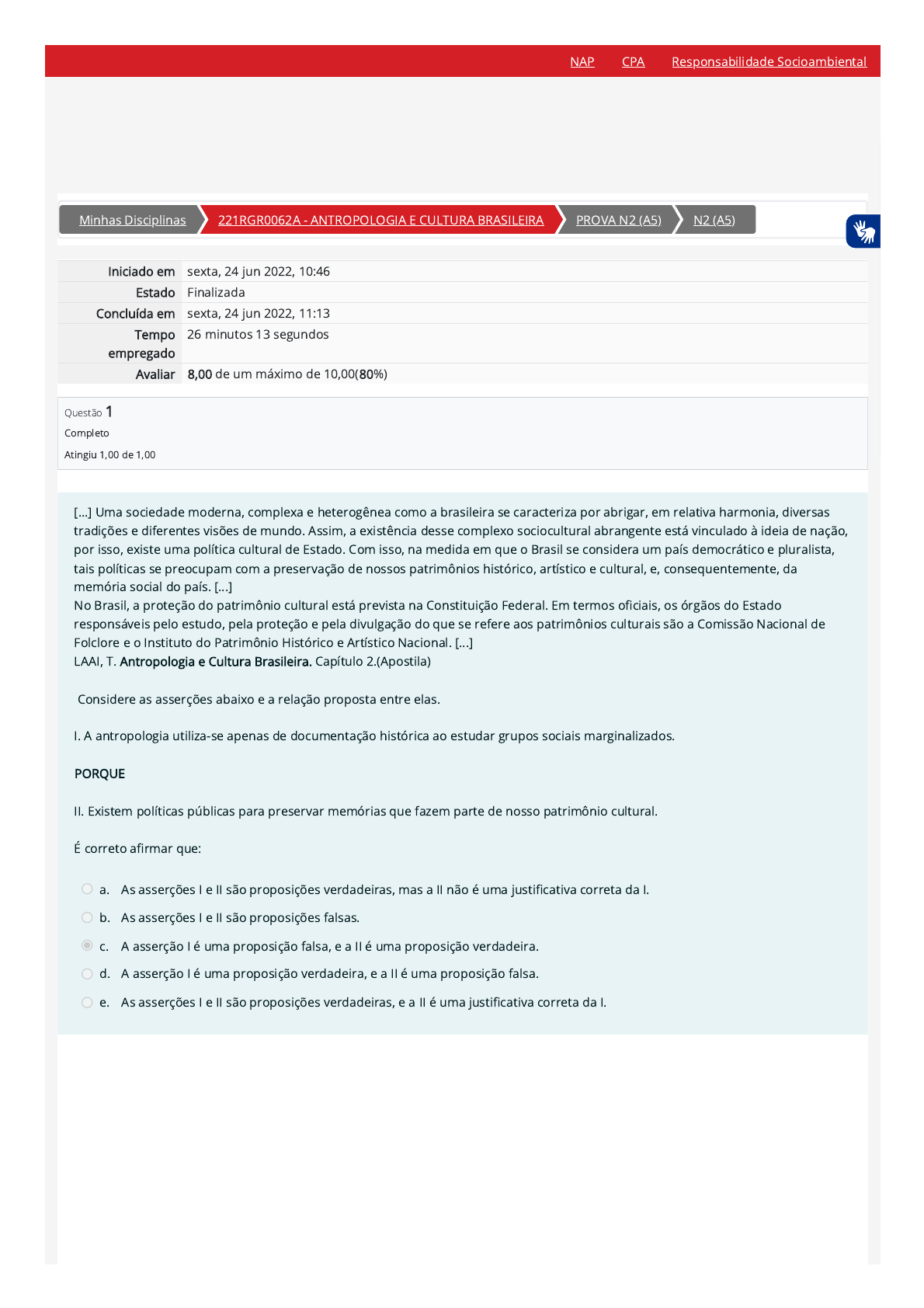 6/24/22, 11:13 AM N2 (A5): Revisão da tentativa https://ambienteacademico.com.br/mod/quiz/review.php?attempt=922821&cmid=338158 1/6 Minhas Disciplinas 221RGR0062A - ANTROPOLOGIA E CULTURA BRASILEIRA PROVA N2 (A5) N2 (A5) Iniciado em sexta, 24 jun 2022, 10:46 Estado Finalizada Concluída em sexta, 24 jun 2022, 11:13 Tempo empregado 26 minutos 13 segundos Avaliar 8,00 de um máximo de 10,00(80%) Questão 1 Completo Atingiu 1,00 de 1,00 [...] Uma sociedade moderna, complexa e heterogênea como a brasileira se caracteriza por abrigar, em relativa harmonia, diversas tradições e diferentes visões de mundo. Assim, a existência desse complexo sociocultural abrangente está vinculado à ideia de nação, por isso, existe uma política cultural de Estado. Com isso, na medida em que o Brasil se considera um país democrático e pluralista, tais políticas se preocupam com a preservação de nossos patrimônios histórico, artístico e cultural, e, consequentemente, da memória social do país. [...] No Brasil, a proteção do patrimônio cultural está prevista na Constituição Federal. Em termos o�ciais, os órgãos do Estado responsáveis pelo estudo, pela proteção e pela divulgação do que se refere aos patrimônios culturais são a Comissão Nacional de Folclore e o Instituto do Patrimônio Histórico e Artístico Nacional. [...] LAAI, T. Antropologia e Cultura Brasileira. Capítulo 2.(Apostila) Considere as asserções abaixo e a relação proposta entre elas. I. A antropologia utiliza-se apenas de documentação histórica ao estudar grupos sociais marginalizados. PORQUE II. Existem políticas públicas para preservar memórias que fazem parte de nosso patrimônio cultural. É correto a�rmar que: a. As asserções I e II são proposições verdadeiras, mas a II não é uma justi�cativa correta da I. b. As asserções I e II são proposições falsas. c. A asserção I é uma proposição falsa, e a II é uma proposição verdadeira. d. A asserção I é uma proposição verdadeira, e a II é uma proposição falsa. e. As asserções I e II são proposições verdadeiras, e a II é uma justi�cativa correta da I. NAP CPA Responsabilidade Socioambiental https://ambienteacademico.com.br/my/ https://ambienteacademico.com.br/course/view.php?id=12218 https://ambienteacademico.com.br/course/view.php?id=12218§ion=6 https://ambienteacademico.com.br/mod/quiz/view.php?id=338158 https://codely-fmu-content.s3.amazonaws.com/Moodle/NAP/inicial/nap/fmu/index.html https://codely-fmu-content.s3.amazonaws.com/Moodle/CPA/landing_CPA/index.html https://portal.fmu.br/sustentabilidade 6/24/22, 11:13 AM N2 (A5): Revisão da tentativa https://ambienteacademico.com.br/mod/quiz/review.php?attempt=922821&cmid=338158 2/6 Questão 2 Completo Atingiu 1,00 de 1,00 Questão 3 Completo Atingiu 1,00 de 1,00 Na sua obra de 1976, Cultura e razão prática, o antropólogo americano Marshall Sahlins (2003) propôs uma crítica à visão marxista, a qual a�rma que a economia é uma esfera autônoma da vida social, regida por uma racionalidade prática que só almeja a sobrevivência. Para o autor, o valor de uso dos objetos é uma construção social, assim como seu valor de troca. A utilidade das coisas não derivaria necessariamente de sua relação com a sobrevivência, mas de uma combinação entre praticidade e simbolismo, em permanente reelaboração dentro de determinada cultura. Ou seja, nenhuma explicação "funcional" sobre o valor de um objeto para determinado grupo seria o su�ciente, já que esse valor funcional sempre é relativo a um sistema cultural especí�co. Do mesmo modo, não é possível interpretar qualquer forma cultural como necessariamente dependente de um esquema prático. Com isso, o autor não quer dizer que as coisas materiais não produzam efeitos reais na cultura, mas que esses efeitos só podem ser interpretados a partir de sua integração no sistema cultural. SAILANI, Cris�an Jobi. Globalização, Cultura e Iden�dade. 1. Ed. Curi�ba: Intersaberes, 2012, 206 p. Segundo Sahlins, em Cultura e razão prática: a. Bens materiais não produzem valor em uma cultura e sim efeitos derivados de sua integração no sistema. b. A economia é regida pelo racional e busca a sobrevivência de um povo. c. Na visão marxista o valor "funcional" de um é relativo a um sistema cultural especí�co. d. A utilização de cada objeto de consumo é intrínseca a ele e atende uma necessidade especí�ca. e. Objetos têm valor social, valor esse não restrito ao valor de troca. ... a partir do século XIX, na medida em que fósseis humanos e restos arqueológicos vão sendo descobertos, que a Antropologia progride a passos largos, fruto de um acúmulo de descobertas anteriores e do desenvolvimento de novas formas de pesquisa. [...] quatro antropólogos são os pais fundadores dessa ciência. LAAI, T. Antropologia e Cultura Brasileira. (Apostila) Em seu trabalho, os quatro antropólogos mencionados no texto: I - Analisaram as tradições culturais de forma relativa e evolucionista. II - Consideraram as diferentes culturas não superiores nem inferiores. III - Realizaram seus estudos na Alemanha, seu contexto acadêmico. IV - Aproveitaram descobertas e formas de pesquisa utilizadas anteriormente. É correto o que se a�rma em a. I e IV, apenas. b. II e IV, apenas. c. I, II, III e IV. d. I e III, apenas. e. I, III e IV, apenas. NAP CPA Responsabilidade Socioambiental https://laureatebrasil.blackboard.com/webapps/ga-bibliotecaSSO-BBLEARN/homePearson https://laureatebrasil.blackboard.com/webapps/ga-bibliotecaSSO-BBLEARN/homePearson https://laureatebrasil.blackboard.com/webapps/ga-bibliotecaSSO-BBLEARN/homePearson https://codely-fmu-content.s3.amazonaws.com/Moodle/NAP/inicial/nap/fmu/index.html https://codely-fmu-content.s3.amazonaws.com/Moodle/CPA/landing_CPA/index.html https://portal.fmu.br/sustentabilidade 6/24/22, 11:13 AM N2 (A5): Revisão da tentativa https://ambienteacademico.com.br/mod/qui