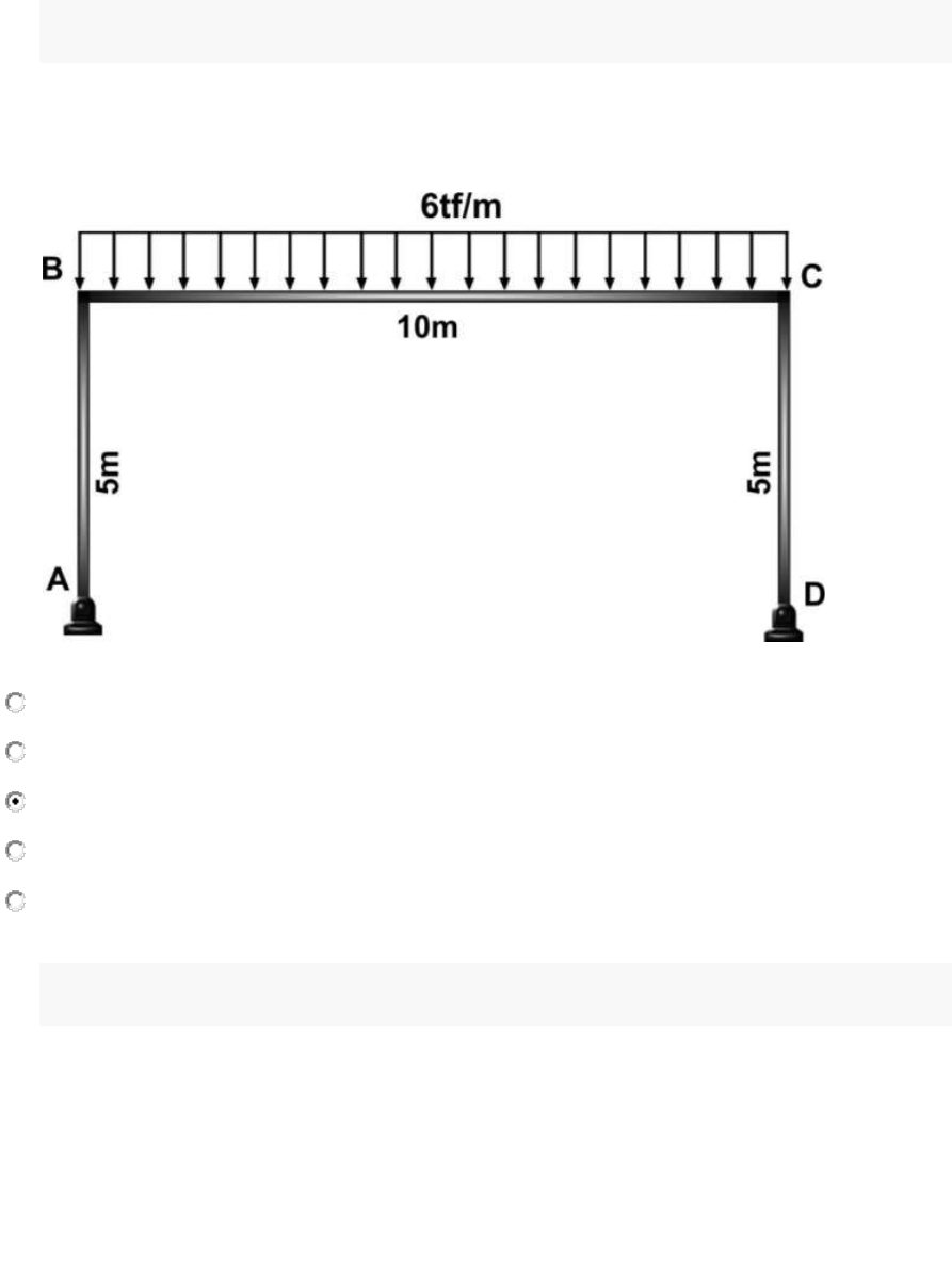 Questão 1 (Hibberle, 2012 – Adaptado) O pórtico a seguir serve de suporte para uma ponte. Supondo EI=constante, as reações de apoio horizontais valerão, em módulo (sugestão: utilize o método das forças): Escolha uma opção: a. 0tf e 0tf b. 2,5tf e 0,17tf c. 7,5tf e 7,5tf d. 0,13tf e 0,13tf e. 7,5tf e 0,13tf Questão 2 Considerando que a viga AB, de EI constante, está perfeitamente engastada em suas extremidades e que a parede de tijolos indicada na figura a seguir aplica sobre essa viga uma carga uniformemente distribuída igual a 2tf/m, o momento em A será (sugestão: utilize o teorema de Menabrea e considere, inicialmente, a carga valendo q e o vão valendo L). Escolha uma opção: a. 4tf.m b. 6tf.m c. 2,25tf.m d. 8tf.m e. 2tf.m Limpar minha escolha Questão 3 Os valores, em módulo, dos momentos e reações de apoio da seguinte viga (de EI constante), são, respectivamente (sugestão: utilize o método das forças): Escolha uma opção: a. 2,67tf.m e 4tf b. 1,33tf.m e 4tf c. 1,33tf.m e 1tf d. 2,67tf.m e 2tf e. 1,33tf.m e 2tf Limpar minha escolha Questão 4 O valor, em módulo, do momento sobre o apoio intermediário da viga a seguir, de inércia e módulo de elasticidade constantes, é (sugestão: utilize o método dos deslocamentos): Escolha uma opção: a. 112,5 kN.m b. 81,25 kN.m c. 31,25 kN.m d. 37,5 kN.m e. 50 kN.m Limpar minha escolha Questão 5 Considerando que a treliça isostática indicada a seguir seja construída com barras de módulo de elasticidade E=2.107tf/m2 e área da seção igual a 0,005m2, o deslocamento vertical do nó D, quando este for solicitado por uma carga de 50tf, será (sugestão: substitua a carga de 50tf por P, adote como comprimentos das barras os valores a, 1,5ª e √3,25a, utilize o teorema de Castigliano e aplique ao resultado final os valores numéricos): Escolha uma ou mais: a. 0,00194m b. 0,0194m c. 0,097m d. 0,00485m e. 0,0097m Questão 6 Sendo a treliça abaixo constituída de barras com E=2.108kN/m2 e A=0,01m2, o valor do deslocamento horizontal do ponto B, se P valer 100kN e a medir 2m, será (sugestão: utilize o teorema de Castigliano e substitua as variáveis pelos valores numéricos ao final): Escolha uma opção: a. 3,41.10-4m b. 2,83.10-4m c. 2,83.10-3m d. 4,83.10-4m e. 3,41.10-3m Limpar minha escolha Questão 7 Considere que sobre um viga isostática engastada em uma extremidade, com EI constante igual a 2.104 kN.m2, atue uma carga concentrada de 10kN, conforme mostra a figura a seguir. Nessas condições, o valor do deslocamento vertical no ponto B será (sugestão: utilize o segundo teorema de Castigliano): Escolha uma opção: a. 0,045m b. 0,0045m c. 0,00045m d. 0,015m e. 0,0015m Limpar minha escolha Questão 8 Os valores das reações verticais de apoio da seguinte viga (de EI constante) em A, B, C e D são, respectivamente (sugestão: utilize o método dos deslocamentos): Escolha uma opção: a. 0,246tf; 0,181tf; 0,469tf e 0,404tf b. 0,246tf; 0,181tf; 8,469tf e 4,596tf c. 1,754tf; 5,181tf; 0,469tf e 0,404tf d. 1,754tf; 5,181tf; 8,469tf e 4,596tf e. 4,596tf; 8,469tf; 5,181tf e 1,754tf Limpar minha escolha Questão 9 A expressão que define o deslocamento vertical na extremidade livre da seguinte viga isostática submetida a uma carga distribuída conforme indica a figura a seguir, considerando EI constante, é (sugestão: aplique uma carga P concentrada para baixo na extremidade livre, utilize o segundo teorema de Castigliano e iguale P a zero). Escolha uma opção: a. (qL5)/(5EI) b. (qL4)/(16EI) c. (qL5)/(2EI) d. (qL4)/(4EI) e. (qL4)/(8EI) Limpar minha escolha Questão 10 O valor, em módulo, da força normal na barra BD da treliça internamente hiperestática indicada abaixo, construída com barras de EA constante, é (sugestão: utilize o método das forças): Escolha uma opção: a. 0,089 tf b. 11,213 tf c. 8,918 tf d. 1,121 tf e. 0,892 tf Limpar minha escolha OBS.: NOTA 9,0