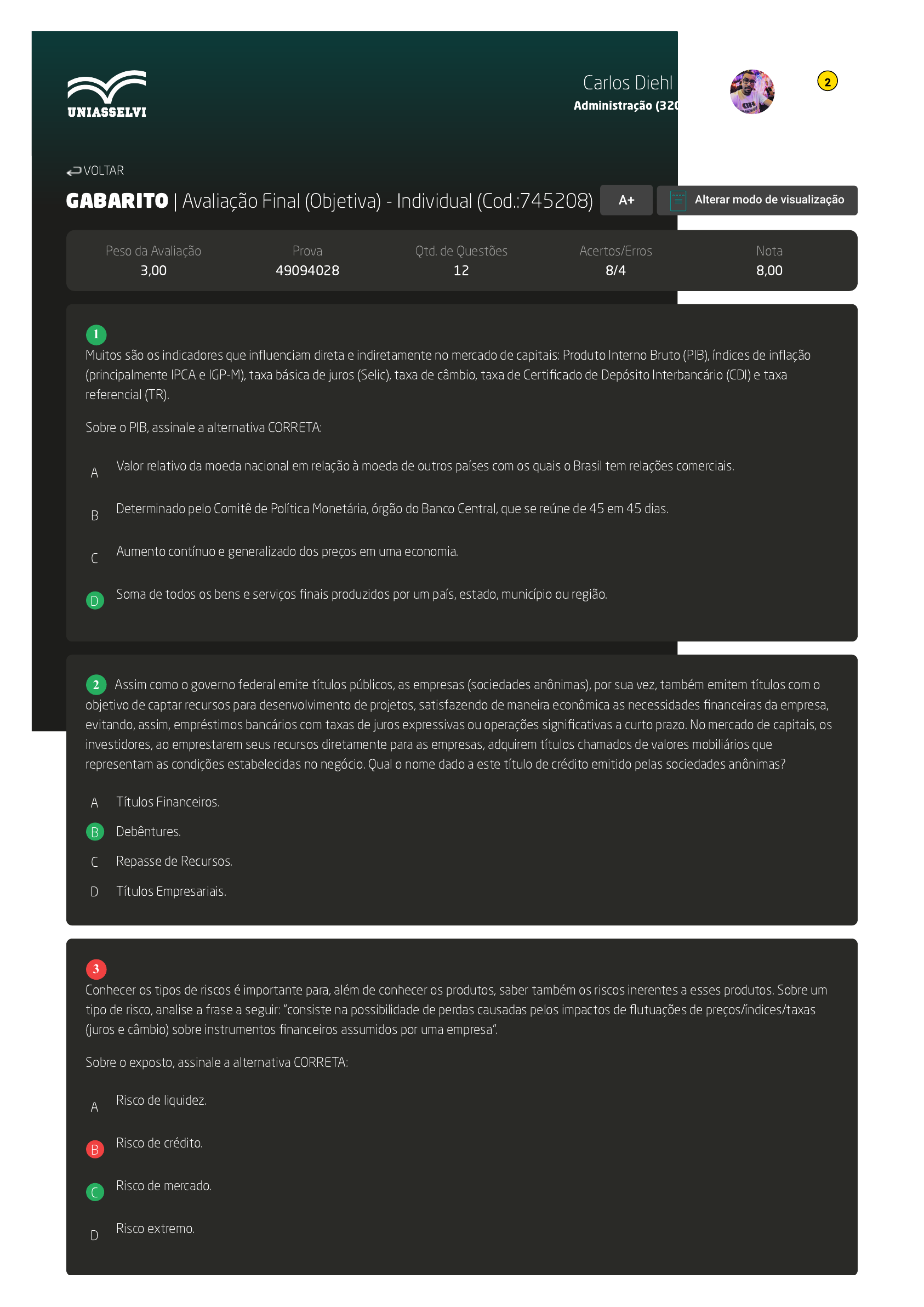 25/06/2022 20:16 AVA https://ava2.uniasselvi.com.br/subject/grades-and-tests/answer-book/eyJ0ZXN0Ijp7InRlc3RDb2RlIjoiNzQ1MjA4IiwiZGVzY3JpcHRpb24iOiJBdmFsaWHDp8OjbyBGaW5hbCAoT2JqZXRpdmEpIC0gSW5kaXZpZHVhb… 1/4 GABARITO | Avaliação Final (Objetiva) - Individual (Cod.:745208) Peso da Avaliação 3,00 Prova 49094028 Qtd. de Questões 12 Acertos/Erros 8/4 Nota 8,00 Muitos são os indicadores que influenciam direta e indiretamente no mercado de capitais: Produto Interno Bruto (PIB), índices de inflação (principalmente IPCA e IGP-M), taxa básica de juros (Selic), taxa de câmbio, taxa de Certificado de Depósito Interbancário (CDI) e taxa referencial (TR). Sobre o PIB, assinale a alternativa CORRETA: A Valor relativo da moeda nacional em relação à moeda de outros países com os quais o Brasil tem relações comerciais. B Determinado pelo Comitê de Política Monetária, órgão do Banco Central, que se reúne de 45 em 45 dias. C Aumento contínuo e generalizado dos preços em uma economia. D Soma de todos os bens e serviços finais produzidos por um país, estado, município ou região. Assim como o governo federal emite títulos públicos, as empresas (sociedades anônimas), por sua vez, também emitem títulos com o objetivo de captar recursos para desenvolvimento de projetos, satisfazendo de maneira econômica as necessidades financeiras da empresa, evitando, assim, empréstimos bancários com taxas de juros expressivas ou operações significativas a curto prazo. No mercado de capitais, os investidores, ao emprestarem seus recursos diretamente para as empresas, adquirem títulos chamados de valores mobiliários que representam as condições estabelecidas no negócio. Qual o nome dado a este título de crédito emitido pelas sociedades anônimas? A Títulos Financeiros. B Debêntures. C Repasse de Recursos. D Títulos Empresariais. Conhecer os tipos de riscos é importante para, além de conhecer os produtos, saber também os riscos inerentes a esses produtos. Sobre um tipo de risco, analise a frase a seguir: “consiste na possibilidade de perdas causadas pelos impactos de flutuações de preços/índices/taxas (juros e câmbio) sobre instrumentos financeiros assumidos por uma empresa”. Sobre o exposto, assinale a alternativa CORRETA: A Risco de liquidez. B Risco de crédito. C Risco de mercado. D Risco extremo. VOLTAR A+ Alterar modo de visualização 1 2 3 Carlos Diehl Neto Administração (3208779) 2 25/06/2022 20:16 AVA https://ava2.uniasselvi.com.br/subject/grades-and-tests/answer-book/eyJ0ZXN0Ijp7InRlc3RDb2RlIjoiNzQ1MjA4IiwiZGVzY3JpcHRpb24iOiJBdmFsaWHDp8OjbyBGaW5hbCAoT2JqZXRpdmEpIC0gSW5kaXZpZHVhb… 2/4 Os CDBs não têm alíquota zero para investidores pessoa física. Seu rendimento bruto é tributado de acordo com o tempo de aplicação, que pode ser diferente do vencimento contratado no título, pois o CDB pode ser resgatado antecipadamente ou então na sua data de vencimento. A responsabilidade do recolhimento também é do emissor do título. Sobre o exposto, assinale a alternativa CORRETA: A Prazo de aplicação entre 181 e 360 dias, alíquota de 20,5%. B Prazo de aplicação até 180 dias, alíquota de 22,5%. C Prazo de aplicação entre 361 e 720 dias, alíquota de 17,0%. D Prazo de aplicação acima de 720 dias, alíquota de 15,5%. É um tipo de risco que consiste na possibilidade de perdas ocasionadas pelos efeitos de flutuações de preços, índices e taxas sobre instrumentos financeiros adotados pela organização. Sobre o tipo de risco apresentado, assinale a alternativa CORRETA: A Risco de Operação. B Risco Flutuante. C Risco de Crédito. D Risco de Mercado. No cenário financeiro há uma série de fatores de risco, entre eles o que está atrelado ao comportamento do preço do ativo conforme as condições econômicas no mercado. Sobre esse fator de risco, assinale a alternativa CORRETA: A Risco de liquidez. B Risco de mercado. C Risco de pagamento - crédito. D Risco de pagamento - débito. São depósitos sob a forma de reservas bancárias que cada banco comercial é obrigado a manter junto ao Banco Central. Os depósitos provêm de um percentual calculado sobre os depósitos à vista e a prazo e são recolhidos ao BACEN. Este montante fica depositado junto ao BACEN, não sendo possível aos bancos utilizá-lo para novos empréstimos. Sobre o Banco Central e os instrumentos clássicos para atuar na política monetária, assinale a alternativa CORRETA: A Depósitos compulsórios. B Taxa de redesconto. 4 5 6 7 Carlos Diehl Neto Administração (3208779) 2 25/06/2022 20:16 AVA https://ava2.uniasselvi.com.br/subject/grades-and-tests/answer-book/eyJ0ZXN0Ijp7InRlc3RDb2RlIjoiNzQ1MjA4IiwiZGVzY3JpcHRpb24iOiJBdmFsaWHDp8OjbyBGaW5hbCAoT2JqZXRpdmEpIC0gSW5kaXZpZHVhb… 3/4 C Controle do crédito. D Open Market. A Constituição de 1988 adotou o princípio da livre-iniciativa como alicerce de sua ordem econômica. Sobre a livre-iniciativa, assinale a alternativa CORRETA: FONTE: BRASIL. [Constituição (1988)]. Constituição da República Federativa do Brasil de 1988. Brasília, DF: Senado Federal, 5 out. 1988. Disponível em: http://planalto.gov.br/ccivil_03/constituicao/constituicao.htm. Acesso em: 4 jul. 2021. A Pode ser interpretada em caráter absoluto, demandando ponderação e atenção estatal para que a liberdade econômica concedida pelo Estado a uns resulte em restrição de liberdade de outros. B Diz respeito ao valor mais indicado para representar predominantemente o espírito da ação do Estado com base na Lei Antitruste Brasileira, se consubstanciando em verdadeira vertente sobre a qual repousa a ordem econômica brasileira. C É sinônimo de livre concorrência para a ordem econômica brasileira. D Tem, assim como a livre concorrência, princípios que não visam o bem-estar do consumidor, mas os ganhos em eficiências do mercado. O órgão executor do sistema financeiro tem a responsabilidade de cumprir e fazer cumprir as disposições que regulamen