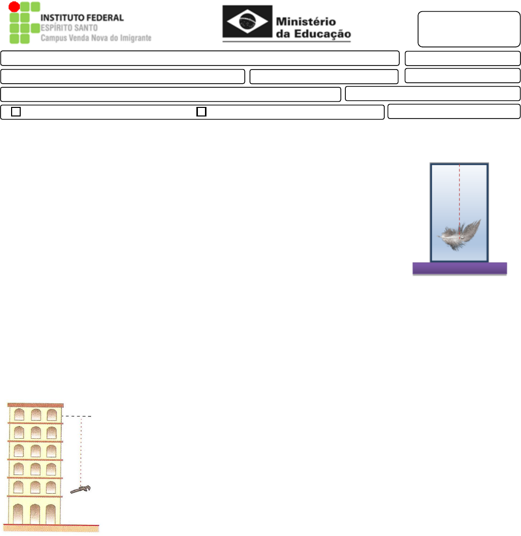Atenção: Em todas as questões numéricas, os cálculos devem ser apresentados com o raciocínio completo. 1) Fez-se vácuo no interior de um tubo cilíndrico de vidro, tampado nas duas bases. O tubo foi estacionado em sua posição vertical sobre uma mesa de laboratório e passou a seu utilizado para experimentos de queda livre. A fim de determinar a sua altura, um cientista abandonou em queda livre, em seu interior, uma pena de galinha. Ela demorou, desde a base superior até a inferior, 0,8 s. Adotando-se para módulo da gravidade 𝑔 = 10𝑚/𝑠2, determine a altura do tubo. 2) Uma chave inglesa cai em queda vertical livre do alto de um edifício. Em apenas 5s ela atinge o solo. Admitindo que ela tenha partido do repouso, adotando 𝑔 = 10𝑚/𝑠2 e desprezando os efeitos da resistência do ar no movimento, determine: a) a altura do edifício. b) os espaços nos instantes sucessivos do movimento até o 3º segundo. c) a velocidade com que ele atingiu o solo. d) a distância por ela percorrida durante o 5º segundo de movimento. 3) O movimento de um corpo em queda livre após ter sido abandonado de um determinada altura é: a) retilíneo uniforme. b) parabólico uniforme. c) circular uniforme. d) circular e uniformemente variado. e) retilíneo e uniformemente acelerado. 4) Galileu, na torre de Pisa, fez cair vários corpos pequenos, com o objetivo de estudar as leis do movimento dos corpos em queda. A respeito dessa experiência, julgue os itens, desprezando o efeito do ar. I. A aceleração do movimento era a mesma para todos os corpos. II. Se dois corpos eram soltos juntos, o mais pesado chegava ao solo horizontal no mesmo instante que o mais leve. PROFESSOR (A): Sidnei Giles de Andrade Nota: ALUNO (A): DISCIPLINA: Física MATRÍCULA: PROVA: TURMA: DATA: Prova Com Consulta Prova Sem Consulta Valor da Prova: 8 Pontos III. Se dois corpos eram soltos juntos, o mais pesado chegava ao solo horizontal com velocidade maior que o mais leve. São corretos: a) todos. b) apenas o I. c) apenas o II. d) apenas o I e o II. e) apenas o I e o III. 5) Se, em um certo planeta, uma esfera cai livremente, a partir do repouso, de uma altura de 128 𝑚 e leva 8,0 𝑠 para percorrer esta distância, quanto vale, nas circunstâncias consideradas, a aceleração da gravidade local? 6) Se uma esfera de aço cai, a partir do repouso, em queda livre de uma altura de 80 𝑚. Considerando 𝑔 = 10𝑚/𝑠2, o tempo de queda é: a) 8,0 s b) 6,0 s c) 4,0 s d) 2,0 s e) 1,0 s 7) Um gato cai acidentalmente da sacada de um apartamento do 7º andar de um edifício, com velocidade de 4,0 m/s. Calcule a velocidade do gato ao passar pela sacada do 3º andar desse edifício, sabendo que cada andar tem 3,0 m de altura. Adote 𝑔 = 10𝑚/𝑠2. 8) Na figura ao lado temos um desenho da torre de pisa. Um eixo vertical 𝑦 foi associado ao desenho, dando-nos, portanto, uma idéia da posição de seus anéis. Galileu subiu ao alto da penúltima sacada (7º anel) e de lá deixou cair uma bola de aço (bala de canhão). Despreze a resistência do ar e adote 𝑔 = 9,8𝑚/𝑠2. a) Com que velocidade ela chegou ao solo? Dê a resposta em 𝑘𝑚/ℎ. b) Quanto tempo ela gastou para chegar ao solo? 9) Uma pedra, partindo do repouso, cai de uma altura de 20 m. Despreza-se a resistência do ar e adota-se 𝑔 = 10 𝑚/𝑠2. A velocidade da pedra ao atingir o solo e o tempo gasto na queda, respectivamente, valem: a) 𝑣 = 20 𝑚/𝑠 e 𝑡 = 4 𝑠. b) 𝑣 = 20 𝑚/𝑠 e 𝑡 = 2 𝑠. c) 𝑣 = 10 𝑚/𝑠 e 𝑡 = 2 𝑠. d) 𝑣 = 10 𝑚/𝑠 e 𝑡 = 4 𝑠. e) 𝑣 = 10 𝑚/𝑠 e 𝑡 = 0,5 𝑠. 10) Uma partícula parte do repouso no instante 𝑡 = 0 e entra em queda livre. No instante 𝑡, ela tem velocidade 30𝑚/𝑠. No instante 2𝑡 ela atinge o solo. . Adote 𝑔 = 10 𝑚/𝑠2. A altura da qual a partícula foi abandonada com relação ao solo é: a) 300 𝑚 b) 180 𝑚 c) 30 𝑚 d) 10 𝑚 e) 3 𝑚 11) Um vaso de flores cai livremente do alto de um edifício. Após ter percorrido 320 𝑐𝑚, ele passa por um andar que mede 2,85 𝑚 de altura. Quanto tempo ele gasta para passar por esse andar? Desprezar a reação do ar e assumir 𝑔 = 10 𝑚/𝑠2. 12) Uma torneira mal fechada pinga a intervalos de tempo iguais. A figura mostra a situação no instante em que uma das gotas está se soltando. Supondo que cada pingo abandone a torneira com velocidade nula e desprezando a resistência do ar, pode-se afirmar que a razão A/B entre as distâncias A e B mostradas na figura (fora de escala) vale: (adote 𝑔 = 10 𝑚/𝑠2) a) 2 b) 3 c) 4 d) 5 e) 6 13) Um corpo em queda livre, a partir do repouso, gasta um certo tempo para percorrer uma distância ℎ. Se um outro corpo, nas mesmas condições, gastasse o triplo desse tempo, a distância percorrida seria: a) ℎ/9 b) ℎ/3 c) 3ℎ d) 9ℎ/2 e) 9ℎ 14) Um corpo inicialmente em repouso é largado de uma altura igual a 45 𝑚 e Cai livremente. Se a resistência do ar é desprezível, qual a distância, em metro. os, percorrida pelo corpo, decorridos um terço do tempo de queda. 15) Uma maçã foi atirada verticalmente para cima a partir do solo, com velocidade escalar inicial de 50 𝑚/𝑠. Despreze a resistência do ar e adote 𝑔 = 10𝑚/𝑠2. a) Escreva as equações horárias do movimento. Faça considerações iniciais ao escrevê-las. b) Determine o tempo de subida e o tempo total de vôo livre da maçã. 16) Da janela do 3º andar do prédio onde mora, Ricardo jogou, verticalmente para cima, uma bolinha. Decorridos 2 𝑠, ele viu a bolinha passar de volta pelo ponto de lançamento. Sabendo que o 3º andar está a 15 𝑚 de altura, que a resistência do ar é desprezível e que 𝑔 = 10𝑚/𝑠2, determine: a) o tempo de subida. b) a velocidade escalar inicial. c) a máxima altura atingida pela bolinha, contando a partir do solo. 17) A partir do solo, lança-se uma partícula verticalmente para cima que, num vôo livre, a