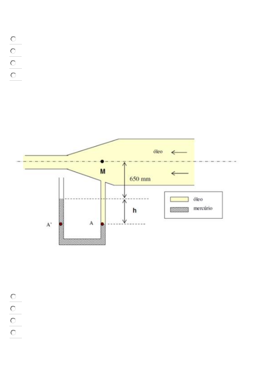 Questão 1) - 10,00 ponto(s) A massa específica da gasolina é de 0,66 g/cm³. Em um tanque com capacidade para 10.000 litros, qual a massa de gasolina correspondente? A) 660 kg B) 6,6 kg C) 6,6 N D) 6.600 kg Questão 2) - 10,00 ponto(s) Considerando a imagem abaixo: Um óleo com massa específica de 0,88 kg/dm³, passa pelo conduto da figura abaixo. Um manômetro de mercúrio, ligado ao conduto, apresenta a deflexão indicada. A pressão efetiva em M é de 91.196 N/m². Obter h, considerando o peso específico do mercúrio em 136.000 N/m³ e gravidade de 10 m/s². A) 0,7 mm B) 70,0 mm C) 7,0 m D) 700 mm Questão 3) - 10,00 ponto(s) Considerando a imagem abaixo: A tubulação da figura contém líquido incompressível que está retido pelo êmbolo 1 (de área igual a 10,0 cm²) e pelo êmbolo 2 (de área igual a 40,0 cm²). Se a força F1 tem módulo igual a 2 N, a força F2, que mantém o sistema em equilíbrio, tem módulo igual a: (g=9,81 m/s²). A) 0,815 kgf B) 8,0 kgf C) 0,8 N D) 1 N Questão 4) - 10,00 ponto(s) Se deseja construir um túnel que atravessa um grande lago. Considerando que o túnel esta a 3 metros de profundidade e que as suas dimensões são de 5 metros de largura e 20 metros de extensão. Determine o empuxo exercido pela água ( Desidade relativa = 1,0) sobre a parte superior do túnel. A) E= 3 MN B) E= 1500 MN C) E= 1,5 MN D) E= 3000 MN Questão 5) - 10,00 ponto(s) Um fluido compressível escoa em regime permanente a uma vazão de 5 kg/s pela seção A de um conduto retangular de seção constante de 0,5 m por 1 m. Em uma seção B, o peso específico deste fluido se altera para 10 N/m³. As velocidades médias de escoamento das seções A e B são respectivamente (g=10 m/s²): A) 15 m/s e 10 m/s B) 10 m/s e 15 m/s C) 10 m/s e 20 m/s D) 20 m/s e 10 m/s Questão 6) - 10,00 ponto(s) A chamada lei de Stevin diz que a pressão em um fluido que está em repouso aumenta de forma proporcional à profundidade. Com base nesta afirmação podemos concluir que o aumento de pressão, além de ser proporcional a profundidade, também dependerá de qual outra característica do fluido? A) Peso específico. B) Pressão relativa. C) Viscosidade cinemática. D) Viscosidade dinâmica. Questão 7) - 10,00 ponto(s) Com base na imagem abaixo, determine: Determine qual é o empuxo atuante (E) e qual a localização do centro de empuxo (hc) sobre a superfície retangular AB, com 1,8 m de altura e 3,0 m de base. Considere uma face sob óleo, conforme mostrado a seguir e pesos específico do óleo de 8.000 N/m³. (g=9,81 m/s²) A) E= 132142 N hc= 2,28 m B) E= 132142 N hc= 2,37 m C) E= 98471 N hc= 2,28 m D) E= 98471 N hc= 2,37 m Questão 8) - 10,00 ponto(s) Observe a figura abaixo e responda: Uma caixa d'água de 1,0 m de altura está apoiada sobre uma laje de 4 metros de altura e alimenta a tubulação de um chuveiro. Considerando que o diâmetro da tubulação próximo ao chuveiro (2) é de 0,5 polegadas e que esta seção está a 2,0 metros do solo. Determine para fluido ideal qual a vazão em volume: A) 0,97 L/s B) 0,97 m³/s C) 97 L/s D) 9,7 dm³/s Questão 9) - 10,00 ponto(s) Sabendo-se que 3200kg de uma determinada substância ocupa um volume de 4m³, determine a massa específica, dessa substância. (P água 1000kg/m³). A) 0,8 kg/m³ B) 3,2 kg/m³ C) 800 kg/m³ D) 4000 kg/m³ Questão 10) - 10,00 ponto(s) Um reservatório com capacidade máxima de 30 litros foi preenchido com um fluido de massa específica de 0,92 Kg/dm³. Determine qual o peso gerado por este fluido. A) 27,6 N B) 27600 N C) 32,6087 N D) 9,0252 N