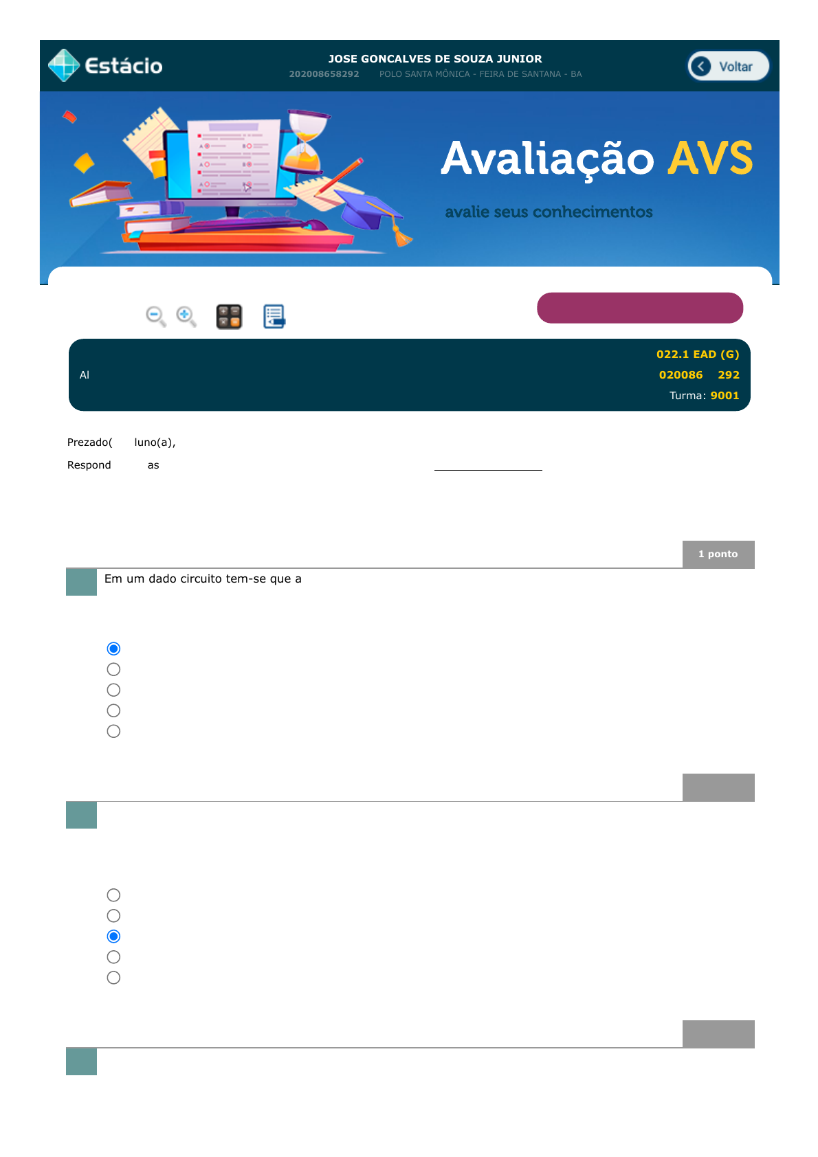 26/06/2022 15:52 EPS https://simulado.estacio.br/alunos/ 1/5 JOSE GONCALVES DE SOUZA JUNIOR Avaliação AVS 202008658292 POLO SANTA MÔNICA - FEIRA DE SANTANA - BA avalie seus conhecimentos 1 ponto Em um dado circuito tem-se que a corrente elétrica que alimenta um equipamento com a tensão de 220V e potência de 5000W é de: (Ref.: 202014781621) 1 ponto A energia gerada pela força dos ventos é conhecida por energia eólica. A construção dessas usinas ocorre comumente em áreas onde há uma elevada circulação atmosférica, que garante a continuidade dos ventos para a ativação das turbinas. Dentre as vantagens da energia eólica, pode-se citar: (Ref.: 202014781766) 1 ponto (Prefeitura de Poção - PE / 2019) Leia as afirmativas a seguir: I. As diferentes formas de se organizar as posições dos resistores em um circuito elétrico são chamadas de disjunções. Lupa Calc. Notas VERIFICAR E ENCAMINHAR Disciplina: EEX0044 - ELETRICIDADE APL Período: 2022.1 EAD (G) Aluno: JOSE GONCALVES DE SOUZA JUNIOR Matr.: 202008658292 Turma: 9001 Prezado(a) Aluno(a), Responda a todas as questões com atenção. Somente clique no botão FINALIZAR PROVA ao ter certeza de que respondeu a todas as questões e que não precisará mais alterá-las. Para questões de múltipla escolha, marque a única opção correta. Valor da prova: 10 pontos. 1. 22,7 A. 20,5 A. 23,8 A. 21,6 A. 24,9 A. 2. A dificuldade de instalação em áreas litorâneas. A não utilização de tecnologias modernas. O baixo impacto ambiental do seu funcionamento. A impossibilidade de emprego nas regiões brasileiras. A elevada emissão de poluentes na atmosfera. 3. javascript:voltar(); javascript:diminui(); javascript:aumenta(); javascript:calculadora_on(); javascript:anotar_on(); 26/06/2022 15:52 EPS https://simulado.estacio.br/alunos/ 2/5 II. O circuito elétrico em série é aquele em que existe uma associação. A partir dessa associação, os componentes ligam-se entre si na mesma sequência e na mesma direção. III. Não há associação no circuito em paralelo. Marque a alternativa correta: (Ref.: 202014780755) 1 ponto Aplicando o Método das Malhas para análise de circuitos, a corrente ilustrada no circuito da figura é Fonte: Alexander; Sadiku (2013, p. 105) (Ref.: 202014777266) 1 ponto O valor do resistor na figura é de Fonte: Autora (Ref.: 202014777070) A afirmativa II é verdadeira, e a I e III são falsas. As três afirmativas são falsas. A afirmativa I é verdadeira, e a II e III são falsas. A afirmativa III é verdadeira, e a I e II são falsas. As três afirmativas são verdadeiras. 4. 1,85A. 3,20A. 2,68A. 2,35A. 1,18A. 5. 3,5Ω. 3Ω. 2Ω. i R2 26/06/2022 15:52 EPS https://simulado.estacio.br/alunos/ 3/5 1 ponto A primeira Lei de Kirchhoff dispõe que o somatório das correntes elétricas em um nó de circuito deve ser nulo. Dessa forma, o valor das correntes , e na figura são, em ampères, respectivamente Fonte: Autora (Ref.: 202014777062) 1 ponto (MPE - MS / 2013) A figura a seguir apresenta um circuito de corrente contínua, composto de uma fonte e três resistores. O circuito equivalente de Thévenin, visto pelo resistor R, entre os pontos A e B, é composto por: (Ref.: 202014795285) 1 ponto (Fundação Mariana Resende Costa / 2003) O circuito equivalente de Norton à esquerda dos terminais (a-b) 2,5Ω. 1Ω. 6. 14, -12 e 10. 10, -15 e 4. 12, -14 e 2. 12, 10 e -2. 10, -14 e 5. 7. uma fonte de 36V e um resistor de 50Ω. uma fonte de 60V e um resistor de 40Ω. uma fonte de 60V e um resistor de 12Ω. uma fonte de 36V e um resistor de 12Ω. uma fonte de 60V e um resistor de 30Ω. 8. I1 I2 I3 26/06/2022 15:52 EPS https://simulado.estacio.br/alunos/ 4/5 indicados é representado, respectivamente, por uma fonte de corrente e resistência equivalente cujos valores são: (Ref.: 202014795319) 1 ponto A partir das equações de transformação entre circuitos equivalentes em estrela e triângulo, a resistência entre os terminais e do circuito ilustrado na Figura 46 é de: Figura 46: Simulado - Exercício 9 - Fonte: Fundamentos de Circuitos Elétricos, Sadiku, 5ª Ed. (Ref.: 202014768143) 1 ponto Com base no Teorema da Superposição, o valor da tensão no circuito ilustrado na Figura 47 é de: 3A e 1,2Ω 2A e 5Ω 2A e 1,2Ω 5A e 5Ω 5A e 1,2Ω 9. 10. a b 35, 5Ω 85, 63Ω 142, 3Ω 125, 32Ω 110, 85Ω vo 26/06/2022 15:52 EPS https://simulado.estacio.br/alunos/ 5/5 Figura 47: Simulado - Exercício 10 - Fonte: Isabela Oliveira Guimarães (Ref.: 202014767321) 3,5 V 5,6 V 4,2 V 6,8 V 8,0 V VERIFICAR E ENCAMINHAR Legenda: Questão não respondida Questão não gravada Questão gravada javascript:abre_colabore();