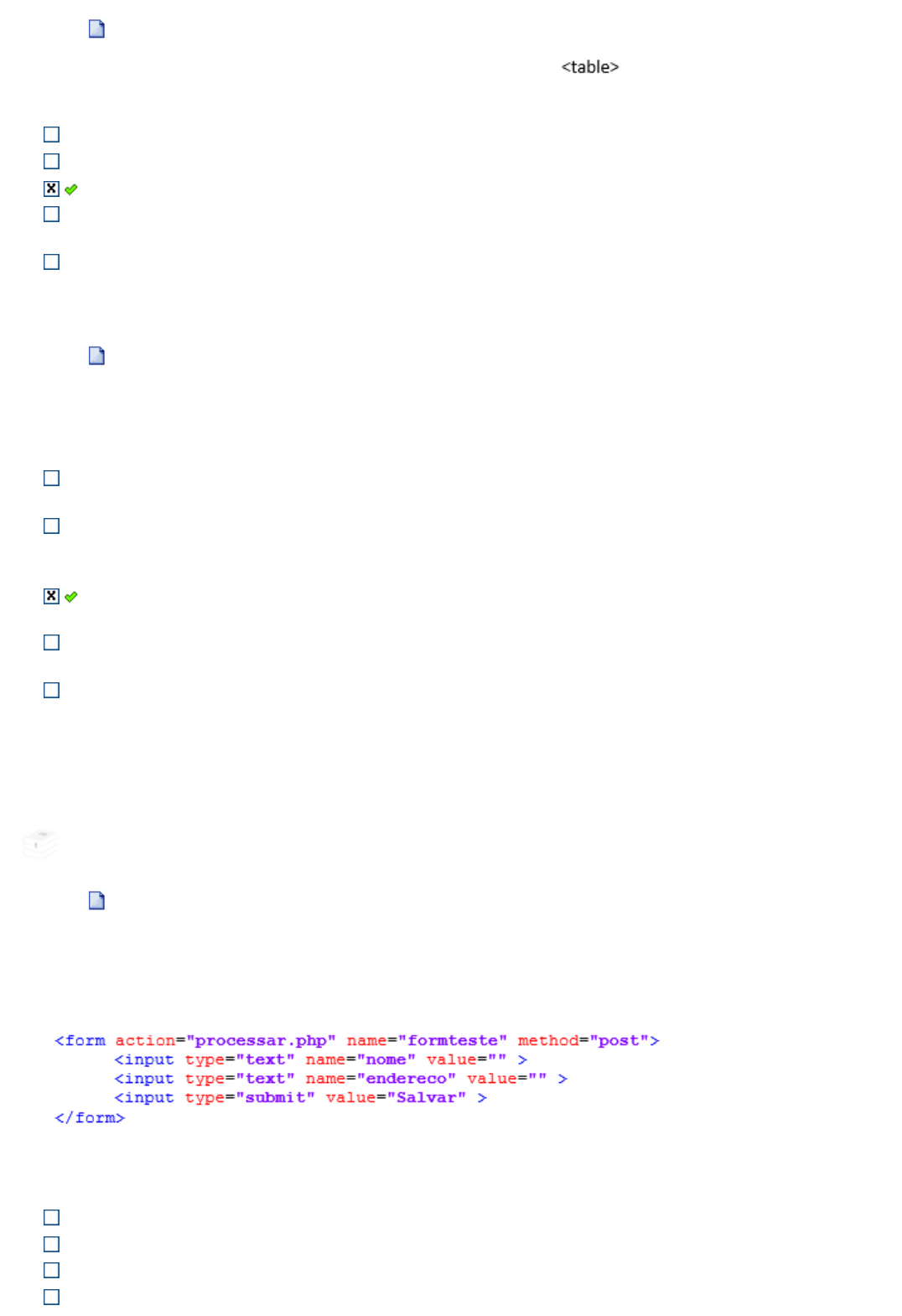 1. Ref.: 5236780 Pontos: 1,00 / 1,00 Assinale a opção abaixo que corresponde à função da tag em um documento HTML: Agrupar textos de parágrafos alinhados à direita, um após o outro. Apresentar dados organizados no formato de listas. Apresentar dados tabulares, organizados e agrupados, horizontal e verticalmente. Montar o layout da página, uma vez que toda página contém cabeçalho, linhas, colunas e rodapé. Armazenar os links de navegação da página. 2. Ref.: 5236786 Pontos: 1,00 / 1,00 A estrutura de um arquivo HTML contém elementos que são importantes tanto para quem visualiza a página quanto para o navegador onde ela é carregada. Assinale a alternativa incorreta: A combinação do conteúdo e a forma como ele é estruturado, com a utilização de tags, permite ao navegador exibir corretamente o documento. Os navegadores Web são desenvolvidos levando em consideração as especificações e padrões da HTML. Logo, uma página criada levando em conta estes dois fatores a torna compatível com a maioria dos navegadores. O conteúdo que inserimos no HTML, independente da tag onde foi inserido, determina como ele será exibido pelo navegador. As tags possuem funções específicas. Logo, uma tag utilizada para estruturar conteúdo não pode ser usada para passar informações para o navegador. Existe um conjunto de tags para cada uma das funções acima: Tags que informam sobre o documento e seu conteúdo ao navegador e tags que apresentam o conteúdo adequadamente aos visitantes de uma página. 00120-TETI-2008: INTEGRAÇÃO DO PHP COM BANCO DE DADOS 3. Ref.: 5250629 Pontos: 1,00 / 1,00 (NC-UFPR - 2017 - ITAIPU BINACIONAL - Profissional de Nível Superior Jr - Computação ou Informática - Sistemas) Considere o seguinte formulário em HTML, que é submetido para "processar.php": O arquivo "processar.php", escrito em PHP 5, deve obter o dado "nome" submetido. Qual é o comando correto para efetuar essa tarefa? $nome = $_FORM["nome"]; $nome = $_GET["nome"]; $nome = $_GET("nome"); $nome = $_POST("nome"); javascript:alert('C%C3%B3digo da quest%C3%A3o: 5236780.'); javascript:alert('C%C3%B3digo da quest%C3%A3o: 5236786.'); javascript:alert('C%C3%B3digo da quest%C3%A3o: 5250629.'); $nome = $_POST["nome"]; 00172-TETI-2008: O AMBIENTE WEB CLIENTE X SERVIDOR E AS TECNOLOGIAS 4. Ref.: 5258421 Pontos: 1,00 / 1,00 A linguagem PHP foi criada para possibilitar o desenvolvimento de páginas dinâmicas. Sobre essa linguagem é correto afirmar: As páginas PHP não permitem que seja incluído código HTML em seu código. As páginas PHP são processadas do lado servidor, resultando em páginas HTML que são renderizadas pelo lado Cliente. As páginas PHP precisam ser processadas tanto no lado Servidor quanto no lado Cliente para garantir o seu correto funcionamento. As páginas PHP, por gerarem código HTML, podem ser executadas e processadas apenas no lado Cliente. As páginas PHP devem ser compiladas no Servidor para poderem funcionar. 5. Ref.: 5266842 Pontos: 1,00 / 1,00 Sobre as tecnologias do lado Cliente, assinale a alternativa correta: HTML e CSS são tecnologias utilizadas na construção de sites: HTML cuida da estrutura e CSS, da apresentação. HTML é um programa que permite o desenvolvimento de arquivos CSS. CSS é uma linguagem de programação, feita para rodar sobre a HTML. Javascript é a camada do lado Cliente responsável pelo layout das páginas. Entre as tecnologias disponíveis no lado Cliente, Javascript é a única que pode ser utilizada sozinha para a criação de páginas Web simples. 00297-TETI-2008: PROGRAMAÇÃO DE PÁGINAS DINÂMICAS COM PHP 6. Ref.: 5284832 Pontos: 1,00 / 1,00 Conhecer o uso de operadores em PHP pode significar a diferença entre programas que funcionam corretamente ou não. Considere o seguinte trecho de código em PHP: $A = 3; $B = "2"; echo $A+$B; echo $B.$A; echo $A|$B; echo $A&$B; echo "\n"; Qual será a saída desse trecho de código? 5623 5632 52323 332323 52332 javascript:alert('C%C3%B3digo da quest%C3%A3o: 5258421.'); javascript:alert('C%C3%B3digo da quest%C3%A3o: 5266842.'); javascript:alert('C%C3%B3digo da quest%C3%A3o: 5284832.'); 00385-TETI-2008: LINGUAGEM JAVASCRIPT 7. Ref.: 5286308 Pontos: 1,00 / 1,00 Assinale a forma correta para inserir JavaScript em uma página, por meio de arquivos externos: < script src="xxx.js"> < /script> < src file="xxx.js"> < /src> < script load("xxx.js")> < /script> < inputJava> xxx.js < /inputJava> < script onload="xxx.js"> < /script> 8. Ref.: 5284286 Pontos: 1,00 / 1,00 Utilizado com o JavaScript, o AJAX proporciona novos usos a padrões já existentes e tem a capacidade de: Instalar uma extensão no navegador Web. Empregar aplicativos síncronos para fazer solicitações usando um objeto JavaScript. Liberar o navegador Web para outras operações enquanto atende outras requisições. Usar processamento do lado servidor. Manipular as solicitações e as respostas com o código JavaScript, sem processar dados no navegador Web. 00468-TETI-2008: LINGUAGEM DE MARCAÇÃO E ESTILOS - CSS 9. Ref.: 5286296 Pontos: 1,00 / 1,00 Observe o emprego de seletores do CSS3 nos trechos a seguir. p.exemplo.didatico { color: red; } .quadro { color: red; } #abc { color: red; } Essa sintaxe significa que serão coloridos com vermelho: Todos os parágrafos que têm "exemplo" ou "didatico" como atributo name, todos os elementos que têm "quadro" como atributo name e todos os elementos que têm "abc" como atributo id. Todos os elementos que têm "p.exemplo.didatico" como atributo class, todos os elementos que têm "quadro" como atributo id e todos os elementos que têm "abc" como atributo name. Todos os elementos que têm "p", "exemplo" e "didatico" como atributos class, todos os elementos que têm "quadro" como atributo id e todos os elementos que têm "abc" como atributo name. Todos os parágrafos que têm "exemplo" e "didatico" como atributos class, todos os elementos que têm "quadro" como atributo class e todos os elem
