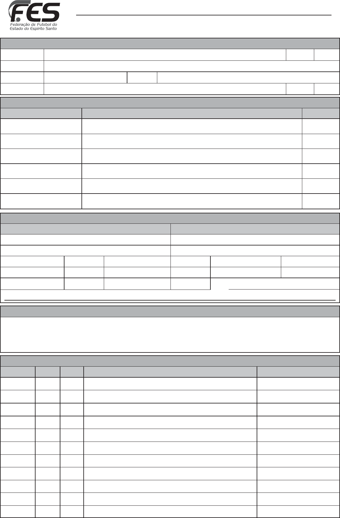 Campeonato: Jogo: Horário: UF: FICHA TÉCNICA Rodada: Data: Estádio: CRONOLOGIA Função Árbitro: Árbitro Assistente 1: Árbitro Assistente 2: Quarto Árbitro: Nomes Completos Quinto Árbitro: Delegado: EQUIPE A Entrada no 1º tempo: Entrada no 2º tempo: Início do 2º tempo: TEMPO Início do 1º tempo: Término do 1º tempo: Término do 2º tempo: Acréscimo 2º tempo:Acréscimo 1º tempo: EQUIPE B Entrada no 1º tempo: Entrada no 2º tempo: Resultado do 1º tempo: Resultado final: Obs.: X X RELAÇÃO DOS JOGADORES As equipes deverão apresentar ao quarto árbitro e afixar na parte externa do ves�ário, até 45 minutos antes da hora marcada para o inicio da par�da, a relação dos respec�vos jogadores �tulares e suplentes, necessariamente na forma digitalizada, ou em letra de forma ou imprensa, assinada pelo ‘‘capitão’’. Nessa relação deverão constar os números dos documentos de iden�ficação dos jogadores e de inscrição na FES. A iden�ficação dos atletas será feita primeiramente pela equipe mandante, mediante exibição da carteira de jogador expedida pela federação ou por documento de iden�dade expedido por órgão público oficial. As relações devem ser anexadas a este documento. EQUIPE DE ARBITRAGEM GOLS 1T/2T Nº NOME DO JOGADOR EQUIPE Cat. FEDERAÇÃO DE FUTEBOL DO ESTADO DO ESPÍRITO SANTO SÚMULA E RELATÓRIO DA PARTIDA TEMPO 1T/2T Nº CARTÕES AMARELOS NOME DO JOGADOR EQUIPE mo�vo: mo�vo: mo�vo: mo�vo: mo�vo: mo�vo: mo�vo: mo�vo: EXPULSÕES E/OU INCIDENTES Ocorrendo expulsões de jogadores relatar ma mesma ordem u�lizada para as advertências, ou seja, Tempo, 1T/2T, nº do jogador e equipe. A descrição deve ser obje�va e os mo�vos expostos de forma clara. Outros fatos dignos de registro, se houver necessidade de complementar este relatório elaborar documento adicional e enviar como anexo. ASSINATURAS Cidade: AA1: 5º Ar: Data: AA2: Del. Local: Árbitro: 4º Ar.: mo�vo: mo�vo: FEDERAÇÃO DE FUTEBOL DO ESTADO DO ESPÍRITO SANTO COMUNICAÇÕES GERAIS Capitão da Equipe A Jogo: Horário: UF: FICHA TÉCNICA Rodada: Data: Estádio: SUBSTITUIÇÕES TEMPO 1T/2T EQUIPE Nº ENTROU Nº SAIU JOGADORES ADVERTIDOS COM CARTÃO AMARELO E/OU EXPULSOS (ORDEM CRONOLÓGICA) Nº NOME DOS JOGADORES CA CV Nº 2ºCA CVD NOME DOS JOGADORES CA CV 2ºCA CVD ASSINATURAS CA (cartão amarelo); CV (cartão vermelho); 2º CA (segundo cartão amarelo); CVD (cartão vermelho direto). Situações possíveis (colocar ‘‘x’’ nos espaços correspondentes): a) somente cartão amarelo = ‘‘x’’ em CA; b) expulsão por 2º CA = ‘’x’’ em CA e ‘‘x’’ em 2º CA; C) expulsão direta = ‘‘x’’ em CVD; e d) cartão amarelo seguido de expulsão direta = ‘‘x’’ em CA e ‘‘x’’ em CVD. 1ª Via FES 2ª Via Federação Local Árbitro 3ª Via Equipe A Capitão da Equipe B 4ª Via Equipe B 5ª Via Árbitro Campeonato: FEDERAÇÃO DE FUTEBOL DO ESTADO DO ESPÍRITO SANTO RELATÓRIO DA PARTIDA ÁRBITRO RESERVA JOGO: x DATA / / POLICIAMENTO: SIM PRESSÃO DA BOLA: QUANTOS POLICIAIS ? NÃO 01 - HORÁRIOS DETALHADOS DA PARTIDA INÍCIO DA PARTIDA: ENTRADA EQUIPE 1: ENTRADA EQUIPE 2: 1º TEMPO h h h h h h REINÍCIO DA PARTIDA: ENTRADA EQUIPE 1: ENTRADA EQUIPE 2: 2º TEMPO 1º TEMPO 2º TEMPO 02 - GOLS (em ordem cronológica) EQUIPE Nº ATLETA H EQUIPE Nº ATLETA H ESCORE: x RESULTADO FINAL FAVORÁVEL: 03 - ADVERTÊNCIAS EQUIPE Nº MOTIVO HT 04 - EXPULSÕES EQUIPE Nº MOTIVO HT 05 - SUBSTITUIÇÕES - ORDEM CRONOLÓGICA ENTRA SAI Nº ATLETAS T ATLETASH Nº T HE E E - EQUIPE 1 OU 2 UNIFORMES: EQUIPE A: GOLEIRO EQUIPE B: GOLEIRO JOGADORES JOGADORES FEDERAÇÃO DE FUTEBOL DO ESTADO DO ESPÍRITO SANTO SUBSTITUIÇÕES CARTÃO DE SUBSTITUIÇÃO (Entregar ao 4º arbitro) Equipe 1 Assinatura do Responsável Entra: Nº Sai: Nº T: CARTÃO DE SUBSTITUIÇÃO (Entregar ao 4º arbitro) Equipe 2 Assinatura do Responsável Entra: Nº Sai: Nº T: CARTÃO DE SUBSTITUIÇÃO (Entregar ao 4º arbitro) Equipe 1 Assinatura do Responsável Entra: Nº Sai: Nº T: CARTÃO DE SUBSTITUIÇÃO (Entregar ao 4º arbitro) Equipe 2 Assinatura do Responsável Entra: Nº Sai: Nº T: CARTÃO DE SUBSTITUIÇÃO (Entregar ao 4º arbitro) Equipe 1 Assinatura do Responsável Entra: Nº Sai: Nº T: CARTÃO DE SUBSTITUIÇÃO (Entregar ao 4º arbitro) Equipe 2 Assinatura do Responsável Entra: Nº Sai: Nº T: Página 1 Página 2 Página 3 Página 4 Página 5 Página 6
