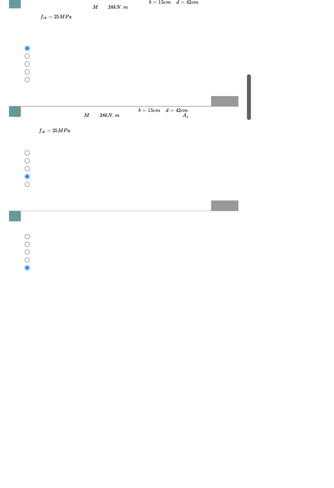Uma viga com seção retangular de concreto armado com e , sob a ação de um momento fletor solicitante ( ) de . Dados: ; Aço CA 50. A viga está trabalhando em qual domínio de deformação? (Ref.: 201913252583) 1 ponto Para uma seção retangular de concreto armado com e , sob a ação de um momento fletor solicitante ( ) de . A área de aço longitudinal ( ) necessária para suportar o momento solicitante é: Dados: ; Aço CA 50. (Ref.: 201913252584) 1 ponto As bielas de concreto são responsáveis por resistir: (Ref.: 201913271824) 3. 2 3 1 4 4a 4. 2,86 cm2 1,98 cm2 4,21 cm2 3,14 cm2 3,78 cm2 5. a tensão de tração na seção. a tensão principal de tração. a tensão de compressão na seção. a tensão de flexão máxima. a tensão principal de compressão. b = 15cm d = 42cm M 38kN .m fck = 25MPa b = 15cm d = 42cm M 38kN .m As fck = 25MPa