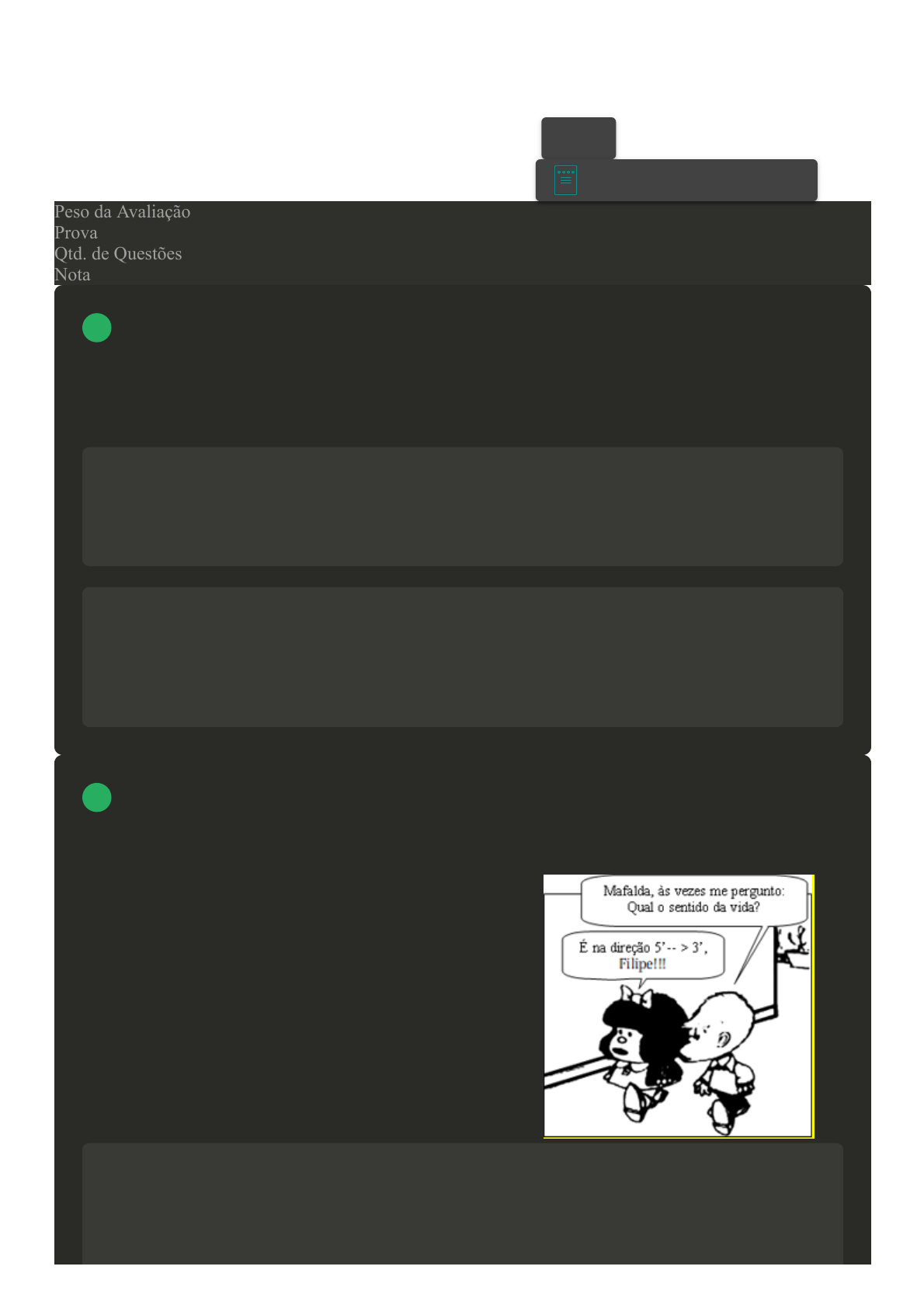 28/06/2022 08:39 Avaliação Final (Discursiva) - Individual 1/2 Prova Impressa GABARITO | Avaliação Final (Discursiva) - Individual (Cod.:745147) Peso da Avaliação 4,00 Prova 50009319 Qtd. de Questões 2 Nota 8,25 O aconselhamento genético é uma prática que surgiu nos Estados Unidos na década de 1940 e tem se difundido ao redor do mundo com a crescente popularização da informação genética e a profissionalização da genética na saúde pública. Disserte sobre o aconselhamento genético. FONTE: GUEDES, C.; DINIZ, D. A ética na história do aconselhamento genético: um desafio à educação médica. Rev. bras. educ. med. vol.33 no.2. Rio de Janeiro Apr./June 2009 Resposta esperada O aconselhamento genético é um conjunto de procedimentos realizados por profissionais (médicos, geneticistas, biomédicos, bioquímicos, psicólogos etc.) que tem como objetivo informar e orientar indivíduos sobre o risco de ocorrência de doença genética em sua família. Minha resposta O ACONSELHAMENTO GENÉTICO É UMA IMPORTANTE FERRAMENTA NO CAMPO DAS DOENÇAS HEREDITÁRIAS, POIS ABORDA ASPECTOS EDUCACIONAIS E REPRODUTIVOS QUE SÃO NECESSÁRIOS PARA A MELHORIA DA QUALIDADE DE VIDA DE PACIENTES PORTADORES DE ALGUM TIPO DE PATOLOGIA. O DNA faz cópias de si pelo processo de replicação, sendo uma etapa de suma importância para manutenção do genoma humano. Este processo possui algumas características, dentre elas destaca-se o fato de o novo DNA ser produzido por enzimas denominadas DNA polimerases, que atuam sempre no mesmo sentido. Neste contexto, observe a figura a seguir. Disserte sobre este "sentido da vida" no processo de replicação do DNA e importância deste processo. Resposta esperada A replicação é um processo de suma importância, pois por ele o DNA é copiado produzindo outras moléculas de DNA, sendo fundamental para manter o genoma humano. O sentido 5'-3' ser conhecido como o "sentido da vida", dá-se pelo fato deste ser o sentido em que o DNA VOLTAR A+ Alterar modo de visualização 1 2 28/06/2022 08:39 Avaliação Final (Discursiva) - Individual 2/2 polimerase atua na fita líder no processo de replicação do DNA, sendo este processo fundamental para que haja vida. Minha resposta O SENTIDO DA VIDA - EM UMA EXTREMIDADE DA FITA DO DNA ESTÁ LIVRE A HIDROXILA DO CARBONO-5 DA PRIMEIRA PANTOSE E NA OUTRA ESTA LIVRE A HIDROXILA DO CARBONO-3 DA ULTIMA PANTOSE. NA FITA COMPLEMENTAR ESTE SENTIDO É INVERTIDO. Imprimir