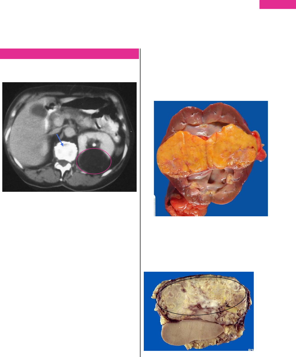 1 BBPM V - PATOLOGIA Neoplasias genitourinárias CASO CLINICO o Mulher de 26 anos apresentando massa renal de 4,0 cm. Observe as imagens e diga o diagnostico Em rosa vemos uma lesão de baixa densidade, bem delimitada no rim Esquerdo, não sendo tão radiopaca e com consistência de tecido entre a pele e o tecido muscular (não em consistência ou aspecto de gas porque é hipodenso). Seta azul – estrutura radiodensa com aspecto ósseo calcificado (provavelmente um calculo fora da lesão). Com a retirada do rim temos esse tumor bem delimitado (limites nítidos entre tumor e o parênquima) com superfície regular, homogênea (amarelada) e com algumas áreas esbranquiçadas (pode ser uma estrutura vascular) e o rim está preservado (região medular mais branca, cálices e córtex). Tumor com efeito de massa, amarelado. Abaixo vemos tumor (circulado) com aspecto diferente após a fixação, com coloração esbranquiçada/acastanhada, heterogêneo porem não perde a nitidez e a delimitação entre parênquima e tumor. 2 BBPM V - PATOLOGIA Na microscopia: Nota-se no menor aumento ausência de glomérulo, túbulo, interstício diferenciado. Observo apenas feixes de tecido muscular (seta preta) envolto por estruturas vasculares com parede espessada (círculo amarelo) e lumen fechado. Intersticio com fibrose e infiltrado inflamatório com linfócitos. Tecido composto por adipócitos (células vacuolizadas e com núcleo lateralizado na periferia da célula- seta vermelha). Trata-se de um tumor heterogêneo. Abaixo vemos: Estruturas vasculares rígidas e espessadas (círculos). Tecido adiposo maduro de permeio (seta vermelha), típicos do adulto. Infiltrado inflamatório ao redor dos vasos (azul) Em maior aumento temos: Estruturas musculares lisas. Estruturas vasculares espessadas, tecido adiposo (seta vermelha) e infiltrado leucocitário linfomononuclear. ANGIOMIOLIPOMA Angio = vasos, mio = músculos; lipo = adiposo; oma = benigno • Tumor chamado de Hamartoma (PEComas) composto por vasos sanguíneos, músculo liso e células adiposas • Associado à esclerose tuberosa. ▪ Retardo mental. ▪ Tumores subependimários. ▪ Hamartomas. ▪ Lesões cutâneas (Angiofibroma, Hipopigmentação). • Aparência radiológica característica, comportamento benigno (quase sempre) – semelhança com tecido adiposo subcutâneo onde encontra-se vasos, tecido muscular e adiposo • Também ocorre no fígado, pulmões, gânglios linfáticos e tecido mole retroperitoneal =não é exclusivo de rim • Hepático pode ganhar aparência epitelioide, mas possui marcações especificas imunohistoquimicas para vaso, músculos e tecido adiposo sendo possível diferenciar • Geralmente tem comportamento benigno, mas pode ser complicado por hemorragia (muito vascularizado), 3 BBPM V - PATOLOGIA invasão de órgãos adjacentes ou envolvimento não contíguo de outros órgãos. Mesmo sendo benigno pode aderir a outros órgãos, gerar efeito de massa e hemorragia. CASO 2 Homem de 54 anos com tumoração em polo superior do rim direito. Na imagem abaixo observamos a lesão (vermelho) – ela possui um contato próximo com estruturas vasculares e não realiza dilatação do sistema pielocalicial e nem do ureter, sendo provavelmente um tumor renal ou de adrenal (localizada no polo superior do rim – e pode simular lesão renal) Na macroscopia: lesão bem delimitada (amarelo), e o tecido adiposo da fascia acaba abruptadamente e começa o tecido acastanhado (azul) então trata-se de invasão de tecido adiposo = invasão de gordura perirrenal. Em decorrência disso, aumenta a suspeita de tumor maligno devido a invasão (rompeu a capsula renal), apesar da lesão ser bem delimitada (redondinha). Lesão heterogênea (amarelo granulado x liso e brilhante) com áreas hemorrágicas (verde). Na microscopia: Aspecto característico com células claras, citoplasma amplo, ricas em glicogênio. Rede vascular bem característica, se ligando uns aos outros (como se fosse tela de galinheiro). Há estruturas glandulares, acinares, cordonais (vários subtipos de apresentação 4 BBPM V - PATOLOGIA Em maior aumento: Notamos a microvasculatura separando as células tumorais (riscos em vermelho). As células são bem delimitadas e com núcleos lateralizados (não são adipócitos porque o núcleo não é comprimido pela vesícula de gordura e sim é arredondado com citoplasma rico em glicogênio – por isso fica branco – em coloração especifica para glicogênio ele seria visto). Bem característico o aspecto em CELULAS CLARAS (glicogênio). Abaixo vemos: Estruturas vasculares e secreção eosinofilica no meio do tumor e células claras ao redor. CARCINOMA DE CÉLULAS RENAIS DE CÉLULAS CLARAS • Grupo morfologicamente heterogêneo de carcinomas renais (categoria geral – sendo que dentro deste há outros subtipos) com citoplasma claro ou eosinofílico, vasculatura característica e assinatura molecular comum da inativação do VHL (gene associado ao von Hippel-Lindau). • Arquitetonicamente e citologicamente diversificados: padrões de crescimento sólido, alveolar, acinar e cístico de células com citoplasma claro ou eosinofílico. Subtipos podem aparecer misturados • Rede característica de vasculatura pequena, de paredes finas e “chicken wire" (tela de galinheiro) • Inativação da VHL e aumento da transcrição de fatores relacionados à hipóxia (VEGF, PDGF) – por ser um tumor muito vascularizado produz esses fatores angiogenicos. 60% a 80% são encontrados incidentalmente em imagens – para ter sintomatologia ele já tem que ter um tamanho considerável. Pode cursar com hematúria sem dimorfismo (com dimorfismo apenas em lesões glomerulares) e dor em flanco. • Metástases frequentemente hematogênicas por veias renais: pulmão, fígado, osso, tecido mole, adrenal. Alto risco de metástase por ser muito vascularizado – alcança a veia renal com facilitada lançando embolos na corrente sanguínea. • Fatores de ris