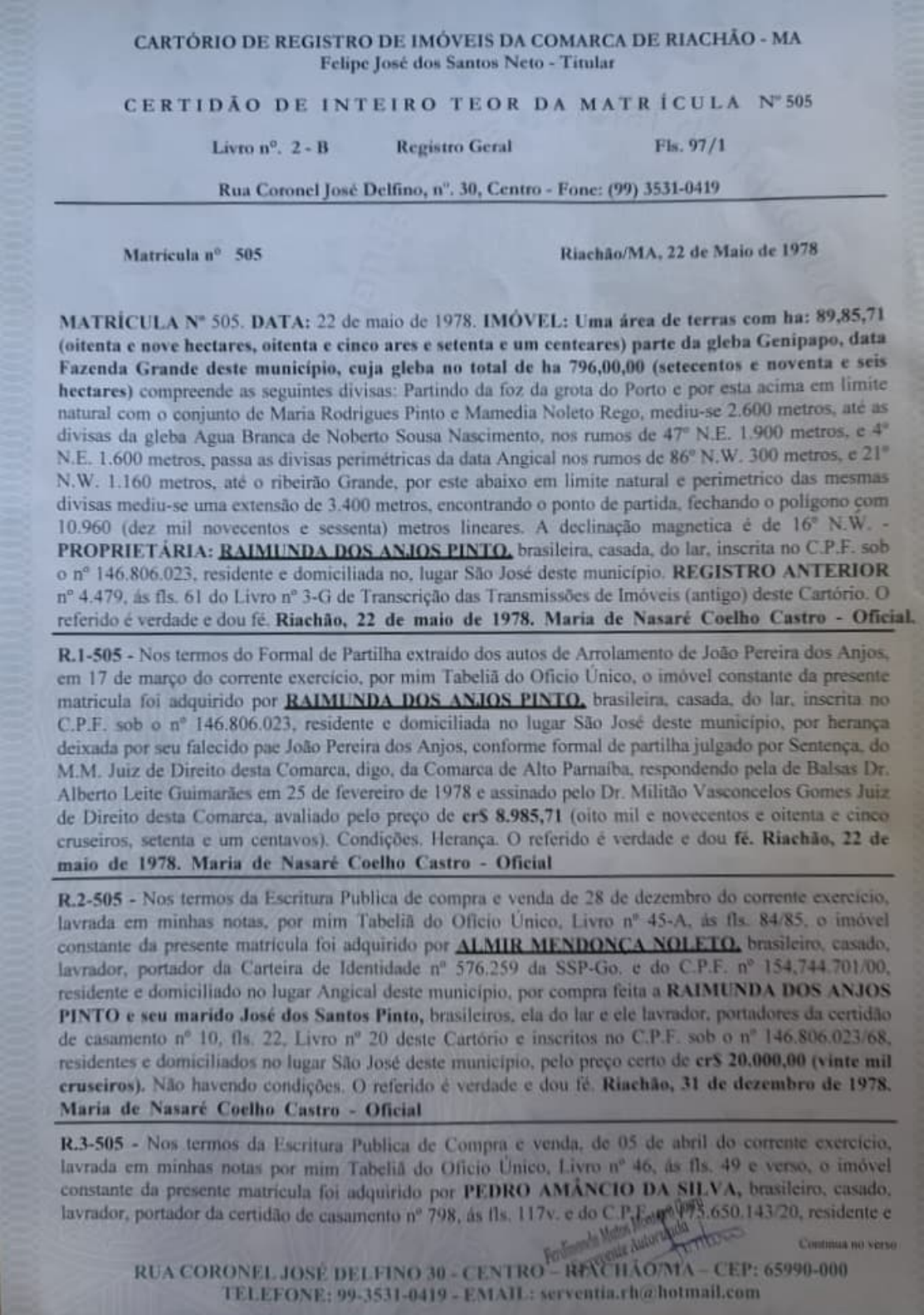 CARTÓRIO DE REGISTRO DE IMÓVEIS DA COMARCA DE RIACHA0- MA Felipe Jose dos Santos Neto-Tiular CERTIDÃO DE 1NTEIRO TEOR DA MATR ICULA N' 505 Livro n. 2-5 Registro Geral Fis. 97/1 Rua Coronel José Delfino, n". 30, Centro- Fone: (99) 3531-0419 Matriculan" S05 Kiachão/MA, 22 de Maio de 1978 MATRÍCULA N 505. DATA: 22 de maio de 1978. IMOVEL: Uma área de terras com ha: 898 (oitenta e nove hectares, oitenta e cinco ares e setenta e um centeares) parte da gleba (Genipapo, 0t Fazenda Grande deste municipio, cuja gleba no total de ha 796,00,00 (setecentos e noventa tse hectares) compreende as seguintes divisas: Partindo da foz da grota do Porto e por esta acima em fimite conunto aie ana Kodrigues P'intoc Mameda Noleto Rego, mediu-se 2.600 metros, ale as gu Drlca de NoDeto Sousa Nscimento, nos rumos de 47 N.E. 1.900 metros, e hetros. plssa as divisas perimetricas da data Angical nos rumos de 86 N.W. S00 metros, C41 N.W. 1.160 metros, até o ribeirão Grande, por este abaixo em limite natural e permetnco dias mesmas divisas mediu-se uma extensão de 3.400 metros, encontrando o ponto de partida, 1echando o pougo um 10.960 (dez mil novecentose sessenta) metros lineares. A decliniação magnetica e de to W PROPRIETARIA: RAMINDA DOS ANIOS PINTO, brasileira, casada, do lar, inscrita no C.P soD on 146.806.023, residente e domiciliada no, lugar São Jose deste municipio. REGISTRO ANTERIOR n 4.479, ás fls. 61 do Livro n 3-G de Transcrição das Transmissões de Imóveis (antigo) deste Cartório. 0 referido é verdade e dou fë Riachão, 22 de maio de 1978, Maria de Nasaré Coelho Castro-0ticral. R.1-505-Nos term0s do Formal de Partilha extraido dos autos de Aroiamento de Joo Pereira od0s Anjos, em 17 de março do corente exercicio, por mim abela do Oicio Unico, o imovel constante da prenie matricula loi adquirido por RAMIINDA DOSANIOS ENIL. Drasiieira, csada, do 1ar, tnsenta no C.P.E. sob on 146.806.023, residente e domiciliada no lugar São José deste municipi0, por heranga deixada por seu falecido pae João Pereira dos Anjos, confome formal de partilha julgado por Sentença do M.M. Juiz de Direito desta Comarca, digo, da Comarca de Alto Parmaiba, respondendo pela de Balsas Dr. Alberto Leite Guimarães em 25 de fevereiro de 1978 e assinado pelo Dr. Militlo Vasconcelos CGomies Juiz de Direito desta Comarca, avaliado pelo preço de ers 8.985,71 (oito mile novecentos e ottenta c cinco cruseiros, setenta e um centavos). Condiçöes, Herança. O referido é verdade e dou fé. Riachão, 22 de maio de 1978. Maria de Nasaré Coelho Castro - Ofeial_ R.2-505- Nos termos da Eseritura Publica de compra e venda de 28 de dezembro do corrente exereicio, lavrada em minhas notas. por mim Tabelil do Oficio Unico, Livro n 45-A, is tls. 84/85. o imóvel constante da presente matricula foi adquirido por ALMIR MENDONCA NOLETO, basileiro, castdo, lavrador, portador da Carteira de ldentidade n 576.259 da SSP-Go. e do CPF. n 154.744.701/00. residente e domiciliado no lugar Angical deste municipio, por compra feita a RAIMUNDA DOS ANJOS PINTO e seu marido José dos Santos Pinto, brasileiros, ela do lar e ele lavrador. portadores da certidão de casamento n 10, tls, 22, Livro n" 20 deste Cartório e inscritos no C.P sob o n H6,806.023/68 residentes e domiciliados no lugar São José deste municipio, pelo preço certo de crs 20.000,00 (vinte mil cruseiros). Não havendo condiçoes. O referido é verdade e dou fe, Riachão, 31 de dezenmbro de 1978. Maria de Nasaré Coelho Castro-Oficial R.3-505- Nos termos da Escritura Publica de Compra e venda, de 05 de abril do corrente cxercicio, lavrada em minhas notas por mim Tabelid do Oficio Unico, ILivro n' d6, ds tls. 49 e verso, o imóvel constante da presente matricula foi adquirido por PEDRO ANMANCIO DA SILVA, beasileiro, casudo, lavrador, portador da certidão de casamento n 798, as Ihs. 117%. cdo CR 650.14320, residente e Cowti n verse RUA CORONEL JOSE DELFINO 30-CENTR0- RECHAOMA-CEP: 65990-000 1TELEFONE: 99.3531-0419-ENMAJL: serventia.rha hotmall.com