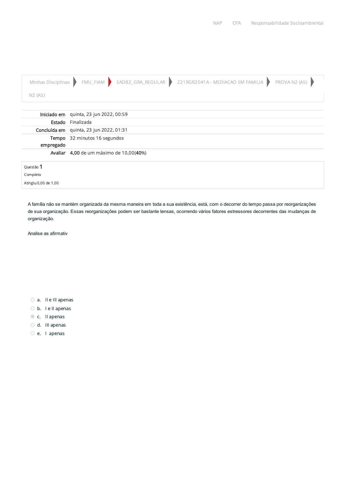 28/06/2022 18:22 N2 (A5): Revisão da tentativa https://ambienteacademico.com.br/mod/quiz/review.php?attempt=896388&cmid=347487 1/6 Minhas Disciplinas FMU_FIAM EADB2_GRA_REGULAR 221RGR2041A - MEDIACAO EM FAMILIA PROVA N2 (A5) N2 (A5) Iniciado em quinta, 23 jun 2022, 00:59 Estado Finalizada Concluída em quinta, 23 jun 2022, 01:31 Tempo empregado 32 minutos 16 segundos Avaliar 4,00 de um máximo de 10,00(40%) Questão 1 Completo Atingiu 0,00 de 1,00 A família não se mantém organizada da mesma maneira em toda a sua existência, está, com o decorrer do tempo passa por reorganizações de sua organização. Essas reorganizações podem ser bastante tensas, ocorrendo vários fatores estressores decorrentes das mudanças de organização. Analise as afirmativas: I - Somente existem fatores estressores previsíveis, isso possibilita identificá-los e prevê-los evitando crises maiores na família II - os fatores estressores verticais são comportamentos e percepções transmitidas de geração para geração. III - os fatores estressores horizontais são os que decorrem das alterações e alternância dos ciclos familiares. IV- O ciclos familiares sempre ocorrem nos moldes dos estágios estabelecidos na teoria, não ocorrendo alterações. Está correto o que se afirma em: a. II e III apenas b. I e II apenas c. II apenas d. III apenas e. I apenas NAP CPA Responsabilidade Socioambiental https://ambienteacademico.com.br/my/ https://ambienteacademico.com.br/course/index.php?categoryid=39 https://ambienteacademico.com.br/course/index.php?categoryid=133 https://ambienteacademico.com.br/course/view.php?id=12364 https://ambienteacademico.com.br/course/view.php?id=12364§ion=7 https://ambienteacademico.com.br/mod/quiz/view.php?id=347487 https://codely-fmu-content.s3.amazonaws.com/Moodle/NAP/inicial/nap/fmu/index.html https://codely-fmu-content.s3.amazonaws.com/Moodle/CPA/landing_CPA/index.html https://portal.fmu.br/sustentabilidade 28/06/2022 18:22 N2 (A5): Revisão da tentativa https://ambienteacademico.com.br/mod/quiz/review.php?attempt=896388&cmid=347487 2/6 Questão 2 Completo Atingiu 0,00 de 1,00 Questão 3 Completo Atingiu 1,00 de 1,00 Representa ferramenta de mediação em que o mediador de conflitos, ao perceber que uma das partes está interrompendo a fala da outra e também esteja realizando ironias e comunicação não violenta, o mediador pode utilizar essa ferramenta para relembrar as partes sobre o que foi explicado pelo mediador na fase de pré-mediação e pactuado na sessão de abertura Neste sentido, assinale a alternativa correta sobre a ferramenta utilizada: a. Sessão de abertura b. Teste de realidade c. Identi�cação de interesses e necessidades d. Tempo necessário para cada etapa do diálogo e. Enquadre Estudos comprovam que a mediação interdisciplinar assume papel importantíssimo para solução dos casos de alienação parental de forma a solucionar as tensões e aflições tanto dos alienadores como também dos menores vítimas de alienação parental, contribuindo assim para melhorar e cessar as síndromes de alienação parental. A respeito do papel positivo da mediação para gerir conflitos nas alienações parentais, analise as afirmativas a seguir: I. A mediação interdisciplinar realinha entre os cônjuges a compreensão adequada dos papéis de cônjuges e de pais. II. A mediação interdisciplinar promove a apuração da culpa para que os alienadores consigam cessar sua prática. III. A mediação interdisciplinar proporciona aos alienadores a retomada da responsabilidade e devolve a maturidade perdida por estes. IV. A mediação interdisciplinar promove aos alienadores visão retrospectiva assim podem olhar para suas condutas inadequadas. a. II e III, apenas. b. I, III e IV, apenas. . c. III, apenas. d. I e III, apenas. e. I, II e III, apenas. NAP CPA Responsabilidade Socioambiental https://codely-fmu-content.s3.amazonaws.com/Moodle/NAP/inicial/nap/fmu/index.html https://codely-fmu-content.s3.amazonaws.com/Moodle/CPA/landing_CPA/index.html https://portal.fmu.br/sustentabilidade 28/06/2022 18:22 N2 (A5): Revisão da tentativa https://ambienteacademico.com.br/mod/quiz/review.php?attempt=896388&cmid=347487 3/6 Questão 4 Completo Atingiu 0,00 de 1,00 Questão 5 Completo Atingiu 0,00 de 1,00 Assim como em boa parte do mundo, o Brasil sofre problemas muito grandes quanto à capacidade do Estado de dirimir conflitos através do Poder Judiciário, pois vem esperimentando crises de credibilidade e crises de identidade. Passado algum tempo, a Justiça Pública se mobilizou para resolver tais questões a qualquer custo. De acordo com as políticas públicas, analise as afirmativas a seguir: I. As partes com problemas não tinham facilidade para acesso direto ao Poder Judiciário. II. A crise de eficiência representada a falta de confiança da sociedade no Poder Judiciário III. A crise de credibilidade representa a incapacidade do Poder Judiciário resolver bem os conflitos. IV. A súmula vinculante é uma forma de reduzir as crises de identidade e credibilidade do Poder Judiciário. Está correto o que se afirma em: a. I e III, apenas. b. I, apenas. c. II e III, apenas. d. III, apenas. e. I e IV, apenas. Evolução histórica da família está intimamente ligada a grandes transformações sociais geradas por mudanças dos modos de produção, ocorridos dentro da história, assim como também por guerras e conflitos mundiais que reorganizaram a sociedade e também o comportamento de homens e mulheres. A respeito desses fenômenos sociais, analise as afirmativas a seguir e assinale V para a(s) Verdadeira(s) e F para a(s) Falsa(s). I. ( ) A família nuclear que conhecemos hoje surgiu com a Revolução Industrial em que houve estreitamento dos laços familiares. II. ( ) Desde a antiguidade até os dias atuais, o afeto foi a grande causa de formação da família. III. ( ) Até os anos de 1950 era preponderante a organização familiar em que o homem se ocupava de traba