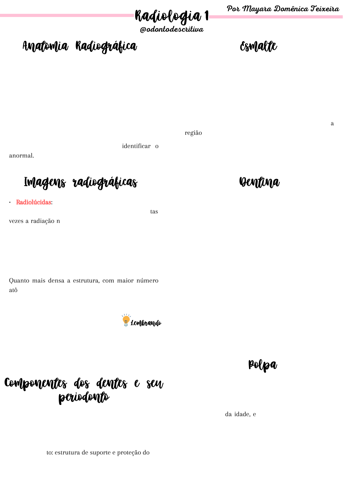 O esmalte é mais radiopaco porque é formado de 96% de material inorgânico e apenas 4% de substancia inorgânica. Sua espessura sofre afilamento em direção a margem cervical. Presente na coroa e na raiz, é uma estrutura mineralizada mas menos concentrada que o esmalte. Tem origem mesenquimal. - 70% de minerais (hidroxiapatita) - 20% de material orgânico - 10% de água - Dentina secundária: formada após a erupção dos dente, devido a desgaste fisiológico. Quanto mais velha a pessoa, mais dentina secundária ela terá. - Dentina terciária: também formada devido a estímulos, mas que são crônicos e de alta intensidade. Geralmente formada em regiões de lesão de cárie. - Com a formação de dentina secundária/terciária, há uma diminuição do volume pulpar. Além de conhecer os acidentes anatômicos por meio da anatomia topográfica, é importante reconhecê-los na imagem radiográfica. Não só os reparos anatômicos, mas também o estudo das variações morfológicas. A ausência de profundidade é responsável pela sobreposição de estruturas anatômicas na imagem. C A P Í T U L O 3 Radiologia 1 @odontodescritiva Anatomia Radiográfica Quanto mais densa a estrutura, com maior número atômico e a imagem vai ser mais radiopaca. - Há variações nos tons de cinza em estruturas que ficam no intermédio, representando a diferença de concentrações. Lembrando Por Mayara Domênica Teixeira Conceitos iniciais É preciso conhecer o normal para identificar o anormal. Imagens radiográficas • Radiolúcidas: são imagens de estruturas que absorvem pouco os raios X. Regiões onde muitas vezes a radiação não se deparou com obstáculos para atravessar. Ex.: Tecidos moles e áreas preenchidas por ar. • Radiopacas: são imagens de estruturas que possuem maior poder de absorção dos raios X. Na radiografia: imagens mais claras. Ex.: tecidos duros. Quanto maior a densidade e maior o número atômico mais RADIOPACA será a imagem, quanto menor a densidade e menor o número atômico mais RADIOLÚCIDA será a imagem. Componentes dos dentes e seu periodonto - Porção coronária (coroa) e radicular (raiz). - Componentes dentários: esmalte, dentina e polpa. - Periodonto: estrutura de suporte e proteção do dente. Componentes: gengiva, osso alveolar, ligamento periodontal e cemento. Esmalte estrutura mais mineralizada do corpo. Tem origem epitelial. Revestimento externo da coroa de todos os dentes. Possui espessura variável, a depender da região do dente. É radiopaco. - 96% de minerais (cristais de hidroxiapatita) - Formados principalmente por fósforo e cálcio) - 2% de material orgânico - 2% de água Dentina Polpa tecido conjuntivo frouxo não mineralizado, é uma estrutura radiolúcida. Pode ser coronária ou radicular, de acordo com sua localização. Diminui com o passar da idade, e sua forma varia de acordo com o dente. Tem origem mesenquimal, e sua formação varia de acordo com o elemento dentário. Diminui com a idade pela deposição de dentina secundária. Componente do periodonto de inserção, nível normal = 1,5 mm da junção amelo-cementária (até 3mm). A forma da crista depende do dente em questão. - Dentes anteriores = pontual; - Dentes posteriores = plana. É indicativa de doença periodontal quando se apresenta mais que 3 mm abaixo (reabsorção da crista, esfumaçamento). É onde tem a união das lâminas duras, onde termina o esmalte e se inicia o cemento nós chamamos de JUNÇÃO-AMELOCEMENTÁRIA. Mas existem algumas alterações da normalidade que nós chamamos de HIPERCEMENTOSE que é um aumento na produção do cemento. Origem mesenquimal, e possui a mesma densidade que a dentina. Reveste toda a raiz. Geralmente não é visto radiograficamente, por ser muito fino e por sua densidade que é facilmente confundida com a dentina. Tem a mesma densidade da dentina e reveste toda a raiz. C A P Í T U L O 4 Radiologia 1 @odontodescritiva Cemento Por Mayara Domênica Teixeira Geralmente não é visto radiograficamente, apresenta espessura muito fina, além disso a densidade se confunde com a densidade da dentina pois são muito próximas. Crista óssea alveolar Osso alveolar É composto por fibras colágenas, componente do periodonto de inserção que une a estrutura dentária ao osso, formando a articulação dos dentes e amortecendo as cargas que incidem sobre os dentes. Fina linha que contorna as raízes. Mais largo próximo à crista alveolar e ápice radicular. RADIOLÚCIDO - Espaço do ligamento periodontal. Lembrando Ligamento periodontal Lâmina dura Componente do pediodonto de inserção. Osso mais denso, compacto, onde ocorre a inserção dos ligamentos periodontais. É uma linha contínua, de espessura uniforme (1mm). Varia conforme a forma e posição das raízes. É uma estrutura radiopaca. O ligamento periodontal se insere de um lado no CEMENTO e do outro lado na LÂMINA DURA. Alveolar pois formam os alveolos onde ficam os dentes. Composto por trabéculas ósseas (radiopacas) e espaços medulares (radiolúcidos). - Maxila: trabéculas finas e numerosas; padrão granular; aspecto de teias de aranha. - Mandíbula: trabéculas orientadas no sentido horizontal e em menor quantidade; espaços medulares maiores. C A P Í T U L O 4 Radiologia 1 @odontodescritiva Fossas Nasais (cavidade nasal) Por Mayara Domênica Teixeira Sutura intermaxilar Projeções das narinas Áreas simetricamente dispostas acima dos ápices radiculares dos incisivos; Podemos visualizar em radiografias periapicais ANTERO SUPERIORES (nas radiografias periapicais de incisivos centrais superiores -na porção apical-); Nessa região vai ter a presença de AR e a densidade vai ser menor. Radiolúcidos Forame incisivo Forma oval ou de gota invertida. Localiza-se entre os incisivos centrais superiores. Região antero superior. Área arredondada na região do ápice dos incisivos centrais superior; Vamos ver a sobreposição (bem sutil na imagem), vamos ver as sombras das narinas. Co