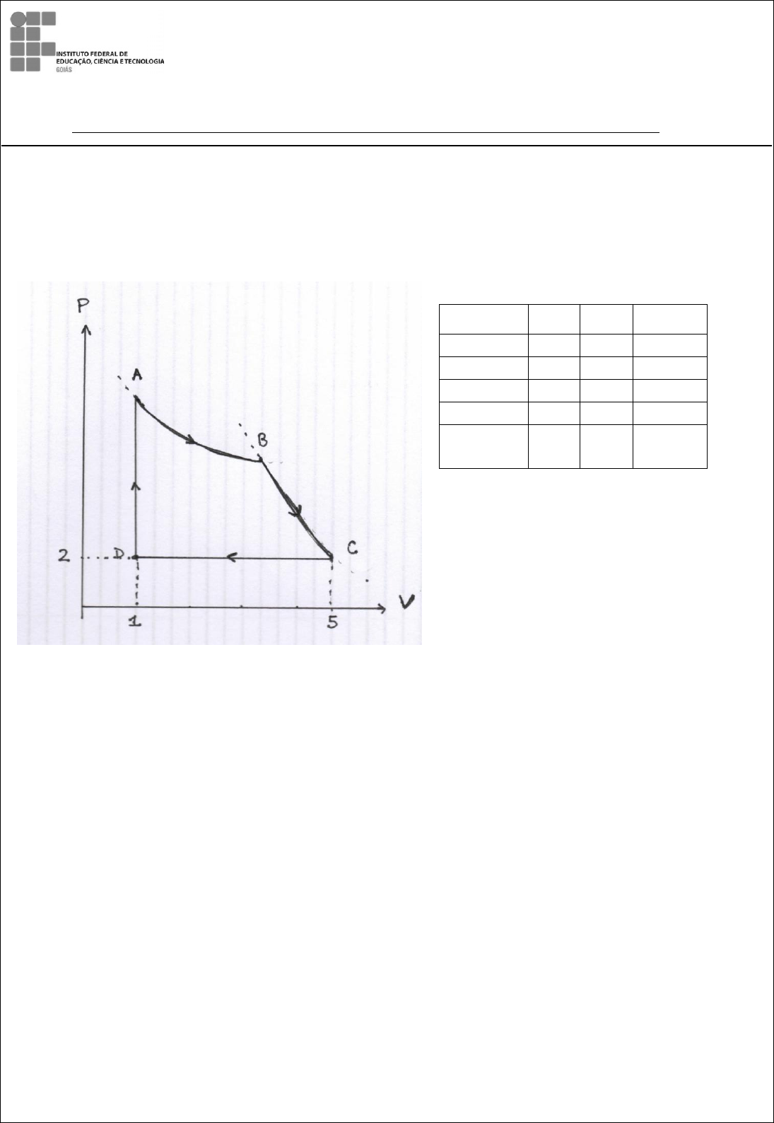 Atividade – Calorimetria e Termodinâmica 2021/2 __ Prof. Luciano Calaça Aluno: 1 – Uma amostra de gás passa pelo ciclo 𝐴𝐵𝐶𝐷𝐴 mostrado no diagrama 𝑃 x 𝑉 abaixo. Com 𝑃 dado em 105 N/m2 e 𝑉 em 10−4 m3, complete a tabela com os valores correspondentes. Considere a trajetória 𝐴𝐵 uma isoterma, a trajetória 𝐵𝐶 uma adiabática, 𝐶𝐷 uma isobárica e 𝐷𝐴 uma isométrica. O trabalho 𝐴𝐵𝐶 é 300 J, a energia interna em 𝐴 é 500 J e a energia interna em D é o dobro da energia interna em C. 2 - Que massa de vapor d’agua a 100 °𝐶 deve ser misturada com 400 𝑔 de gelo a −12 °𝐶, em um recipiente isolado termicamente, para se obter água a 25 °𝐶? 𝐿𝑉 = 539 𝑐𝑎𝑙/𝑔 𝐿𝐹 = 79,5 𝑐𝑎𝑙/𝑔 𝑐𝑎𝑔𝑢𝑎 = 1,0 𝑐𝑎𝑙/𝑔. °𝐶 𝑐𝑔𝑒𝑙𝑜 = 0,53 𝑐𝑎𝑙/𝑔. °𝐶 𝑐𝑣𝑎𝑝𝑜𝑟 = 0,50 𝑐𝑎𝑙/𝑔. °𝐶 3 – Um posto de combustível compra 5000 litros de gasolina a uma temperatura de 20 °C a R$ 6,10 o litro e o revende a R$ 6,75 a uma temperatura de 30°C. (a) Qual é o lucro total desta venda? (b) hipoteticamente, a qual temperatura de venda este posto teria prejuízo (𝛾𝑔𝑎𝑠𝑜𝑙𝑖𝑛𝑎 = 1,2 . 10 −3 °𝐶−1)? Etapa 𝑊(J) 𝑄(J) Δ𝑈𝑖𝑛𝑡(J) AB 200 BC CD DA Ciclo (ABCDA) Atividade – Calorimetria e Termodinâmica 2021/2 __ Prof. Luciano Calaça Aluno: 4 - Um anel de um certo material com (𝛼 = 20. 10−5/°𝐶 ) de massa 30 g a 0° C tem um raio 𝑟. Uma esfera feita com outro material (𝛼 = 30. 10−5/°𝐶 ) tem a 500° C um raio 𝑅. A esfera é colocada acima do anel (figura abaixo) até que os dois atinjam o equilíbrio térmico, sem perda de calor para o ambiente. A esfera se ajusta perfeitamente ao anel da temperatura de equilíbrio. Qual é a massa da esfera? Considere que inicialmente a distância entre o centro do anel e o centro da esfera é dado por 𝑦 = 𝑅/2 e que o calor específico do anel é igual a 10 vezes o da esfera. 𝑅 𝑟 𝑦