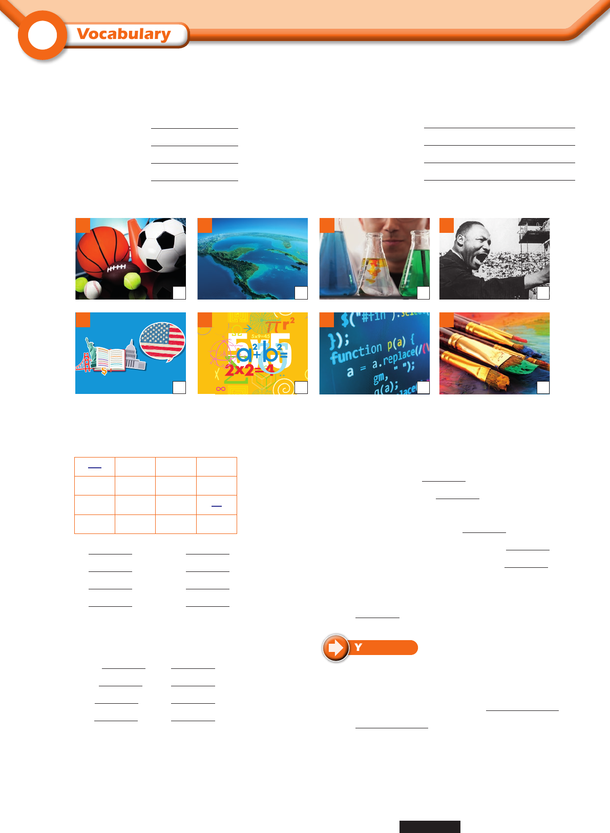 School subjects 1 Unscramble the school subjects. 1 E. P. P.E. 2 t h m a 3 t i h o r s y 4 s E h i n l g Basic adjectives 3 Match the letters to make adjectives. sm ea b ha ne ig o rig wr ht ong all sy ld rd w 1 small 5 2 6 3 7 4 8 4 Complete the adjectives. Then write their opposites. 1 small big 2 ea 3 ri 4 o Metro Starter • Vocabulary Unit 1 PHOTOCOPIABLE © Oxford University Press 2018 Vocabulary1 1 A C E G B D F H 5 c e s i n e c 6 t r c m o p u e c c e i n s e 7 p y g o g e r h a 8 t r a 2 Match the pictures A–H with the school subjects 1–8 in exercise 1. 5 Complete the sentences with the correct adjectives. 1 Brazil is a very big country. 2 No, that isn’t the answer. It’s 10, not 11. 3 George is 87. He’s very . 4 I’m not good at science. It’s very . 5 It’s my first day at school – I’m a student. 6 There are twelve students in my class – it’s very . Your turn 6 Complete the sentences with information about you. 1 My favorite school subject is . 2 is a very hard school subject. 3 My school bag is big / small. 4 My phone is old / new. PHOTOCOPIABLE © Oxford University Press 2018 Vocabulary Metro Starter • Vocabulary Unit 2 2 Nationalities 1 Complete the nationalities in the puzzle. B R B S A I H T I Z A S T L I H M R I N C N S 2 Choose the correct words. 1 Ana is from Colombia / Colombian. 2 I’m Jamaica / Jamaican. 3 Sanjay is from India / Indian. 4 Maria Isabel is Mexican / Mexico. 5 Toby and Ben are from South Africa / South African. 6 Miwa is Japan / Japanese. 1 2 3 4 5 6 Family 3 Unscramble the family words. 1 s t r e i s sister 2 a r e f h t 3 m g r n o r e a d t h 4 c e l u n 5 t a n u 6 h e b o t r r 7 s o n i c u 8 o r e m h t 9 a f a g r d n t e h r 4 Complete the chart with the words in exercise 3. 1 sister 2 3 4 5 6 7 8 9 5 Complete the family words in the family tree. Your turn 6 Answer the questions for you. 1 What’s your nationality? 2 How old is your best friend? 3 What’s your father’s name? 4 Where are your friends from? 1 grandfather 3 a 5 m 7 c me 9 s 8 b 4 u 6 f 2 g PHOTOCOPIABLE © Oxford University Press 2018 Vocabulary Metro Starter • Vocabulary Unit 3 3 2 Label the places in the map. 1 gym 2 3 4 5 3 Look at the map in exercise 2 again. Choose the correct words. 1 The gym is between / next to the skatepark. 2 The restaurant is across from / next to the park. 3 The skatepark is across from / between the gym and the restaurant. 4 The coffee shop is across from / next to the park. 5 The park is across from / between the skatepark and the restaurant. In my bedroom 4 Unscramble the words to make bedroom objects. 1 d b e bed 2 l e c o s t 3 r e s s k a p e 4 r a t u g i 5 b e l t a t 6 e k s d 7 s a n e j 8 p l m a 9 n e s k a r e s 10 s c e a o b o k City life 1 Complete the words for places in town. 1 m o v i e t h e a t e r 5 g 2 r s a u a n 6 c o e e o p 3 r k 7 m l 4 s a t p r k 8 s t e 5 Match the bedroom objects A–J with the words 1–10 in exercise 4. 6 What is the correct place for these things? Look at the items and write in, on, or under. 1 tablet on the desk 2 sneakers the bed 3 speakers the bookcase 4 new sneakers a box 5 bed the bedroom 6 lamp the desk 7 jeans the closet Your turn 7 Write about three places in your neighborhood and three objects in your bedroom. Describe where they are with across from, between, next to, in, on, and under. In my neighborhood, the movie theater is next to the coffee shop. In my bedroom, my desk is across from my bed. 1 2 3 4 5 6 A 2 B F JI C E H D G PHOTOCOPIABLE © Oxford University Press 2018 4 Vocabulary Metro Starter • Vocabulary Unit 4 4 Abilities 3 Match the letters to make abilities. co ak im ng ay pl si spe ve da di sw nce aw ok dr 1 cook 5 2 6 3 7 4 8 4 Complete the sentences with abilities in exercise 3. 1 My dad likes pizza, but he can’t cook ! 2 Your sister can English, Portuguese, and French. 3 Taylor Swift can . 4 My mom can the guitar. 5 Can you ? I can’t. My picture isn’t very good! 6 My brother can 1,000 meters in the swimming pool. 7 My brother is only 2 years old. He can’t into the pool. Your turn 5 What are your interests and abilities? Complete the sentences with two things you like and two things you can do. I like gaming. I can cook. 1 I like . 2 I like . 3 I can . 4 I can . Interests 1 Find seven more interests. M E S S A G I N G W B S A G B T A V W T S M K V G A M I N G H V H U M A A M U V M P M T O S P T Z M V S S H O P P I N G I I I W T K V A I C S M N N E G E M I G N B H F E G S H M V E A G S K A S K M S U W S P O R T S M A G A S I N B V H P O F A S H I O N A M T V N W V B T K S S P O A T S 2 Label the pictures with the interests in exercise 1. 1 messaging 2 3 4 5 6 7 8 PHOTOCOPIABLE © Oxford University Press 2018Metro Starter • Vocabulary Unit 5 Possessions 1 Complete the names of the possessions. 1 b i k e 2 h d p o n 3 s a t o a d 4 b r e e t 5 w a h 6 w a e 7 l p p 8 s n a s e s 2 Complete the sentences with the possessions in exercise 1. 1 Your sunglasses are very big. I can’t see your eyes! 2 I can ride my very fast. 3 He has 100 Euros in his . 4 I don’t have my . I can’t listen to my music. 5 He can watch videos on his . 6 What time is it? I don’t have my . 7 Joe is at the skatepark with his . 8 My sister has a new . It has a picture of a flower on it. Action verbs 3 Choose the correct words. 1 Don’t drink / eat fast food. It’s bad for you! 2 It’s a math test. We can’t sell / talk! 3 You can run / sell a lot of things on eBay. 4 Run / Walk! You’re late for school! 5 Don’t drink / listen this water. It’s two days old! 6 “Where can I buy / drink some new sunglasses?” “There’s a nice store on Blakeley Street.” 7 Tommy can’t eat / walk because he’s only 7 months old. 8 Listen / Talk to the music. 5 Vocabulary5 4 Complete the conversation with action verbs. Sam: Where can we have lunch? Paul: There’s a great new restaurant next to the mall. Sam: OK. What can we 1 eat there? Paul: It 2 awesome pizzas an