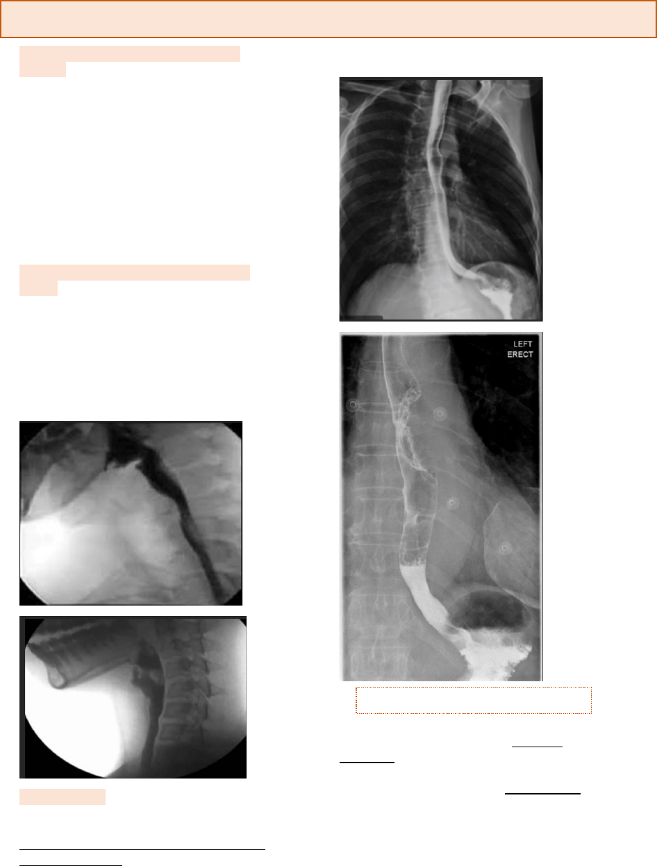 Gabriella Comerlatto – T3 Radiografia contrastada do Esôfago (REED) • Radiografia contrastada - Utiliza o Sulfato de Bário para avaliação do TGI • O uso de contraste de bário é contraindicado em casos de suspeita de perfuração de víscera oca, pois esse pode causar uma peritonite química. Nesses casos é indicado a utilização do contraste de iodo • Dentre esses exames de radiografia contrastada para avaliação do TGI, tem-se o Deglutograma, Esofagograma, EED, Trânsito intestinal e Enema opaco Deglutograma ou Videodeglutograma (VDG) • Avalia o ato de deglutição por meio da ingestão de uma série de substâncias baritadas, procurar se tem fístula • É aconselhado para esse exame que todas as radiografias sejam filmadas para que possa ser visualizado todo o ato de deglutir • Indicação clínica: disfagia, neoplasias (massas cervicais), pneumonia aspirativa Distúrbios de esôfago Esofagoframa • Representa a avaliação contrastada do esôfago para avaliação de sua permeabilidade, elasticidade, motilidade, contorno e relevo • Caindo em desuso, manometria (distúrbio de mobilidade) e endoscopia são melhores (avaliação de parede) • Indicação clínica: Neoplasias, disfagias, acalasia, doença do refluxo, esofagite erosiva, estenose esofágica, hérnia de hiato, distúrbio de mobilidade, suspeita de fístula, pós-operatório Distúrbios de mobilidade • Podem ser consequentes de doenças sistêmicas: Esclerodermia, Chagas, desordem neuromuscular, diabetes • Podem ser consequentes a danos físicos: Ingestão de ácidos, químicos, venenos • Manometria é o principal exame: avalia relaxamento incompleto do esfíncter inferior (acalasia), contrações não coordenadas, hipercontração (esôfago em quebra nozes), esfíncter inferior hiper-reativo, hipocontração e pHmetria com cápsula • Clássico da neoplasia esofágica, estreitamento esôfago. Tomografia é o melhor exame Acalasia • Junção esôfago gástrica, a função do esfíncter é quando o alimento chega no estomago ele contraia e impeça que o alimento volte, no paciente que tem acalasia a contração fica constante e o alimento tem dificuldade de passar, lúmen bem estreitado. Ao longo do tempo dilata a porção distal do esôfago e a parede hipertrofia até entrar em falência (perde mobilidade), megaesôfago • É um distúrbio da motilidade esofágica caracterizada pela ausência de peristalse esofágica e alteração do relaxamento do esfíncter inferior do esôfago (EIE) em resposta à deglutição, levando à uma obstrução funcional da junção esôfago-gástrica, e que a longo prazo vai levar à dilatação esofágica conhecida como megaesôfago • Manometria é o exame de primeira escolha • Endoscopia e esofagograma podem estar normais em casos iniciais Bico de papagaio (hipertrofia da válvula fazendo um estreitamento da luz, paredes espessadas – começa no grau III Espasmo esofágico difuso • Acomete a musculatura lisa do esôfago • Contrações involuntárias sem ter alimento, dores fortes podem simular infarto • O lúmen esofágico pode mostrar aspecto de “saca-rolha” ou “contas de rosário” • Manometria é o melhor exame Esôfago em quebra-nozes • Dor torácica intensa • Diagnóstico por manometria • Contrações aperistálticas • Esofagograma com ondas terciárias e divertículos Prebiesôfago • Disfunção de mobilidade relacionada ao envelhecimento (degeneração neuronal) • Musculatura lisa envelhece e perde função de contração, alimento desce mais pela gravidade do que peristaltismo do esôfago • Parede espessada, irregular Esclerodermia Distúrbio secundário • Distensão difusa do esôfago, a diferença pra acalasia e chagas é que tem distensão do esôfago proximal e a junção esofagogástrica fica aberta • Contraste fica boiando, desce por gravidade • Ausência de peristalse nos terços distais do esôfago • Região gastroesofágica aberta – pode ocorrer refluxo e hérnia de hiato • Erosões e úlceras superficiais • Saculações esofágicas Doença de chagas • Alterações semelhantes a acalasia - Parte distal contrai, e forma uma dilatação montante, afilamento da porção distal e dilatação do corpo, formando um balão • A doença acomete o plexo mioentérico gastrointestinal Esofagite infecciosa • Imunocomprometidos • Após tratamento com radioterapia ou quimioterapia • Achados característicos: nas glândulas -bolinhas brancas, parede mais espessada Esofagite de Refluxo • Mais frequente de doença inflamatória do esôfago • Causa mais comum de úlceras esofágicas • Ocorre quando o conteúdo gástrico é regurgitado passivamente • Achados de imagem: Redução da mobilidade, espessamento parietal, úlceras distais, pólipos e pseudodivertículos Esôfago de Barret • Metaplasia colunar do esôfago distal, consequente a doença de refluxo prolongada • Condição pré-maligna • Pode evoluir para estenose do esôfago, mais comum no terço distal • Normalmente associado a hérnia de hiato Esofagite cáustica • Ingestão de substâncias químicas (alcalinas ou ácidas) • Pode ser aguda e necrotizante ou em fase tardia de cicatrização e estenose • Mucosas espessadas, com pregueamento irregular • Estreitamento gradual, com dilatação a montante e dificuldade de esvaziamento • Podem aparecer pseudodivertículos Esofagite actínica • Paciente que já fez varias radioterapias pode destruir a parede esofágica e tem consequência semelhante a esofagite cáustica 01.2022