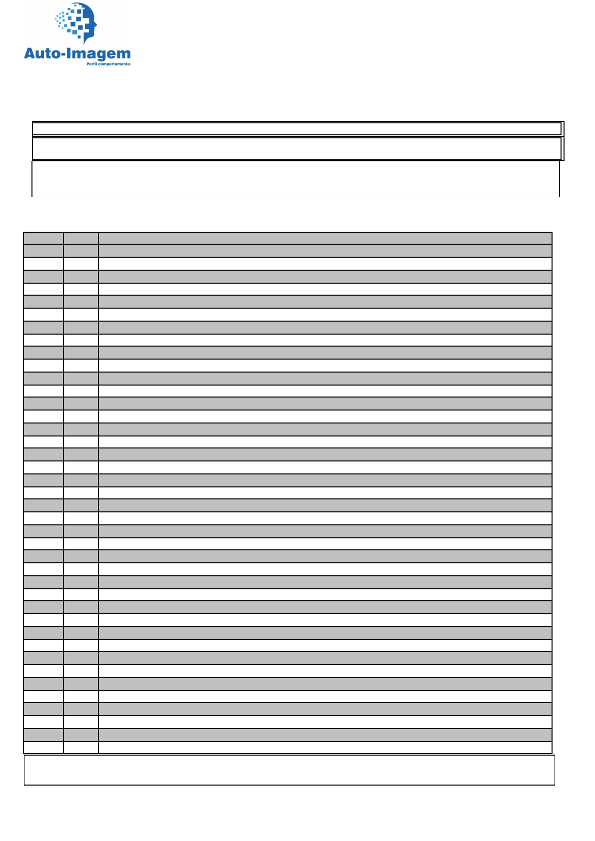 AUTO-IMAGEM – OPERACIONAL Leia atentamente cada uma das questões abaixo e pontue de 1 a 5 as que mais combinam com seu estilo comportamental no ambiente profissional, ou seja, sua forma natural de agir e que retratam a sua auto-imagem (a forma como você se percebe). INSTRUÇÕES: 1 - Preencher todos os campos pessoais, não abreviar nome, pré-nomes, sobre-nome; 2 - Ler com atenção o que está sendo pedido; 3 – Uma vez iniciado o preenchimento não faça interrupções, concentre-se 4 - Responda com naturalidade, espontaneamente, seguindo apenas seu próprio entendimento. Caso de qualquer dos itens abaixo não ser atendido com exatidão, não nos responsabilizamos pelo resultado da avaliação. Nome completo: (Letra legível, NÃO abreviar nome, pré-nomes, sobrenome) * Preenchimento Obrigatório * Data de nascimento: _____/_____/_______.* Sexo: _________________________* Estado Civil:__________________________ * Nº.CPF: *Função: PONTUAÇÃO: 1 - (DISCORDO) 2 - (CONCORDO EM PARTE) 3 - (TALVEZ) 4 - (CONCORDO) 5 – (CONCORDO PLENAMENTE) Ordem Nº. Questão 1 Sabe liderar pessoas 2 Você se considera um criador de mudanças 3 Indiferente da opinião dos outros, você prefere correr riscos, e assume a responsabilidade. 4 Você tolera pressão direta da chefia. 5 Você apresenta novas idéias e melhores para o andamento do trabalho.. 6 Você prefere que sua chefia oriente seu trabalho em situações de mudanças das regras 7 Você sente-se mais seguro tendo alguém por perto para dar-lhe treinamento e orientação. 8 Prefere descobrir soluções do seu jeito. Você é uma pessoa criativa 9 Prefere supervisão constante, chefe sempre junto dando orientação. 10 Gosta de harmonia, aceita políticas da empresa 11 Você é comunicativo, falante, extrovertido. 12 Você é formador de equipe, consegue descobrir novos talentos entre os colegas 13 Você se relaciona muito bem com os colegas, é um bom político tem “jogo de cintura” 14 Você se preocupa com o desenvolvimento de pessoas e colegas 15 Você consegue sentir o que sentiria um colega caso estivesse na mesma situação. 16 Você é uma pessoa criativa. Do nada encontra uma solução facilmente. 17 Você prefere trabalhar em contato com pessoas não gosta de trabalhar sozinho. 18 Você é uma pessoa tímida, reservado. 19 Você gosta de estar à frente das pessoas, se comunicar, falar livremente. 20 Você é reservado, prefere concentrar-se no seu trabalho não gosta de se expor(aparecer) 21 Você é calmo, tranqüilo, faz tudo a seu tempo, não é estressado 22 Prefere ambientes tranqüilos para trabalhar sem sofrer pressão do tempo 23 Você é multitarefa não se incomoda em ter que iniciar diversas tarefas ao mesmo tempo 24 Você não se incomoda em ter que trabalhar em ambientes agitados 25 Você é um ouvinte paciente, de fácil convívio, amigável com colegas e chefia. 26 Você sente-se mais à vontade em trabalhos com mobilidade, visitar pessoas, movimentar-se. 27 Você prefere trabalhar num ambiente sem rotinas, não repetitivo, sempre fazer tarefas diversas 28 Caso sua função exija, você sente-se à vontade tendo que exercer pressão sobre os colegas. 29 Você tem um alto sentido de urgência, fazer acontecer...agora, é rápido. 30 Você não tolera atrasos, seu jeito de trabalhar é eliminando obstáculos, sejam quais forem. 31 Você tem um forte senso de dever, é disciplinado, sempre pergunta em caso de dúvida 32 Você é cuidadoso e segue sistemas aprovados, segue regras aprovadas. 33 Você exerce controles fortes, críticos e minuciosos sobre as tarefas, suas, e nas dos demais. 34 Você prefere iniciar e terminar as tarefas seguindo padrões exatos, detalhes e regras. 35 Você necessita ter certeza, clareza e segurança para tomar decisões quanto as suas tarefas 36 Você é flexível com aspectos puramente técnicos, procura soluções, mesmo fora do padrão. 37 Você sente-se à vontade em situações onde a regra não é clara e tem que decidir sozinho 38 Você prefere fazer do seu jeito para que as coisas aconteçam ao invés de seguir normas. É flexível. 39 Em suas tarefas rotineiras você está mais preocupado com os resultados do que com detalhes 40 Você é determinado e insistente mesmo quando suas idéias são rejeitadas, é persistente. ASSINATURA: DATA: