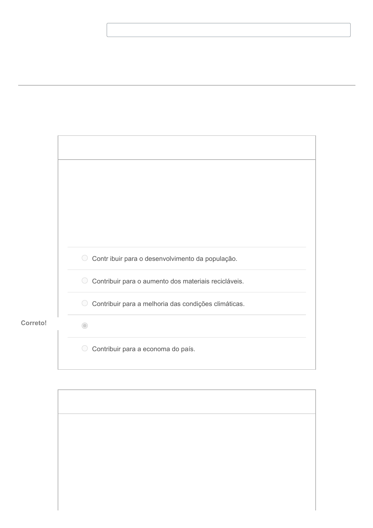 04/07/2022 14:56 RODRIGO MOREIRA, histórico de teste: Prova Presencial https://dombosco.instructure.com/courses/9500/assignments/30078/submissions/42165 1/8 Seu Progresso: 100 % Prova Presencial Resultados para RODRIGO MOREIRA Pontuação deste teste: 55 de 60 Enviado 14 abr em 15:30 Esta tentativa levou 38 minutos. 5 / 5 ptsPergunta 1 Os profissionais de gestão ambiental são neessáios emdiversas áreas de trabalho, pois cada vez há mais consciência dos benefícios e da importância de se viver em um ambiente saudável. Sendo asism, assinale a alternativa correta: Contr ibuir para o desenvolvimento da população. Contribuir para o aumento dos materiais recicláveis. Contribuir para a melhoria das condições climáticas. Contribuir para o desenvolvimento sustentável. Correto!Correto! Contribuir para a economa do país. 5 / 5 ptsPergunta 2 É ser capaz de suprir as necessidades da geração atual, sem comprometer a capacidade de atender as necessidades das futuras gerações. Não esgota os recursos para o futuro. Essa definição surgiu na Comissão Mundial sobre Meio Ambiente e Desenvolvimento, criada pelas Nações Unidas para discutir e propor meios de harmonizar dois objetivos: o desenvolvimento econômico e a conservação ambiental. 04/07/2022 14:56 RODRIGO MOREIRA, histórico de teste: Prova Presencial https://dombosco.instructure.com/courses/9500/assignments/30078/submissions/42165 2/8 Tal definição refere-se a: Assinale a alternativa CORRETA: Desenvolvimento Financeiro. Desenvolvimento Econômico. Sustentabilidade Econômica. Desenvolvimento Sustentável. Correto!Correto! Desenvolvimento capitalista. Conservação Sustentável. 5 / 5 ptsPergunta 3 Existem muitos danos causados pela emissão / descarte poluentes. Conforme os conteúdos estudados, um exemplo de danos ambientais é o/a: Acesso ao transporte público. Impedimento de uso do rio. Correto!Correto! Uso de bicicletas. Falta de ruas pavimentadas. Uso de carros elétricos. 5 / 5 ptsPergunta 4 04/07/2022 14:56 RODRIGO MOREIRA, histórico de teste: Prova Presencial https://dombosco.instructure.com/courses/9500/assignments/30078/submissions/42165 3/8 O conceito clássico de desenvolvimento sustentável afirma que “É o desenvolvimento capaz de suprir as necessidades da geração atual, sem comprometer a capacidade de atender as necessidades das futuras gerações. É o desenvolvimento que não esgota os recursos para o futuro” (BRUNDTLAND,1991). São os componentes de desenvolvimento sustentável os: socioeconômico, ambiental socialista. econômico, ambiental e capitalista. econômico, sociopolítico e ambiental. Correto!Correto! Político, didatorial e dominação cultural. político, econômico e agrícola. 5 / 5 ptsPergunta 5 A inevitável devastação ambiental decorrente do processo de desenvolvimento industrial é um "quadro" que começa a se modificar a partir da defesa pública de um novo conceito: O DESENVOLVIMENTO SUSTENTÁVEL. O uso dessa expressão tem a finalidade de: propor a conciliação do desenvolvimento com o meio ambiente. Correto!Correto! sustentar a inevitável necessidade do desenvolvimento. sustentar o meio ambiente em detrimento do desenvolvimento. divulgar a insustentável situação do meio ambiente garantir que o desenvolvimento contemporâneo não se sustenta. 04/07/2022 14:56 RODRIGO MOREIRA, histórico de teste: Prova Presencial https://dombosco.instructure.com/courses/9500/assignments/30078/submissions/42165 4/8 5 / 5 ptsPergunta 6 Leia o excerto: “A ética profissional codificada estabelece padrões de conduta desejáveis de modo prescritivo, o que significa uma redução da liberdade dos profissionais ao adotar a prática que achar mais conveniente segundo suas próprias normas morais. ”BARBIERI, José Carlos; CAJAZEIRA, Jorge Emanuel Reis. Responsabilidade Social Empresarial e Empresa Sustentável: da teoria à prática. 3 ed. São Paulo: Saraiva, 2016. p. 75. De acordo com o enunciado, assinale a alternativa correta. Código de ética e código de conduta possuem conceitos diferentes, mas, na prática, as empresas fazem uma mescla dos dois. Correto!Correto! O código de ética e conduta não pretende restringir a liberdade de escolha dos indivíduos que trabalham na empresa. As teorias éticas têm pouca aplicabilidade prática na éticaempresarial e na elaboração de códigos de ética e conduta. A ética da responsabilidade é um assunto que escapa ao contexto empresarial e não caberia em um código de ética e conduta profissional. A ética é um assunto restrito ao ambiente de trabalho e, para ela existir, deve estar codificada. 04/07/2022 14:56 RODRIGO MOREIRA, histórico de teste: Prova Presencial https://dombosco.instructure.com/courses/9500/assignments/30078/submissions/42165 5/8 5 / 5 ptsPergunta 7 O Relatório Brundtland, intitulado Nosso Futuro Comum (Our Common Future), publicado em 1987, foi o primeiro documento a conceber e definir um conceito muito importante para a área ambiental. Leia o fragmento a seguir que trata do conceito definido nesse relatório. “_____ é aquele que satisfaz as necessidades _____, sem comprometer a capacidade das gerações _____ de suprir suas próprias necessidades”. Assinale a opção que completa corretamente as lacunas do fragmento acima: Ecodesenvolvimento – presentes – passadas Ecodesenvolvimento – passadas – futuras Desenvolvimento sustentável – presentes – futuras Correto!Correto! Ecodesenvolvimento – futuras – presentes Desenvolvimento sustentável – futuras– presentes 0 / 5 ptsPergunta 8 Segundo a Comissão Mundial sobre Meio Ambiente e Desenvolvimento da Organização das Nações Unidas (1972), a definição mais aceita para desenvolvimento sustentável é a que diz respeito ao desenvolvimento capaz de suprir as necessidades da geração atual, sem comprometer a capacidade de atender as 04/07/2022 14:56 RODRIGO MOREIRA, histórico de teste: Prova Presencial https://dombosco.instructure.com/