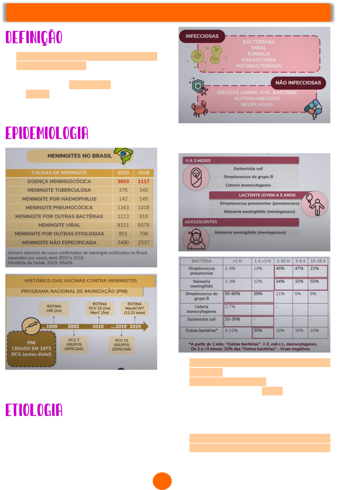 DJULIE H M DE ANDRADE 1 Meningite Bacteriana − Infecção purulenta das meninges e do espaço subaracnoide, relacionada a uma intensa reação inflamatória do SNC. − Pode ocorrer de forma aguda (horas a dias) ou crônica (4 semanas). − Pode ser causada por bactérias, fungos, parasitas, traumatismo e asséptica. − 90% dos casos são crianças de um mês aos cinco anos de idade. − Depende da idade, estado imune e da epidemiologia. − RN e lactente até os 3 meses: Streptococcus agalactiae (estreptococo do grupo B), Listeria monocytogenes e bactérias gram- negativas entéricas (E. coli, Enterobacter spp., Klebsiella pneumoniae, Salmonella enteritidis). A aquisição dessas bactérias se dá no momento do parto (colonização da mucosa vaginal). − 3 meses aos 18 anos: Neisseria meningitidis (meningococo), Streptococcus pneumoniae DJULIE H M DE ANDRADE 2 (pneumococo) e o Haemophilus influenzae tipo b. − S. pneumoniae: quadros clínicos de maior gravidade. Pneumonia, sinusite, OMA ou crônica, alcoolismo, diabetes, esplenectomia, hipogamaglobulinemia, trauma cranioencefálico com fratura de base de crânio e fístula liquórica, anemia falciforme e deficiência de complemento são fatores de risco. − N. meningitidis: raramente deixa sequelas. Deficiência do sistema complemento é fator de risco. − H. influenzae: menos letal, mas costuma deixar sequelas com maior frequência. − Staphylococcus aureus e o Staphylococcus epidermidis, principalmente o último, são os microorganismos mais envolvidos em meningite após procedimentos neurocirúrgicos. − Bastonetes Gram-negativos: alcoólatras, diabéticos, pacientes com infecção crônica do trato urinário e em indivíduos com estrongiloidíase disseminada. − Pós-punção lombar: S. aureus e Pseudomonas aeruginosa. − Colonização de VAS por germes patogênicos, que podem invadir o epitélio e se disseminar para a corrente sanguínea → a depender da virulência do microrganismo e da competência das defesas do hospedeiro. − Microrganismos alcançam o plexo coroide, invadem o espaço subaracnoide e se multiplicam no líquor. − A lise bacteriana leva a liberação de elementos de sua parece celular, como o lipopolissacarídeo (gram-negativas) e ácido teicoico e peptideoglicano (gram-positivas) que induzem inflamação intensa das meninges pela produção de citocinas (TNF-α e IL-1). − Citocinas alteram as propriedades da barreira hematoencefálica, a permeabilidade capilar → favorece o aparecimento do edema cerebral do tipo vasogênico e permite o extravasamento de proteínas e leucócitos para o líquor → formação de exsudato espesso. − O exsudato pode bloquear a reabsorção liquórica pelas granulações aracnoideas, levando à hidrocefalia e ao edema cerebral do tipo intersticial. − As citocinas também levam ao surgimento de selectinas (receptores para leucócitos presentes em células endoteliais), que favorece migração destas células para o líquor. − Liberação de radicais livres derivados de oxigênio e a degranulação de neutrófilos contribuem ainda mais para o edema citotóxico que se instala. − Com todo esse processo, a autorregulação cerebrovascular é perdida. Esse mecanismo de autorregulação é fundamental para preservar a perfusão cerebral adequada frente a variações da pressão arterial média (PAM). Se houver hipotensão: hipofluxo cerebral pode determinar alterações isquêmicas; Se houver hipertensão: agravamento do edema cerebral. − Processo inflamatório no espaço subaracnoide pode acometer os vasos sanguíneos, ocasionando trombose e infarto cerebral isquêmico (isquemia do SNC ocasiona edema citotóxico) ou favorecer a disseminação do processo infeccioso para o encéfalo, determinando o aparecimento de abscessos cerebrais. DJULIE H M DE ANDRADE 3 − Espectro variado. Lactentes: febre ou hipotermia, irritabilidade, letargia, hipoatividade, recusa alimentar, vômitos, diarreia, dificuldade respiratória, fontanela abaulada, convulsões e alterações do nível de consciência. Crianças maiores: febre, prostração, anorexia, fotofobia, cefaleia, vômitos, bradicardia, hipertensão arterial, convulsões, alterações do nível de consciência, exantema maculopapular, petéquias e púrpura e sinais de irritação meníngea. CONVULSÃO: pode ser febril ou meningoencefalite ou abscesso. PETÉQUIAS: pensar em meningococo. − 3 síndromes concomitantes: Síndrome toxêmica; Síndrome de irrtitação meníngea; Síndrome da hipertensão intracraniana. Síndrome toxêmica − Febre alta + mal-estar + prostração + agitação psicomotora. − Pode ter rash cutâneo (40-60%), há rash hemorrágico marcado pelo surgimento de petéquias e equimoses disseminadas, pode ser encontrado dano endotelial nos capilares da derme pela “semeadura”. Síndrome da irritação meníngea Síndrome de Hipertensão Intracraniana − Vômitos, cefaleia holocraniana intensa, abaulamento de fontanela, paralisia de DJULIE H M DE ANDRADE 4 abducente, anisocoria, hipertensão arterial, bradicardia e bradipneia → pode evoluir para decorticação, herniação e coma. − Os sinais clínicos de elevação na PIC são papiledema, que se desenvolve em algumas horas, nível alterado de consciência e/ou paralisia unilateral ou bilateral no sexto nervo craniano (abducente). As varreduras por TC geralmente são normais em pacientes com PIC elevada ou que apresentam perdas de marcas nos sulcos. Marcadores de mau prognóstico das meningites bacterianas − Rebaixamento do nível de consciência à admissão hospitalar; − Convulsões dentro de 24h da admissão hospitalar; − Extremos das idades (crianças e adultos > 50 anos); − Sinais de aumento da pressão intracraniana; − Choque ou necessidade de ventilação mecânica; − Atraso no início da terapia; − Líquor com glicose < 40 mg/dL ou PTN > 300 mg/dL. Exame físico − Rigidez de nuca: surge nas situações em que a flexão 