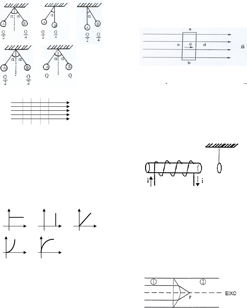 Prof. Giovani Soares 1 1- (PEIES 97) Dispõe-se de três esferas metálicas idênticas e isoladas umas das outras. Duas delas, “A” e “B”, estão eletricamente neutras e suspensas por fios isolantes presos em um mesmo ponto; a terceira, a esfera “C”, contém uma carga elétrica “Q”. Faz-se a esfera “C” tocar primeiro a esfera “A” e depois a esfera “B”. No final do procedimento, “A” e “B” assumem as posições e cargas indicadas por: a) b) c) d) e) 2- (PEIES 97) V1 V2 V3 V4 d d d A figura representa linhas de força de um campo elétrico uniforme e quatro superfícies equipotenciais separadas pela mesma distância “d”. Uma carga “+Q” deslocada nesse campo ganhará mais energia potencial eletrostática, ao ser movimentada de: a) V1 para V3 b) V2 para V4 c) V4 para V2 d) V4 para V1 e) V3 para V1 3- (PEIES 97) Qual dos gráficos de diferença de potencial “V” versus corrente elétrica “i” (V x i) a seguir representa um resistor que obedece à lei de Ohm? a) V b) V c) V 0 i 0 i 0 i d) V e) V 0 i 0 i 4- (PEIES 97) Analisando as afirmações a seguir, referentes a um circuito contendo três resistores de resistências diferentes, associados em paralelo e submetidos a uma certa diferença de potencial, indique se são verdadeiras (V) ou falsas (F). ( ) A resistência do resistor equivalente é menor do que a menor das resistências dos resistores do conjunto. ( ) A corrente elétrica é menor no resistor de maior resistência. ( ) A potência elétrica dissipada é maior no resistor de maior resistência. A seqüência correta é: a) F – V – F b) V – V – F c) V – F – F d) F – F – V e) V – V – V 5- (PEIES 97) A figura mostra uma chapa condutora de lados a, b, c, d deslocando-se para a direita, com velocidade v , num campo magnético uniforme B . Os elétrons livres da chapa sofrem a ação de uma força: a) no sentido de a para b b) no sentido de b para a c) no sentido de c para d d) no sentido de d para c e) nula 6- (PEIES 97) A figura representa um solenóide e um anel metálico em repouso, suspenso por um fio isolante. Quando a corrente “i” no solenóide for: a) constante, a corrente induzida no anel é constante b) aumentando, a corrente induzida no anel vai aproximar o anel do solenóide c) aumentando, a corrente induzida no anel vai manter o anel em sua posição d) diminui, a corrente induzida no anel vai afastar o anel do solenóide e) aumentando, a corrente induzida no anel vai afastar o anel do solenóide 7- (PEIES 97) Prof. Giovani Soares 2 Os meios 1 e 2 da figura estão separados por uma lente plano-convexa de vidro cujo índice de refração é 1,5. Quando os meios 1 e 2 forem o ar, de índice de refração 1,0, o feixe de luz, paralelo ao eixo da lente que incide a partir do meio 1, converge para o foco “F”, no meio 2. Se um dos meios for substituído por água, com índice de refração 1,3, pode-se afirmar que: a) com água em 1 e ar em 2, F se afasta da lente b) com água em 1 e ar em 2, F se aproxima da lente c) com água em 1 e ar em 2, F não se altera d) com ar em 1 e água em 2, F não se altera e) com ar em 1 e água em 2, F se aproxima da lente 8- (PEIES 97) A luz é uma onda ______ , e o fenômeno da difração em uma fenda simples é nítido, quando a largura da fenda é ________ comprimento de onda. Marque a alternativa que completa corretamente as lacunas: a) longitudinal – independente do b) longitudinal – da ordem do c) longitudinal – muito maior que o d) transversal – da ordem do e) transversal – independente do 9- (PEIES 98) O princípio da conservação da carga elétrica estabelece que: a) cargas elétricas de mesmo sinal se repelem b) cargas elétricas de sinais opostos se atraem c) a soma das cargas elétricas é constante em um sistema eletricamente isolado d) a soma das cargas elétricas positivas e negativas é diferente de zero em um sistema eletricamente neutro e) os elétrons livres se conservam 10- (PEIES 98) Dois condutores A e B esféricos, de raio RA e RB (RB>RA), encontram-se no mesmo meio, estando A eletrizado com uma carga Q e sendo B neutro. Ligando- se os dois através de um fio condutor, pode-se afirmar que, no estado estacionário: a) VA = VB, QA = QB b) VA = VB, QA < QB c) VA < VB, QA < QB d) VA < VB, QA > QB e) VA > VB, QA > QB 11- (PEIES 98) Corrente elétrica, em um condutor metálico, é o movimento: a) desordenado dos portadores de carga elétrica, independente do campo elétrico aplicado b) ordenado dos portadores de carga elétrica, sendo o fluxo dos portadores, num determinado sentido, espontâneo c) ordenado dos portadores de carga elétrica, sendo o fluxo dos portadores, num determinado sentido, independente do campo elétrico aplicado d) ordenado dos portadores de carga elétrica, sendo o fluxo dos portadores, num determinado sentido, dependente do campo elétrico aplicado e) instantâneo dos portadores de carga elétrica, sendo o fluxo dos portadores, num determinado sentido, dependente do campo elétrico aplicado 12- (PEIES 98) O circuito mostra 5 resistores R1, R2, R3, R4 e R5, percorridos, respectivamente, pelas correntes i1, i2, i3, i4 e i5, nos sentidos indicados pelas flechas. Sendo i2 = i5 = 2A e i4 = 4A, as correntes i1 e i3 valem, em A, respectivamente: a) 2, 6 b) 2, 4 c) 6, 8 d) 4, 6 e) 6, 4 13- (PEIES 98) Uma carga elétrica positiva e uma negativa, indicadas por + e – respectivamente, entram, da esquerda para a direita, no plano da página, com uma velocidade constante, em uma região do campo magnético uniforme H perpendicular ao plano da página. Ignorando a interação das cargas elétricas, a figura que representa as trajetórias (linhas tracejadas) das cargas, na região do campo, é: Prof. Giovani Soares 3 14- (PEIES 98) Um transformador é constituído por duas bobinas enroladas sobre um mesmo núcleo de ferro. A corrente _______ que circula na bobina primária, gera um campo magnético ________. Na bobina secundária, co