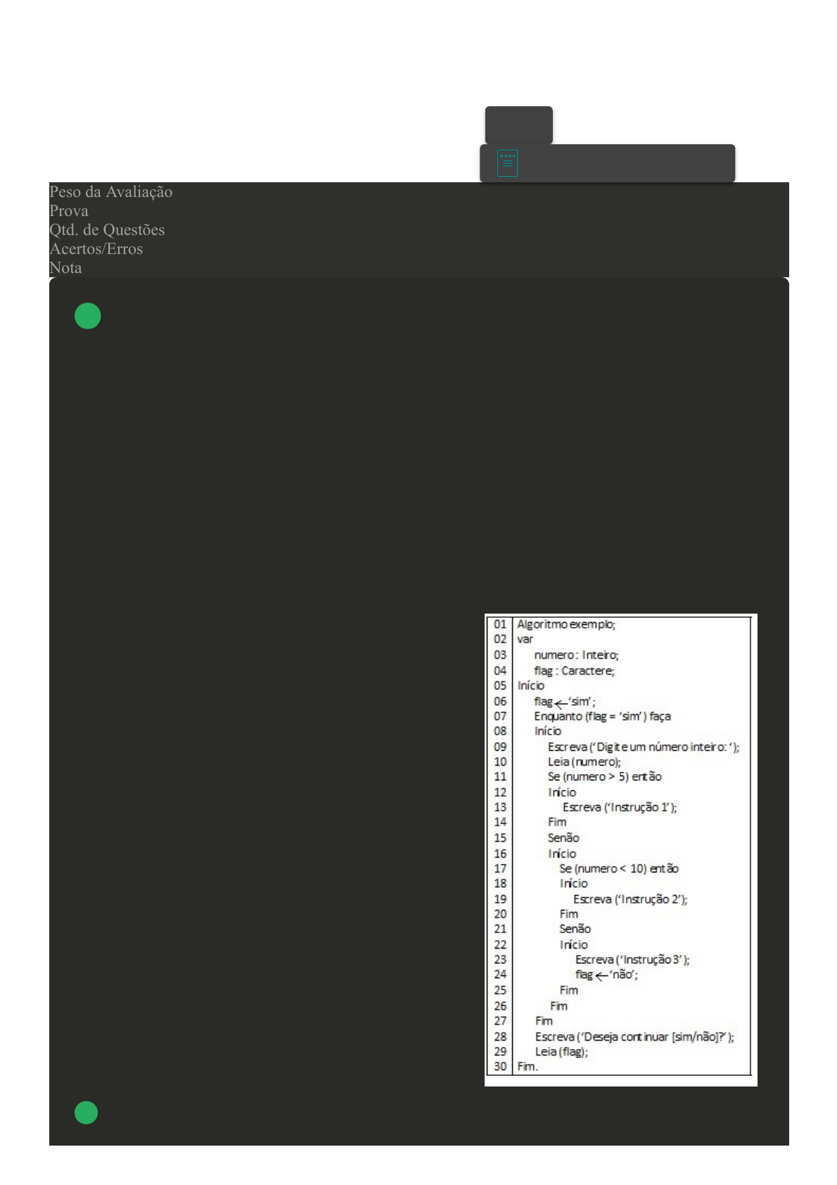 08/07/2022 13:52 Avaliação Final (Objetiva) - Individual about:blank 1/5 Prova Impressa GABARITO | Avaliação Final (Objetiva) - Individual (Cod.:745364) Peso da Avaliação 3,00 Prova 51464678 Qtd. de Questões 10 Acertos/Erros 8/2 Nota 8,00 O desenvolvimento de um algoritmo requer do desenvolvedor o conhecimento acerca de diversos conceitos e comandos, os quais permitirão que as instruções ali constantes retornem os resultados esperados na resolução do problema inicial. Dentre os principais comandos, destacam-se: a atribuição de valores às variáveis, a comparação entre valores, as estruturas de seleção e repetição, entre outros. Com base nisso, classifique V para as sentenças verdadeiras e F para as falsas: ( ) Qualquer valor menor do que 10 atribuído à variável número possibilitará a impressão da instrução 2. ( ) A impressão da instrução 3 será exibida apenas se o valor atribuído à variável número for maior do que 10. ( ) Para finalizar o algoritmo, o flag deverá receber o valor ‘não’. ( ) A instrução 2 será exibida se o valor atribuído à variável número for menor ou igual a 5 e menor do que 10. ( ) A instrução 1 será exibida se o valor atribuído à variável número for maior ou igual a zero e menor do que 5. Assinale a alternativa que apresenta a sequência CORRETA: A F - F - F - V - F. VOLTAR A+ Alterar modo de visualização 1 08/07/2022 13:52 Avaliação Final (Objetiva) - Individual about:blank 2/5 B V - V - V - F - F. C F - V - F - V - V. D V - F - V - F - V. Toda linguagem de programação possui uma sintaxe, que é o conjunto de regras que definem as sequências corretas dos elementos de uma linguagem de programação. Na pseudolinguagem portugol não é diferente, já que apresenta várias regras de escrita para o seu desenvolvimento. Com base nisso, analise as sentenças a seguir: I- Ao criar um identificador, pode-se fazer uso do underline e caracteres especiais, como @ e #. II- Com o objetivo de identificar que uma instrução foi finalizada, deve-se utilizar o ponto final. III- Ao utilizar variáveis, estas deverão ser declaradas no início do algoritmo, definindo-se o tipo de dados que cada uma suportará. IV- A atribuição de valores às variáveis é realizada através de um operador de atribuição, que no caso da pseudolinguagem portugol é representado pelo sinal <. V- O valor numérico ‘10’, por estar delimitado por apóstrofos, não poderá ser atribuído a uma variável do tipo Inteiro. Assinale a alternativa CORRETA: A As sentenças III e V estão corretas. B As sentenças I, III e V estão corretas. C As sentenças II e III estão corretas. D As sentenças I, IV e V estão corretas. As filas são estruturas de dados semelhantes às listas ligadas, porém com algumas limitações relacionadas às operações que podem ser realizadas sobre elas. Outra característica relevante das filas é sua arquitetura do tipo FIFO (First in - First out), em que o primeiro elemento que foi inserido na fila é o primeiro a ser retirado dela. Considerando as propriedades das filas, classifique V para as sentenças verdadeiras e F para as falsas: ( ) Um exemplo de utilização de filas na computação são as filas de impressão. ( ) Não há diferenças significativas na operação de remoção de itens nas estruturas de dados fila e lista. ( ) A fila possui como característica relevante um elemento de controle, que é conhecido como topo. ( ) Remover, adicionar e verificar se determinada estrutura de dados está vazia são operações que podem ser realizadas com as filas. Assinale a alternativa que apresenta a sequência CORRETA: A V - F - F - V. B V - V - F - F. C F - F - V - V. 2 3 08/07/2022 13:52 Avaliação Final (Objetiva) - Individual about:blank 3/5 D F - V - F - V. Os algoritmos podem ser representados de diferentes formas, a variação entre elas está relacionada ao nível de detalhe ou ao grau de abstração oferecido por cada uma. Algumas formas têm foco no nível lógico, de forma a abstrair detalhes de implementação. No entanto, algumas formas de representação possuem maior riqueza de detalhes. Com base no que são pseudocódigos, assinale a alternativa CORRETA: A É a construção de algoritmos com representações gráficas e codificação. B É a construção de algoritmos em linguagem natural em texto plano. C É a construção de algoritmos com diagramas de chapin. D É a construção de algoritmos com representações semelhantes as que programas são escritos. Existem no total cinco gerações de computadores conhecidas até a presente data. Cada geração tem sido discutida em detalhes, juntamente com o seu período de tempo e características. Em face a este contexto, analise as sentenças a seguir: I- A primeira geração é marcada pelos tubos a vácuo. II- A segunda geração é marcada pelos transistores. III- A terceira geração é marcada pelos circuitos integrados. IV- A quarta geração é marcada pelo avanço da inteligência artificial. Assinale a alternativa CORRETA: A As sentenças I, II e IV estão corretas. B As sentenças I, II e III estão corretas. C As sentenças I, III e IV estão corretas. D As sentenças II e IV estão corretas. Arquiteturas de computadores, em geral, têm evoluído progressivamente com maior complexidade, como maiores conjuntos de instruções, mais modos de endereçamento, muito mais poder computacional das instruções individuais, mais registros especializados, e assim por diante. Sobre conjunto de instruções, assinale a alternativa CORRETA que apresenta um conjunto de instruções complexas: A CISC. B CRISC. C Pipelining. 4 5 6 08/07/2022 13:52 Avaliação Final (Objetiva) - Individual about:blank 4/5 D RISC. Com relação à transmissão de dados em uma determinada rede de computadores, os sinais em específico podem ser compreendidos como ondas que são propagadas através de algum meio físico, o qual pode ser um cabo, o ar ou outros meios d