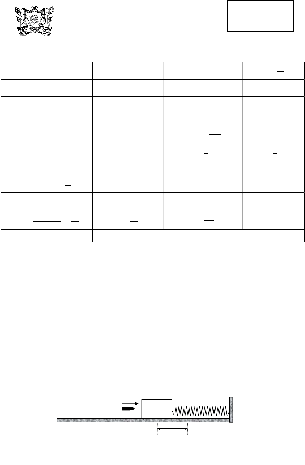 Formulário Use 𝑔 = 10 m/s 𝑟(𝑡) = 𝑥(𝑡)𝚤̂ + 𝑦(𝑡)𝚥̂ 𝑣 (𝑡) = 𝑣 + 𝑎 𝑡 �⃗�(𝑡) = 𝑎 (𝑡)𝚤̂ + 𝑎 (𝑡)𝚥̂ 𝑣 = ∆𝑥 ∆𝑡 𝑥(𝑡) = 𝑥 + 𝑣 𝑡 + 𝑎 𝑡 𝑊 = −∆𝑈 𝑣 = 𝑣 + 2𝑎 (𝑥 − 𝑥 ) 𝑎 = ∆𝑣 ∆𝑡 �⃗�(𝑡) = 𝑣 (𝑡)𝚤̂ + 𝑣 (𝑡)𝚥̂ 𝑈 = 𝑘𝑥 𝑊 = ∆𝐸 𝑊 = −∆𝑈 𝑈 = 𝑚𝑔𝑦 + 𝑘𝑥 𝐹 = 𝑚𝑎 𝑊 = 𝐹 𝑑 𝑐𝑜𝑠𝜃 𝑣 = 2𝜋𝑅/𝑇 𝑎 = 𝜔 𝑟 = 𝑣 𝑟 �⃗� = 𝑑�⃗� 𝑑𝑡 = 𝑚�⃗� 𝑣 = 𝜔𝑟 = 2𝜋𝑅 𝑇 𝑊 = 𝐾 − 𝐾 𝐹 = 𝑚𝜔 𝑅 = 𝑚 𝑣 𝑅 𝐼 = ∑ 𝑚 𝑟 𝐾 = 1 2 𝑚𝑣 𝐾 = 1 2 𝐼𝜔 𝐸 = 𝑈 + 𝑈 + 𝐾 𝐽 = �⃗� (𝑡 − 𝑡 ) 𝐽 = ∫ �⃗� 𝑑𝑡 𝐽 = 𝑝 − 𝑝 �⃗� = ∑ �⃗� = ⃗ 𝐼 = 𝐼 + 𝑀𝑑 �⃗� = 𝑚�⃗� 𝑃 = �⃗� + 𝑝 + ⋯ 𝜃(𝑡) = 𝜃 + 𝜔 , 𝑡 + 1 2 𝛼 𝑡 𝜔 , = ∆𝜃 ∆𝑡 𝛼 , = ∆ ∆ 𝜔 = 𝜔 , + 𝛼 𝑡 𝜔 , = 𝜔 , + 𝜔 2 = ∆𝜃 ∆𝑡 𝜔 = 𝑑𝜃 𝑑𝑡 𝛼 = 𝑣 = 𝜔 𝑟 𝜔 = 𝜔 + 2𝛼 (𝜃 − 𝜃 ) 𝑠 = 𝑟𝜃 𝑎 = 𝑟𝛼 Questão 1) Um motorista que atende a uma chamada de celular é levado à desatenção, aumentando a possibilidade de acidentes ocorrerem em razão do aumento de seu tempo de reação. Considere dois motoristas, o primeiro atento e o segundo utilizando o celular enquanto dirige. Eles inicialmente aceleram seus carros a 1,40 m/s . Em resposta a uma emergência, freiam com uma desaceleração igual a 4,00 m/s . O motorista atento aciona o freio à velocidade de 18,0 m/s, enquanto o desatento, em situação análoga, leva 1,2 s a mais para iniciar a frenagem. Que distância o motorista desatento percorre a mais do que o motorista atento, até a parada total dos carros? Questão 2) Um projétil de massa 𝑚 atinge e se engasta num bloco de madeira de massa 𝑀 que está em repouso numa superfície horizontal, preso a uma mola em espiral cuja constante elástica é 𝑘. O impacto produz uma compressão máxima na mola igual a 𝑥. O coeficiente de atrito cinético entre o bloco e a superfície é 𝜇 . Determine (a) a velocidade do bloco imediatamente após a colisão e (b) a velocidade inicial do projétil. Expresse suas respostas em termos das grandezas 𝑚, 𝑀, 𝑔, 𝜇 , 𝑘 e 𝑥 que se fizerem necessárias. UNIVERSIDADE FEDERAL DE VIÇOSA DEPARTAMENTO DE FÍSICA – CCE PROVA FINAL DE FIS 191 – PHT – 7/4/2022 NOTA (100) x m M Questão 3) Uma casca esférica uniforme, de massa 𝑀 = 3𝑚/2 e raio 𝑅 , pode girar em torno um eixo vertical sem atrito (veja a figura). Uma corda, de massa desprezível, passa em volta do equador da esfera e prende um pequeno bloco de massa 𝑚, após passar por uma polia de massa 𝑀 = 2𝑚 e raio 𝑅 . O atrito da polia em relação ao eixo é nulo e a corda não desliza na polia. A aceleração da gravidade local vale 𝑔. Determine a velocidade do bloco, depois de descer uma distância ℎ, partindo do repouso. Resposta em função de 𝑔 e ℎ. Momento de inércia de uma casca esférica: 2 3 2 mrICM Momento de inércia da polia: 2 2 1 mrICM Questão 4) Uma bola de massa 𝑚, amarrada a um fio de comprimento 𝐿, é solta quando está na horizontal, conforme representado na figura abaixo. Ao chegar na posição mais baixa, a bola choca-se com um bloco de massa 𝑀 e ambos permanecem grudados após o choque. A aceleração da gravidade local vale 𝑔. a) O momento linear do sistema bola-bloco se conserva enquanto a bola desce? Justifique. b) O momento linear do sistema bola-bloco se conserva durante o choque? Justifique. c) A energia mecânica é a mesma antes e depois do choque? Justifique. A que altura o conjunto bola-bloco subirá após o choque? Justifique. IP , MP , RP m IC , MC , RC h m M