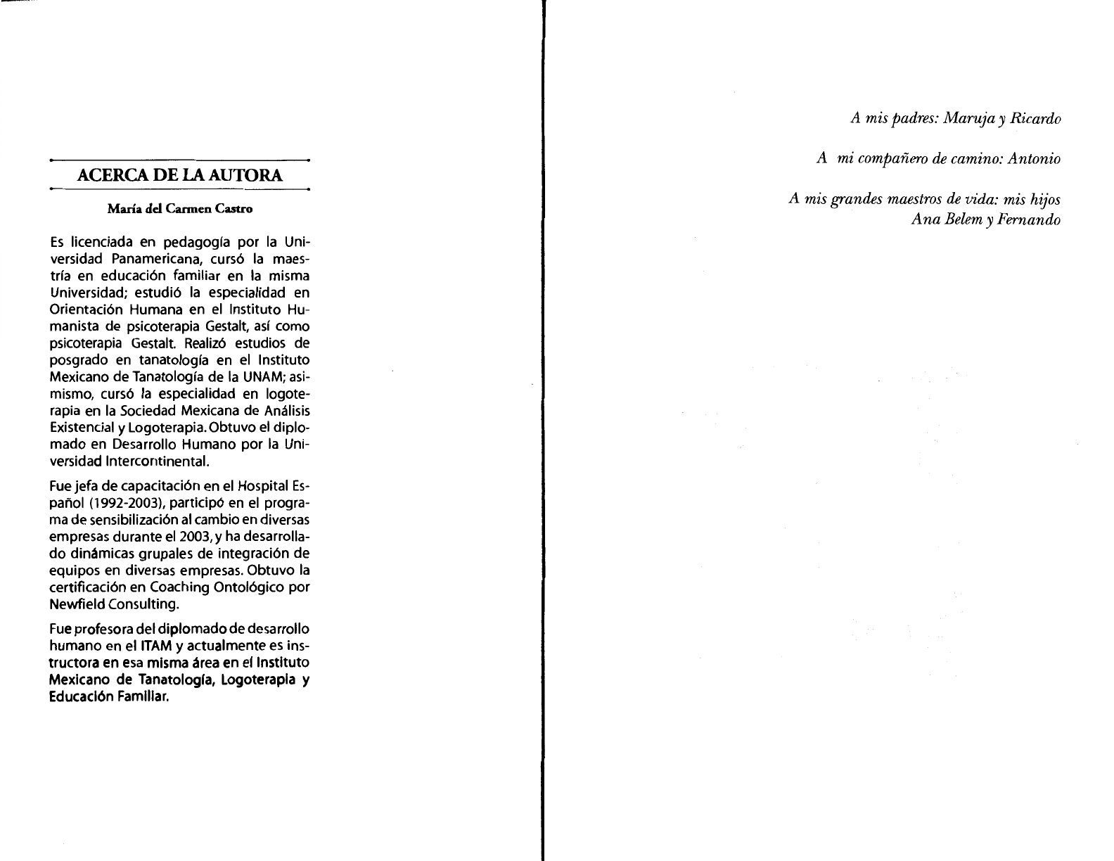 ACERCA DE LA AUTORA María dd Cannen Castro Es licenciada en pedagogía por la Uni- versidad Panamericana, cursó la maes- tría en educación familiar en la misma Universidad; estudió la especialidad en Orientación Humana en el Instituto Hu- manista de psicoterapia Gestalt, así como psicoterapia Gestalt. Realizó estudios de posgrado en tanatología en el Instituto Mexicano de Tanatología de la UNAM; asi- mismo, cursó la especialidad en logote- rapia en la Sociedad Mexicana de Análisis Existencial y Logoterapia. Obtuvo el diplo- mado en Desarrollo Humano por la Uni- versidad lntercontinental. Fue jefa de capacitación en el Hospital Es- pañol (1992-2003), participó en el progra- ma de sensibilización al cambio en diversas empresas durante el 2003, y ha desarrolla- do dinámicas grupales de integración de equipos en diversas empresas. Obtuvo la certificación en Coaching Ontológico por Newfield Consulting. Fue profesora del diplomado de desarrollo humano en el ITAM y actualmente es ins- tructora en esa misma área en el Instituto Mexicano de Tanatologfa, Logoterapla y Educación Familiar. A mis padres: Maruja y Ricardo A mi compañero de camino: Antonio A mis grandes maestros de vida: mis hijos Ana Belem y Fernando " TANATOLOGIA LA INTELIGENCIA EMOCIONAL Y EL PROCESO DE DUELO 2a. edición María del Carmen Castro González EDITORIAL ~J¡~1 TRILLAS '-\'VI México, Argentina, España, Colombia, Puerto Rico, Venezuela ® Catalogación en la fuente Castro González, María del Carmen Tanatología : la inteligencia emocional y el proceso de duelo. -- 2a ed. --México: Trillas, 2007 (reimp. 2013). 180 p. : il.; 23 cm. Bibliografía: p. 171-172 Incluye índices ISBN 978-968-24-8014-0 l. Muerte- Meditaciones. 2. Terapia sugestiva. l. t. D- 615.851 'Cl35t La presentación y disposición en conjunto de TANATOLOGÍA. La inteligencia emocional y el proceso de duelo son propiedad del editor. Ninguna parte de esta obra puede ser reproducida o trasmitida, mediante ningún sistema o método, electróAico o mecánico (incluyendo el fotocopiado, la grabación o cualquier sistema de recuperación y almacenamiento de información), sin consentimiento por escrito del editor Derechos reservados © SM, 2007, Editorial Trillas, S. A. de C. V. División Administrativa, Av. Río Churubusco 385, Col. Gral. Pedro María Anaya, C. P. 03340, México, D. F. Tel. 56884233, FAX 56041364 churubusco@trillas.mx LC- RC490'C3.8 4286 División LDgística, Calzada de la Viga 1132, C. P. 09439, México, D. F. Tel. 56330995, FAX 56330870 laviga@trillas. mx !lJ Tienda en línea www.trillas.mx www.etrillas.mx Miembro de la Cámara Nacional de la Industria Editorial Reg. núm. 158 Primera edición 3-SM ISBN 968-24-7319-5 ~(9-SM) Segunda edición SE ISBN 978-968-24-8014-0 ~(SX, TS, TT, TR) Reimpresión, marzo 2013 Impreso en México Printed in Mexico ~· " --,, . ; 1~¡/,t~' 11"11!'•"'"~¡¡¡, ....... ;~ ' ~. ~ '': ,¡~11 ,, Es para mí un honor ser partícipe de este libro. Me da mucho gusto que una persona se involucre, como lo ha hecho Mary Car- men, en el tema de la tanatología y logre el manejo del duelo a partir de la inteligencia emocional. Tanto el tema de la tanatología como el conocimiento de la In- teligencia Emocional son relativamente recientes, por lo que resulta muy interesante, por un lado, el conocimiento y planteamiento de la tanatología y, por el otro, de la inteligencia emocional, así como la interacción entre ambos que logra plantear la autora. Hace algunos años conocí a Mary Carmen como mi alumna en el Diplomado en tanatología. Posteriormente, se convirtió en docente del mismo. Me llena de alegría que actualmente incursione en la escritura y aborde la tanatología desde el punto de vista de la inte- ligencia emocional. Estoy convencida que este libro resultará una herramienta fun- damental para las personas que, por distintas razones, necesitan co- nocer y descubrir el sentido de la tanatología, ya sea por crecimien- to personal, para enfrentar una pérdida, manejar una enfermedad (propia o de un ser querido), apoyar a un ser amado a lo largo de una enfermedad terminal, enfrentar un duelo personal o simplemente, por el deseo de conocer el manejo del duelo desde el punto de vista de la inteligencia emocional o de apoyar a otras personas. El ser humano tiene una gran resistencia al dolor. El sufrimien- to lo inquieta, lo altera y casi siempre quiere alejarse de éste, sin considerar que al conocerlo, enfrentarlo y asumirlo, aprenderá a manejarlo. 5 6 Prólogo En este libro, la autora aborda el sentido del dolor al duelo, a través de la inteligencia emocional, con un lenguaje sencillo, claro, comprensible, asequible para todos; de una manera práctica, basa- da en su experiencia personal como docente y terapeuta en México. Esto lo vuelve más valioso, ya que la mayoría de los estudios sobre tanatología han sido escritos para otras culturas, en otros países. Las pruebas o tests psicológicos que sugiere la autora pueden ser aplicados en casa; no es necesaria la ayuda de profesionales en psicología; con ellos se pretende conocer e identificar ciertos rasgos y descubrir habilidades y características que ayudarán al lector a manejar sus relaciones personales y familiares de manera diferente y a elaborar distintos duelos. Como bien menciona la autora, es importante conocer cómo en- frentar el sufrimiento y entender que cada vez que el ser humano lleva a cabo una acción, ésta modifica su realidad. A través de la inteligencia y la voluntad, el hombre tiene la ca- pacidad de resolver los problemas que se le presentan, entre ellos, la muerte propia y de los seres amados. Por eso la autora, al relacio- nar la tanatología con la inteligencia emocional, nos proporciona una herramienta invaluable para enfrentar y manejar las pérdidas. El ser humano necesita aprender a elaborar los duelos. Y la au- tora contribuye a este aprendizaje al proporcionar una educación distinta en relación co