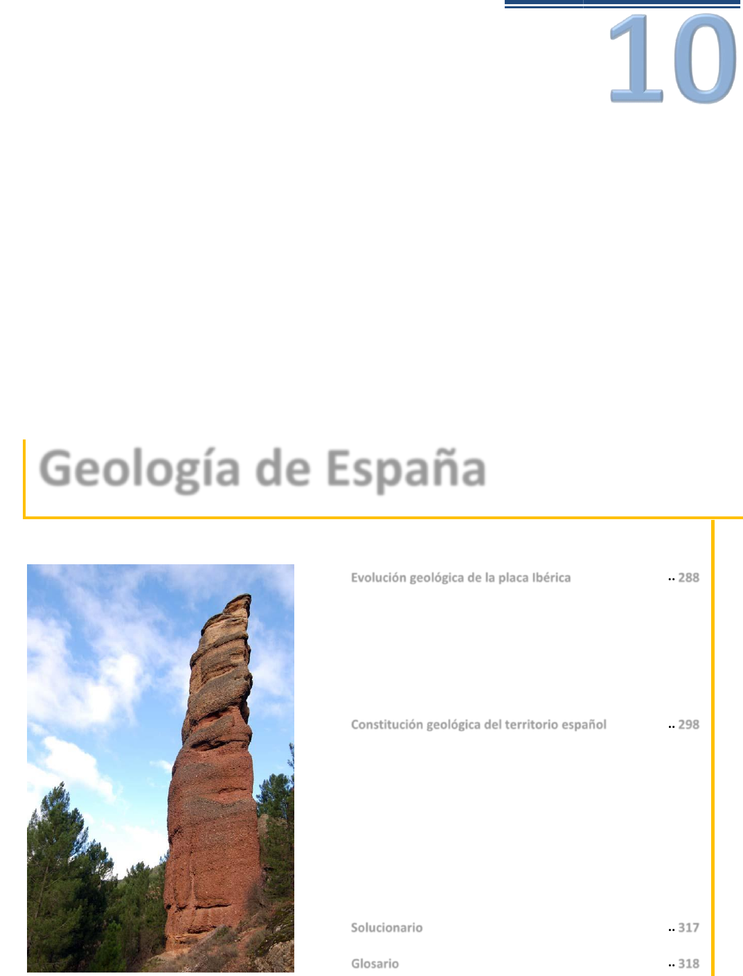 UNIDAD Geología de España La historia geológica de España, tanto de la península como de los archipiélagos, es muy compleja, aflorando abundantes terrenos premesozoicos que nos revelan la existencia de restos de un antiguo continente que sufrió los efectos de varios ciclos orogénicos con plegamientos, efectos de la tectónica de fractura, transgresiones, regresiones, etcétera. La geología de la península ibérica es el resultado de esa larga y compleja historia geológica, y por tal razón muestra retazos de los más diversos terrenos y que reflejan fusiones y roturas de continentes, apertura de océanos e importantes episodios orogénicos. Las huellas y cicatrices de esta historia configuran la corteza continental, y la estructura y naturaleza de las rocas ígneas, metamórficas y sedimentarias que componen la península así como los actuales relieves. ÍNDICE 1. Evolución geológica de la placa Ibérica ............................ 288 Precámbrico ................................................................... 288 Paleozoico ...................................................................... 289 Mesozoico ...................................................................... 293 Cenozoico ....................................................................... 295 2. Constitución geológica del territorio español ................... 298 Dominio hercínico: Macizo Ibérico ................................. 299 Áreas de plataforma poshercínica: cordilleras int. ......... 304 Dominio Alpino: Cordilleras Béticas ............................... 308 Dominio Alpino: Pirineos ............................................... 312 Cuencas cenozoicas ........................................................ 313 Archipiélago canario ...................................................... 316 3. Solucionario ..................................................................... 317 4. Glosario ........................................................................... 318 Unidad 10 Geología de España Evolución geológica de la placa Ibérica CIDEAD 288 1 Evolución geológica de la placa Ibérica La península Ibérica tiene una larga historia que comienza en el Precám- brico y se prolonga hasta nuestros días. Su evolución geológica ha estado li- gada a la del resto del continente europeo y a la del continente africano, y su desarrollo como terreno independiente es relativamente reciente, unos 100 millones de años (esto es, en el Cretácico). Las sucesivas orogenias que han actuado desde el Paleozoico, junto con los efectos de una serie de fenómenos tectónicos de reajuste y de desgaste ero- sivo, dieron lugar a la constitución geológica y orográfica actual. Precámbrico 4000 – 541 Ma Como hemos visto en la unidad anterior la historia de la península Ibérica comenzó pronto, allá por el Neoproterozoico —a finales del Precámbri- co—, cuando el supercontinente Pannotia se fue fragmentando rápidamente dando origen a Gondwana, Laurentia y Báltica. Entre ellos se formó el océano de Japeto, bajo cuyas aguas se hallarían algunos de los terrenos que constituirían la península Ibérica. Posteriormente parte de Gondwana se fragmentó dando lugar al terreno de Avalonia. Actualmente se encuentran terrenos precámbricos en Galicia y algunos aflo- ramientos en el Sistema Central y en los Montes de Toledo. Estos materiales sufrieron una serie de transformaciones, como erosión, plegamientos o sedimentación por transgresiones-regresiones. Por tal razón, los afloramientos precámbricos que aparecen son aislados y difíciles de dife- renciar de los paleozoicos con que aparecen relacionados. Zonas de la península Ibérica donde afloran los mate- riales precámbricos. En la imagen superior, Calizas dolomíticas con micro- fósiles de Cloudina del Neoproterozoico (542,3 – 548,8 millones de años). Se localiza en el Geoparque de Las Villuercas (Cáceres). En la imagen inferior, esquema que representa las principales estructuras geológicas de la península Ibérica. Unidad 10 Geología de España Evolución geológica de la placa Ibérica CIDEAD 289 Paleozoico 541,0 – 252,17 Ma Al comienzo del Cámbrico, la placa de Avalonia seguía separándose de Gondwana. Entre los dos continentes se localizó el océano Reico. En las plataformas continentales de Avalonia y de Gondwana podemos en- contrar parte de los terrenos actuales de la península Ibérica. Es posible que otros se encontrasen formando parte de Gondwana. A lo largo de este periodo tuvieron lugar varios periodos de transgresión- regresión. En los periodos cálidos (transgresivos), en la plataforma conti- nental se depositaron carbonatos y se desarrollaron arrecifes de arqueocia- tos, y un gran número de especies distintas (trilobites, braquiópodos, equi- nodermos, moluscos…) se desarrollaron gracias a las favorables condicio- nes. Los esqueletos de estos animales forman potentes series de calizas. Por el contrario, durante las regresiones las plataformas se llenaron con aportes continentales, principalmente arenas y lodos (sedimentos siliciclásti- cos), que posteriormente se metamorfizaron dando lugar a pizarras, en el caso de los sedimentos arcillosos, y a cuarcitas, en el caso de arenas. Actualmente podemos encontrar terrenos cámbricos en puntos de Galicia, Asturias, la cordillera Cantábrica, en algunas zonas del Pirineo, de la cordi- lleras Costero-Catalana y de la sierra de la Demanda (Burgos-Logroño); también en las provincias de Zaragoza y Teruel y Córdoba, así como en la Sierra de Gata (Almería), la Peña de Francia (Salamanca), Monfragüe (Cáce- res) y en los Montes de Toledo (Toledo y Ciudad Real). En el Ordovícico, las temperaturas cálidas provocan que haya importantes transgresiones marinas. En este ambiente, en el que se desarrollaron mares someros, la situación general de la península Ibérica no se modifica: los es- tratos de arena y lodo procedentes de la denudación de Gond