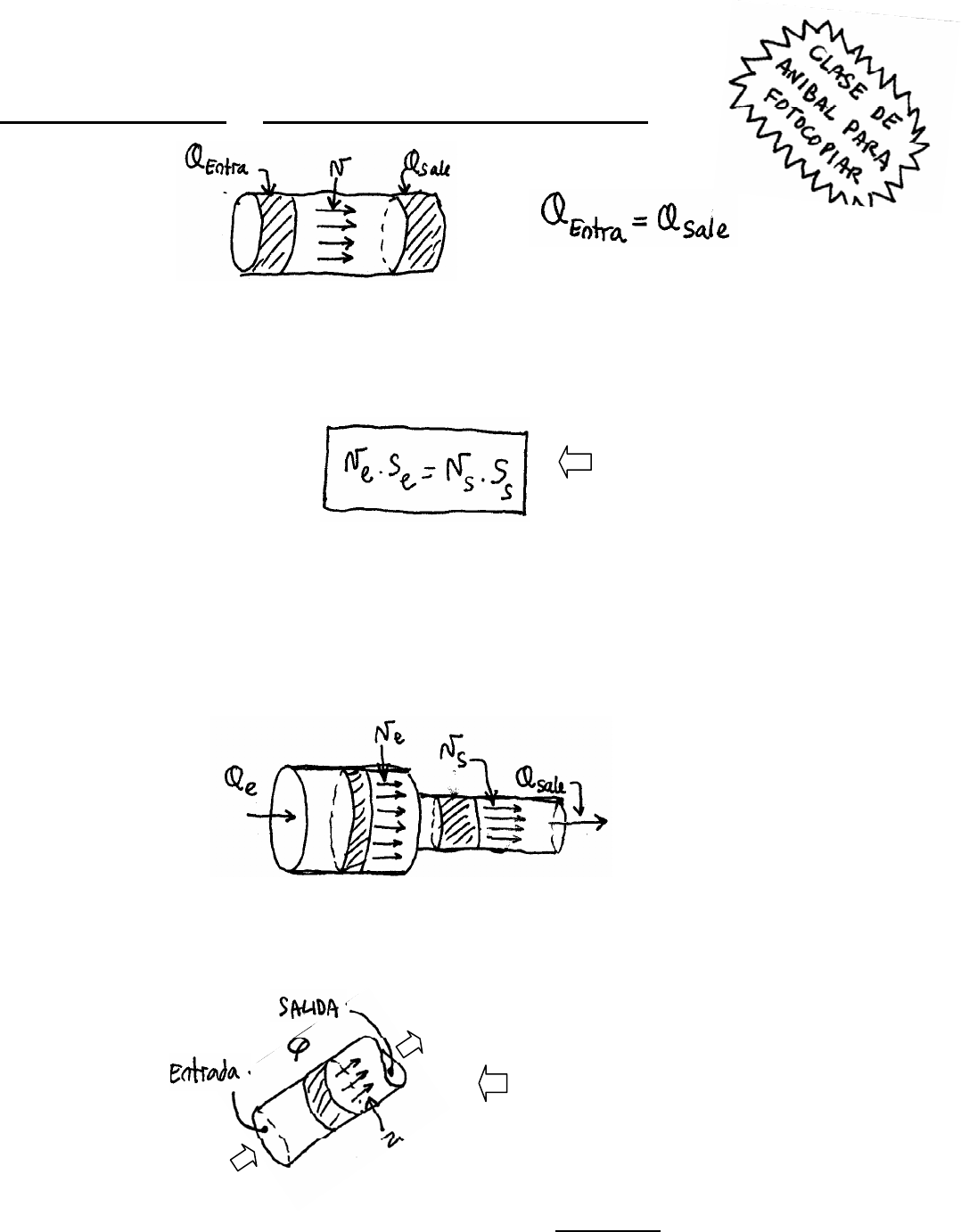 HIDRODINAMICA - ECUACION DE CONTINUIDAD Todo lo que entra, tiene que salir. Si entran 5 litros por minuto, tienen que estar saliendo 5 litros por minuto. El caudal que entra es igual al caudal que sale. Como al caudal lo puedo poner como Velocidad x Superficie, la fórmula que me queda es : En esta fórmula Ve es la velocidad del líquido a la entrada y Se es la sección ( = superficie ) del caño a la entrada. Lo mismo con VS y SS para la salida. El nombre " continuidad " significa algo así como que " el caudal siempre es continuo, no se interrumpe ". El asunto no cambia si el tubo se ensancha o se hace más angosto. Aunque el caño cambie su sección, siempre se cumple que todo lo que entra tiene salir. Lo mismo pasa si el tubo está inclinado o si está vertical. Esté como esté, todo lo que entra siempre es igual a lo que sale Resumiendo, la ecuación de Ve x Se = Vs x Ss se puede usar SIEMPRE . El tubo puede estar derecho o inclinado. Puede tener ensanchamientos o no. Incluso puede ser vertical. La ecuación de continuidad siempre es válida, sea el tubo que sea, sea el líquido que sea. ECUACION DE CONTINUIDAD LA ECUACION DE CONTINUIDAD TAMBIEN SIRVE SI EL TUBO ES VERTICAL O ESTÁ INCLINADO - 2 - TUBOS CON RAMIFICACIÓN A veces te pueden dar un tubo que se divide en dos. Esto es lo que pasa en las venas y en las arterias. Sería este caso : Acá también todo el caudal que entra tiene que ser el caudal que sale. O sea, Pregunta 1 : ¿ La suma de las 2 secciones de salida es igual a la sección de entrada ? Pregunta 2 : ¿ Puede ser que las velocidades de salida sean iguales ? ( Pensalo ) TUBOS CON MUCHAS RAMIFICACIONES A veces te pueden dar un tubo que se divide en muchos tubitos chiquitos. Esto es lo que pasa en los vasos capilares. Viene un vaso grande que se divide en muchos vasos chiquitos, Sería este caso: Si el tubo principal se divide en 8, entonces el caudal que entra tiene que ser igual a la suma de los 8 caudales que salen. Entonces el planteo sería: O sea: Otra: ¿ Las velocidades de salida serán todas iguales en cada tubito ? ¿ La suma de todas las secciones de la salida será igual a la sección de entrada ? - 3 - ECUACION DE BERNOULLI La ecuación de Bernoulli es la fórmula más importante de toda esta parte de hidrodiná- mica. Es la que más se usa y es la que trae más problemas. La fórmula completa para el caso general es: Esta fórmula es la ecuación de la conservación de la energía para el líquido que va dentro del tubo. Al plantear este choclazo, lo que uno plantea es la conservación de la energía. Conclusión: Bernoulli no se puede plantear si el líquido tiene viscosidad. La viscosidad es el rozamiento de los líquidos. Si hay rozamiento, la energía no se conserva. El significado de cada término de la ecuación es : 3 – Esta ecuación así como está se puede usar siempre que el líquido no tenga viscosidad. Sirve si el tubo es vertical, horizontal o si está inclinado. Una situación complicada que puede aparecer es tubo inclinado. Sería este caso: A su vez los tubos verticales o inclinados pueden cambiar de sección en el medio. O sea pueden cambiar de diámetro y hacerse más angostos o más anchos. Pent = Presión a la entrada. Va en Pascales = Newton /m2 Psal = Presión en la salida. Va en Pascales = Newton /m2 Delta: ( δ ) Es la densidad del líquido. Va en Kg/m3 Vent = Velocidad del líquido en la entrada. Va en m/s Vsal = Velocidad del líquido en la salida. Va en m/s g : Aceleración de la gravedad ( = + 10 m/s2 ) hent = Altura del líquido en la entrada. Va en m. hsal = Altura del líquido en la salida. Va en m. - 4 - ECUACION DE BERNOULLI PARA TUBOS HORIZONTALES Si el tubo está horizontal la ecuación se reduce un poco. Desaparecen los términos de la ecuación que tenían h. Esto pasa porque al ser el tubo horizontal, la altura en la entrada es igual a la altura en la salida. Entonces, para tubos horizontales la ecuación queda así : Se pueden poner las presiones del mismo lado de la ecuación. En ese caso la fórmula de Bernoulli queda : De las ecuaciones de continuidad y Bernoulli sacamos varias ideas importantes. Fijate : CONCEPTO UNO: A MAYOR SECCIÓN, MENOR VELOCIDAD De la ecuación de continuidad hago una deducción importante: si el valor VxS siempre se tiene que mantener constante, entonces donde el tubo sea más angosto LA VELOCIDAD SERÁ MAYOR. (Atento). Esto pasa porque el caudal que circula es constante. Entonces si el tubo se hace más angosto, para que pueda circular el mismo caudal, la velocidad de líquido tiene que aumentar. Exactamente lo contrario pasa si el caño se hace mas ancho. La velocidad del líquido tiene que disminuir para que pueda seguir pasando el mismo caudal. CONCEPTO DOS: A MAYOR VELOCIDAD, MENOR PRESIÓN Algo importante que se puede deducir de la ecuación de Bernoulli es que en el lugar donde la velocidad del líquido que circula sea mayor, la presión será menor. Aclaración importante: Esto pasa solo si el tubo es horizontal. ( Ojo). Es decir que si la velocidad a la salida aumenta, la presión en la salida va a disminuir. Este concepto de que " a mayor velocidad, menor presión " es bastante anti-intuitivo. Lo que termina pasando es al revés de lo que uno diría que tiene que pasar. Lo razonable sería - 5 - decir que " a mayor velocidad, mayor presión ". Pero no es así. Lo que ocurre en la realidad es lo contrario. Es decir, repito, a mayor velocidad, menor presión. CONCLUSIÓN: RECORDAR MAYOR VELOCIDAD MENOR PRESIÓN CONCEPTO TRES: A MAYOR SECCION, MAYOR PRESION Por un lado, a menor sección, mayor velocidad. ( Continuidad ). Por otro lado a mayor velocidad, menor presión. ( Bernoulli en tubos horizontales ). Uniendo estas 2 ideas en una sola, puedo decir que a menor sección, menor presión. O lo que es lo mismo, a mayor sección, mayor presión. Esta conclusión significa que donde mayor sea el diámetro del tubo, mayor va a ser la presión en el líquido que circula. ( Esto v